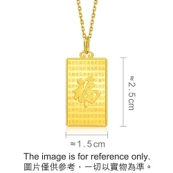 周生生足金吊墜以不同書法寫成的「百福圖」為設計元素,以油壓工藝精心打造。正面刻鑄百福圖,背面綴有祥雲龍圖騰,頂部採用如意祥雲扣,寓意百福齊聚、吉祥安康,滿載美滿祝福。
