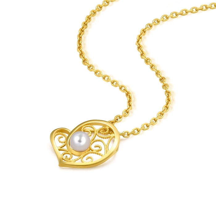 周生生足金心形吊墜,靈感來自印度奧裡薩(Orissa)鏤空工藝,打造出精緻的蕾絲圖案,中間綴以淡水養殖珍珠,散發幻彩光澤,高貴優雅。
