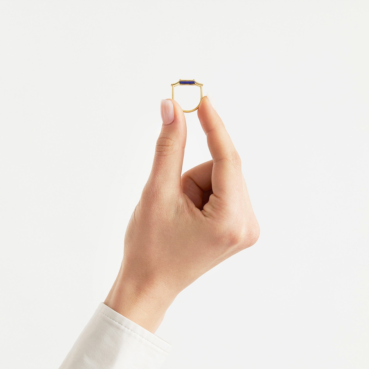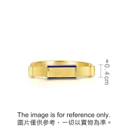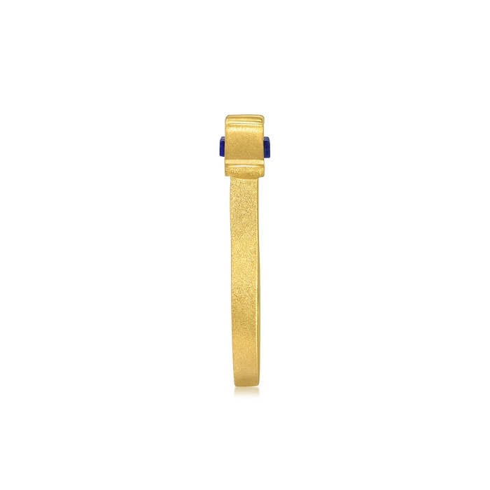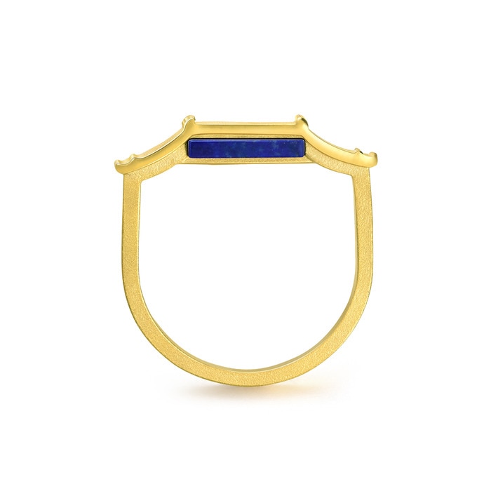 故宮宮廷文化g*系列足金青金石戒指,將宏偉的太和殿建築輪廓化為簡約脫俗的設計語言,經典再現「築」主題元素的雅致格調。工匠打造出飾品的造型,將古時飾品中象徵威嚴崇高的青金石,鑲嵌於太和殿輪廓的足金主軸上,巧妙糅合傳統文化韻味和現代設計,大氣恢宏,於金光燦燦的琉璃金頂中,盡顯皇家古雅氣派。