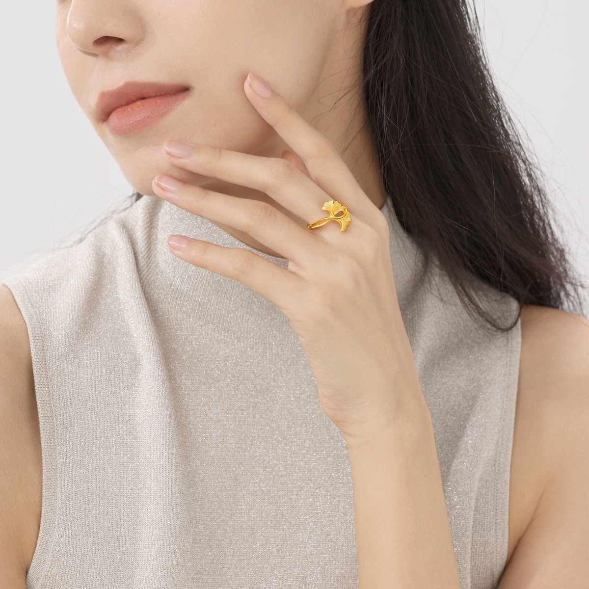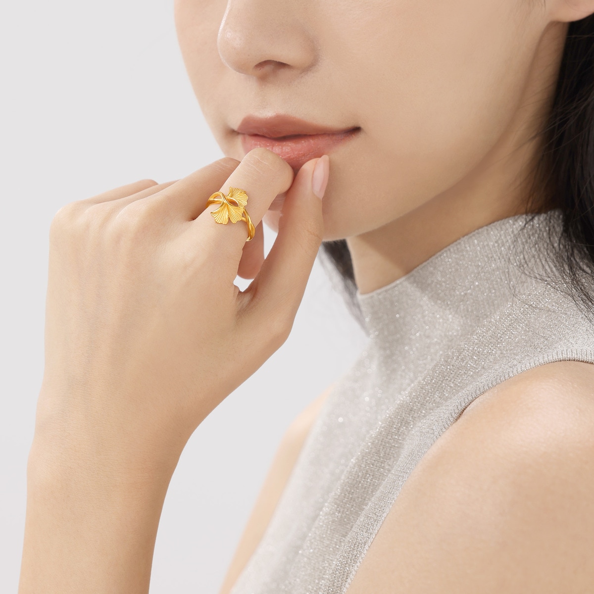 周生生戒指以寓意長壽的銀杏葉組成優美的扇型葉面造型,通過對稱的葉子呈現和諧的景象,祝福白頭到老。