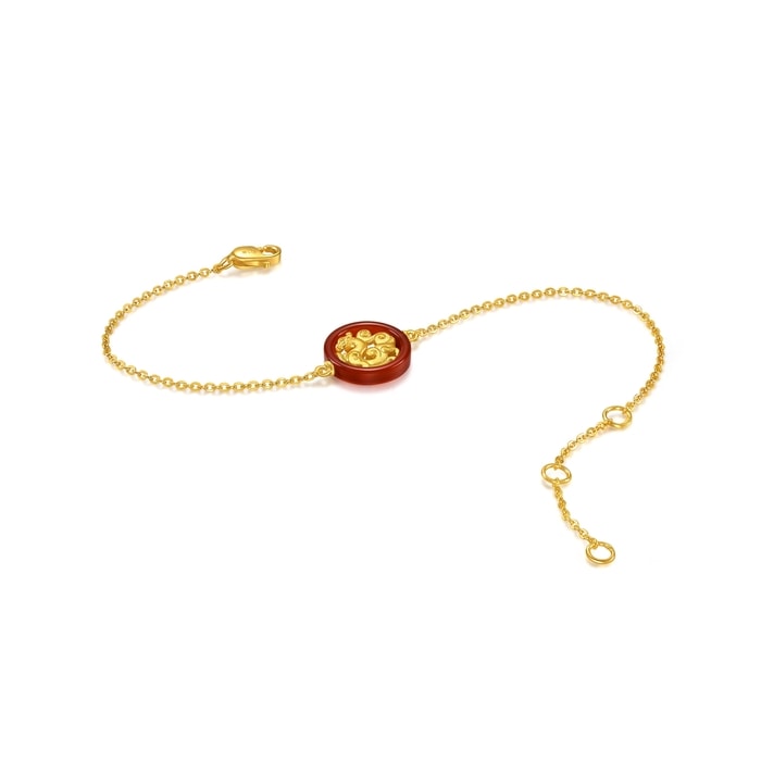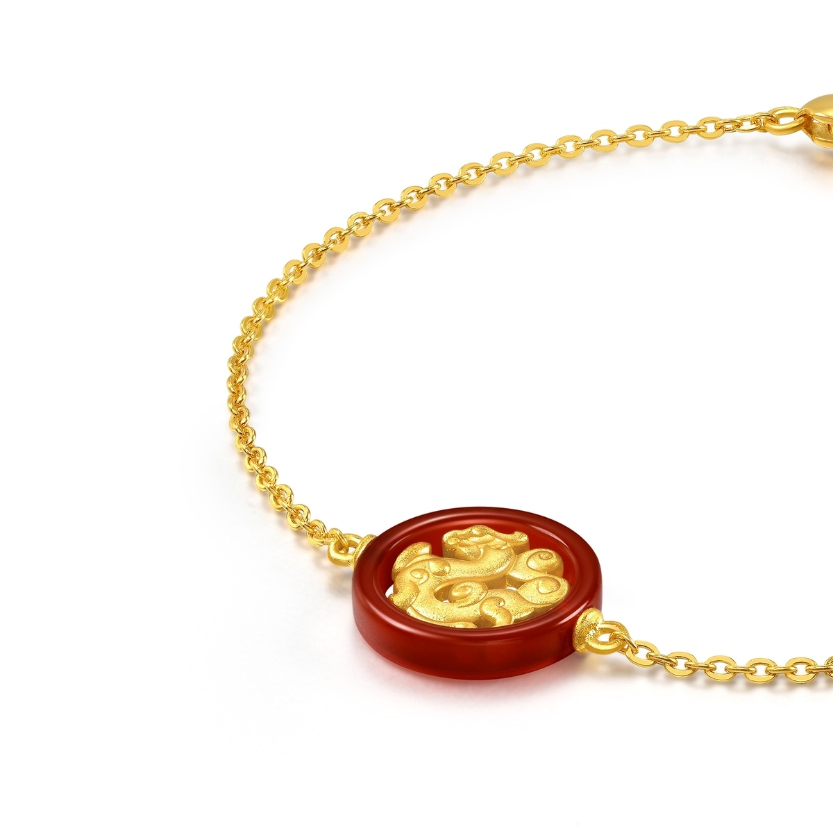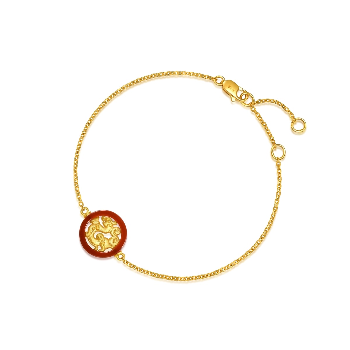 周生生足金手鍊設計靈感源自故宮博物院館藏文物【玉螭鳳雲紋璧】,巧以天然紅瑪瑙作圈環,環內以龍九子中的二子「螭龍」圖騰為造型,工藝精湛細膩,黃金與紅瑪瑙圈相互映襯,盡顯螭龍長尾卷垂之態,別具古樸質感,寓意吉祥、美好。