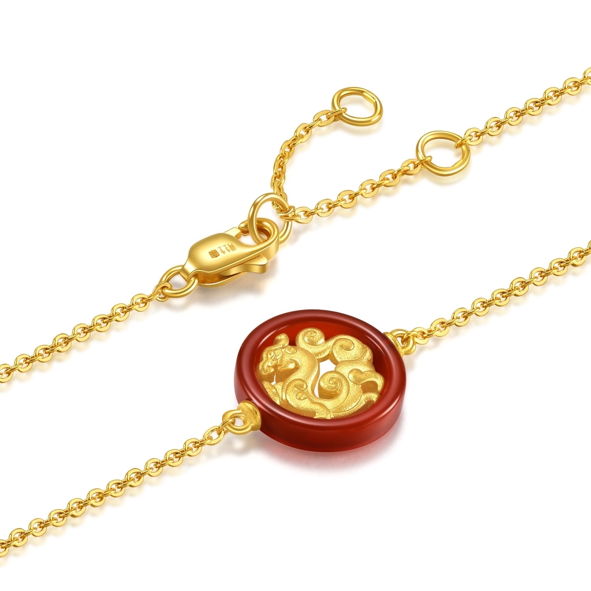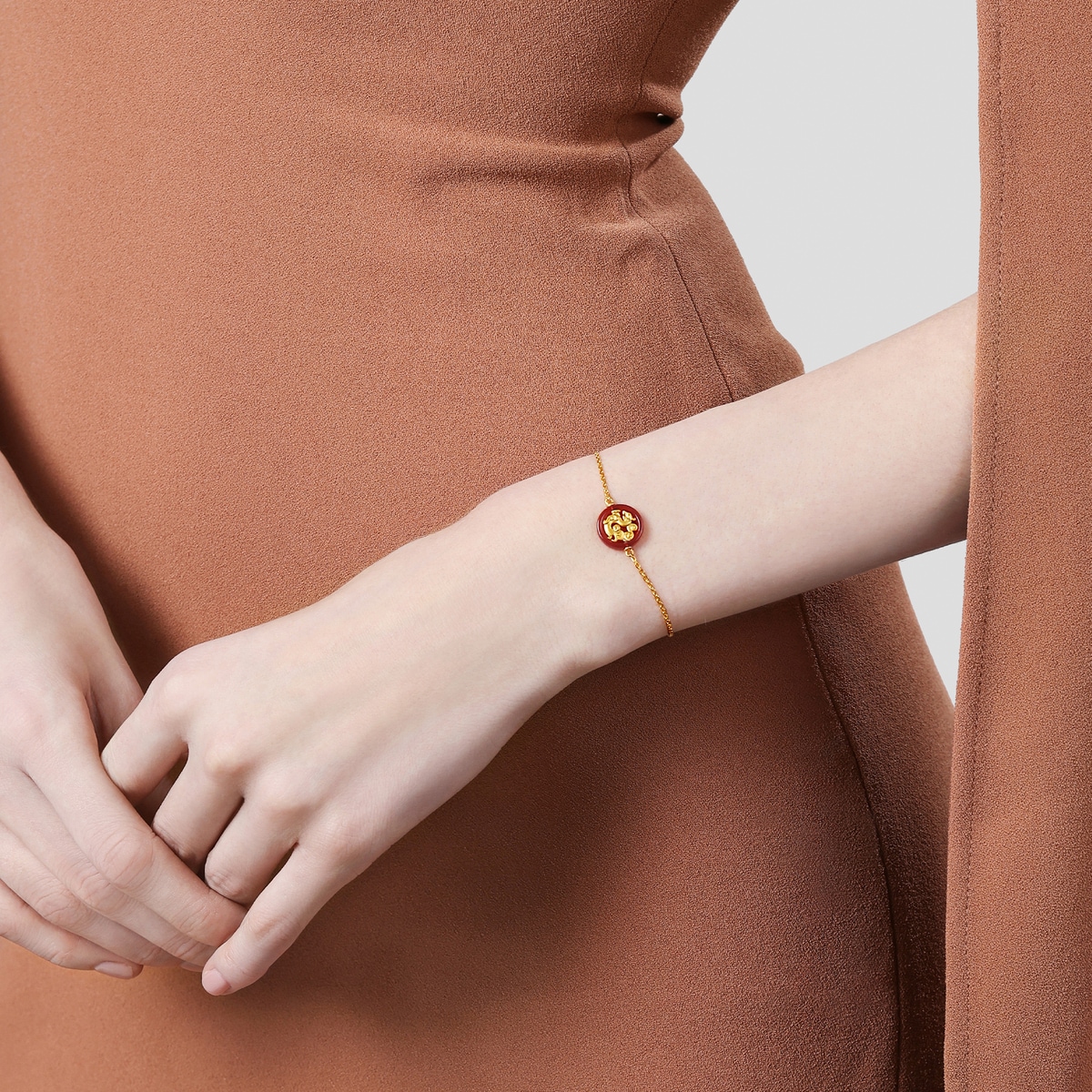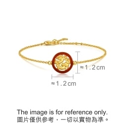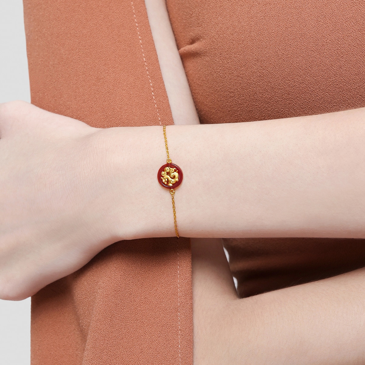 周生生足金手鍊設計靈感源自故宮博物院館藏文物【玉螭鳳雲紋璧】,巧以天然紅瑪瑙作圈環,環內以龍九子中的二子「螭龍」圖騰為造型,工藝精湛細膩,黃金與紅瑪瑙圈相互映襯,盡顯螭龍長尾卷垂之態,別具古樸質感,寓意吉祥、美好。