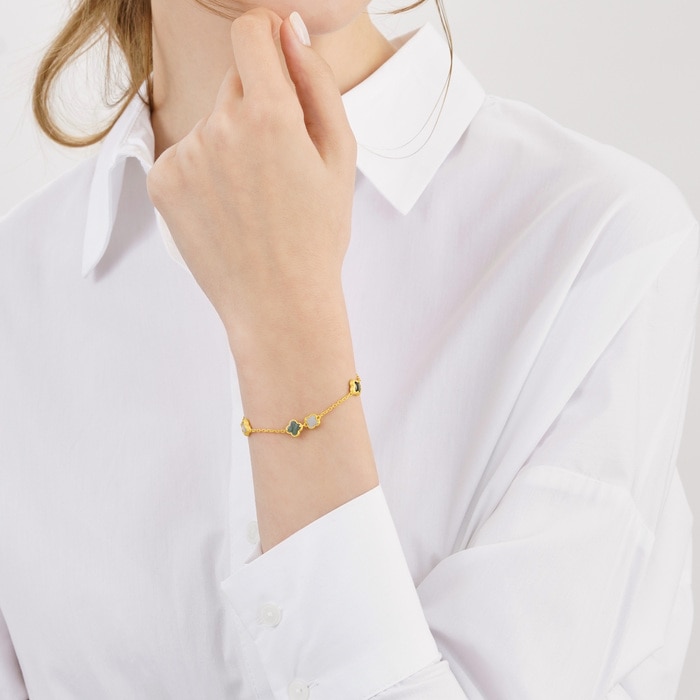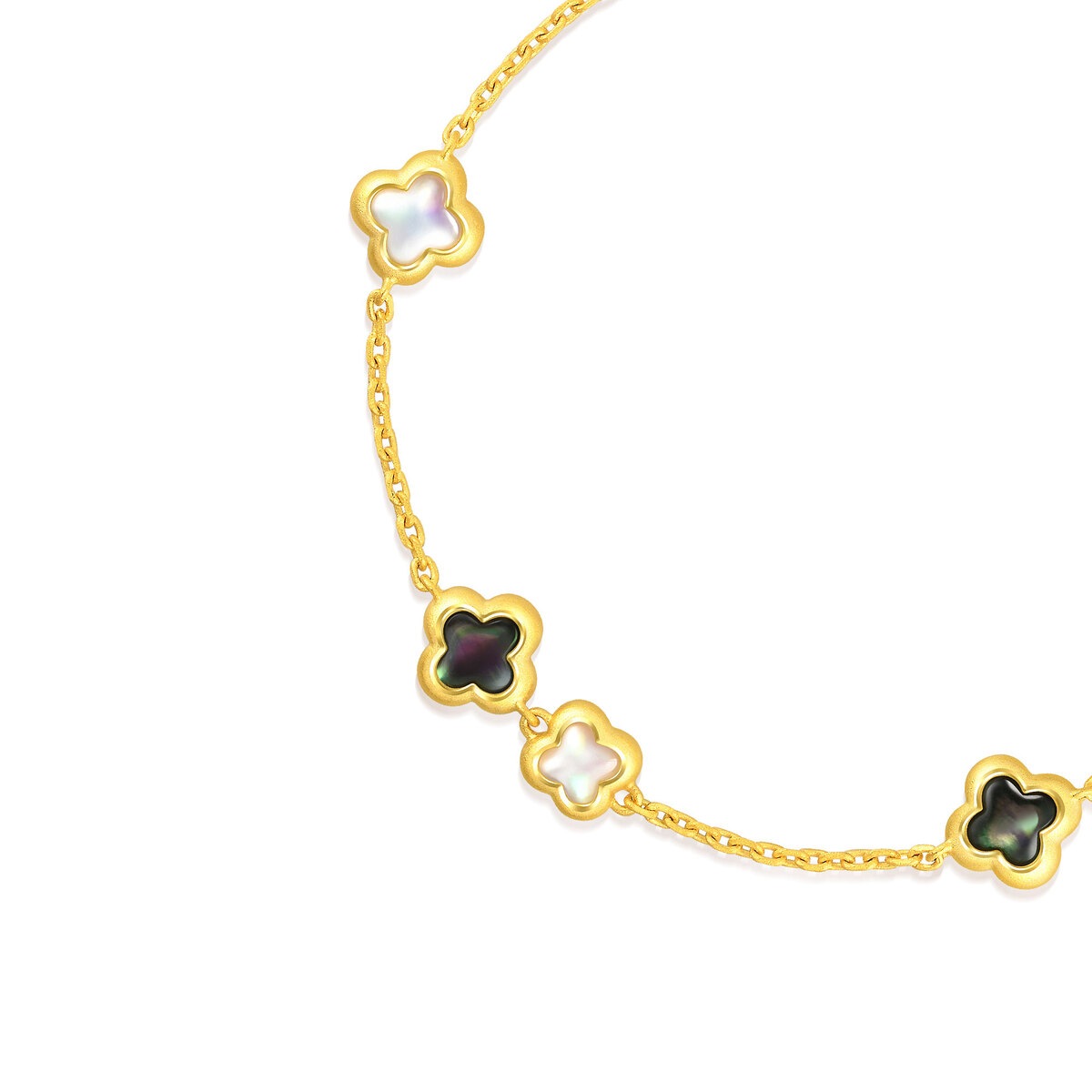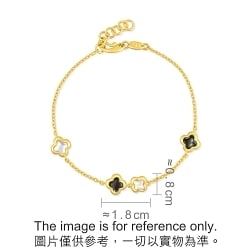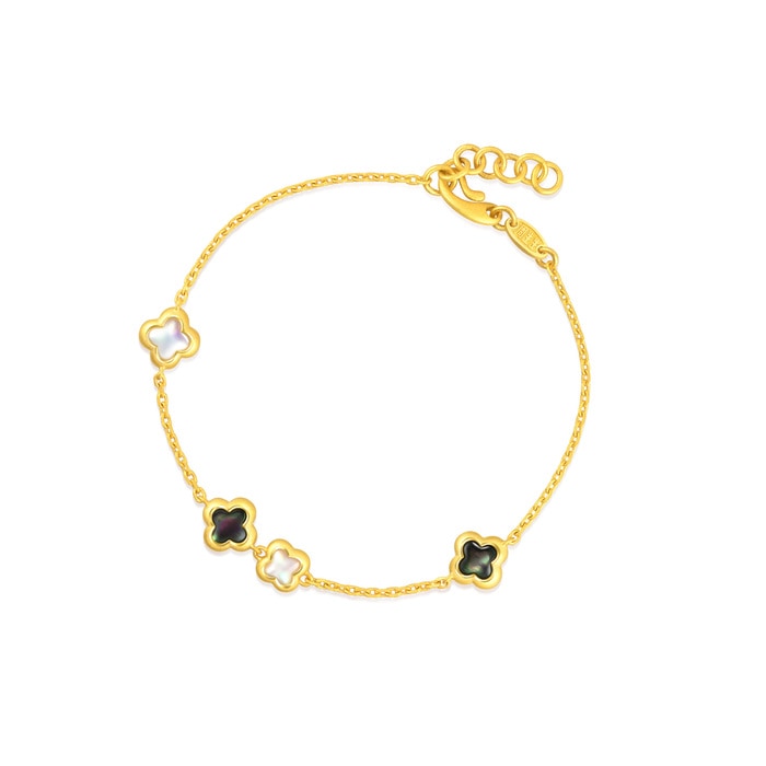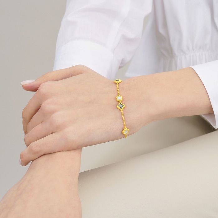 足金梅花手鍊,靈感源自中國古建築的欞花圖案,特別採用黑白貝母相互映襯,工藝精巧細緻,對比鮮明奪目、別樹一幟,「梅花」被譽為花中君子,具傳春報喜之意,更能千年生長,象徵健康長壽,滿載無限祝福。