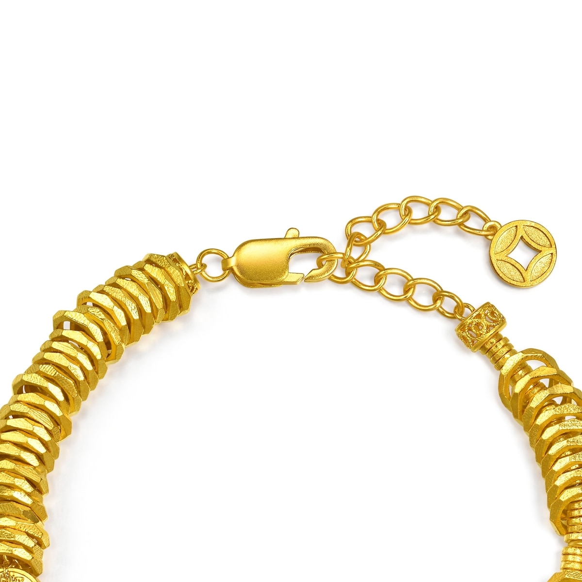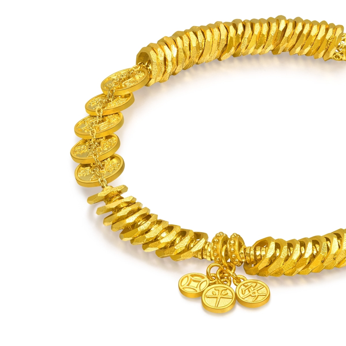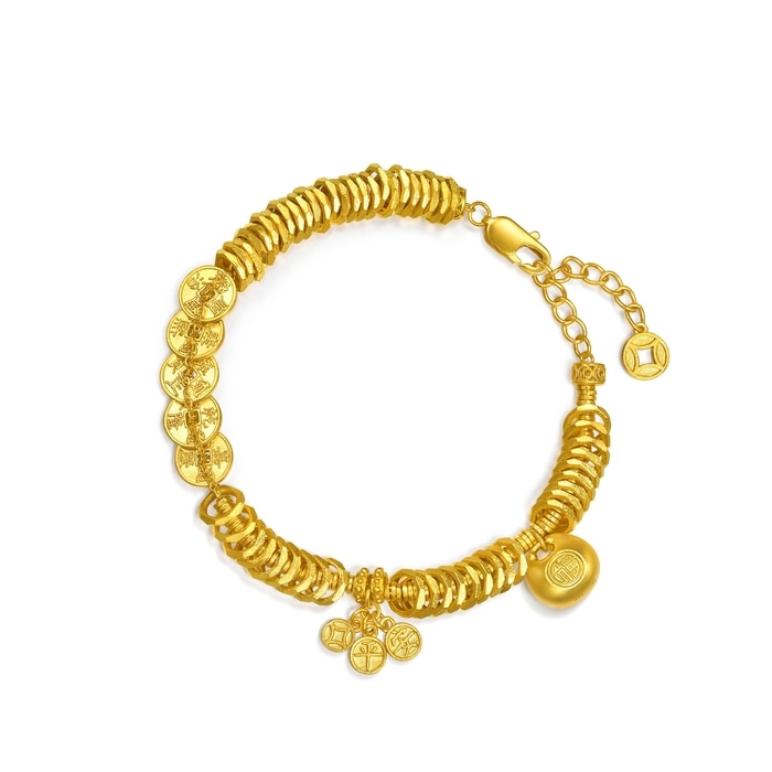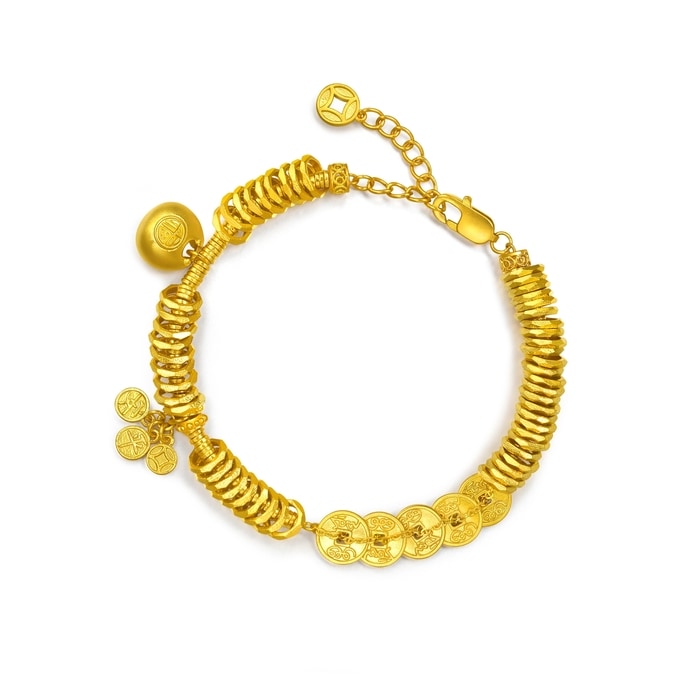 周生生足金手鏈以「碎銀子」及「五帝錢」為設計靈感,採用古祖黃金工藝,打造細膩啞致質感,呈現東方古典韻味。手鏈串連精緻平安牌及福字鎖包,象徵歲歲平安、取之有餘,鎖住福氣財運環繞四周。