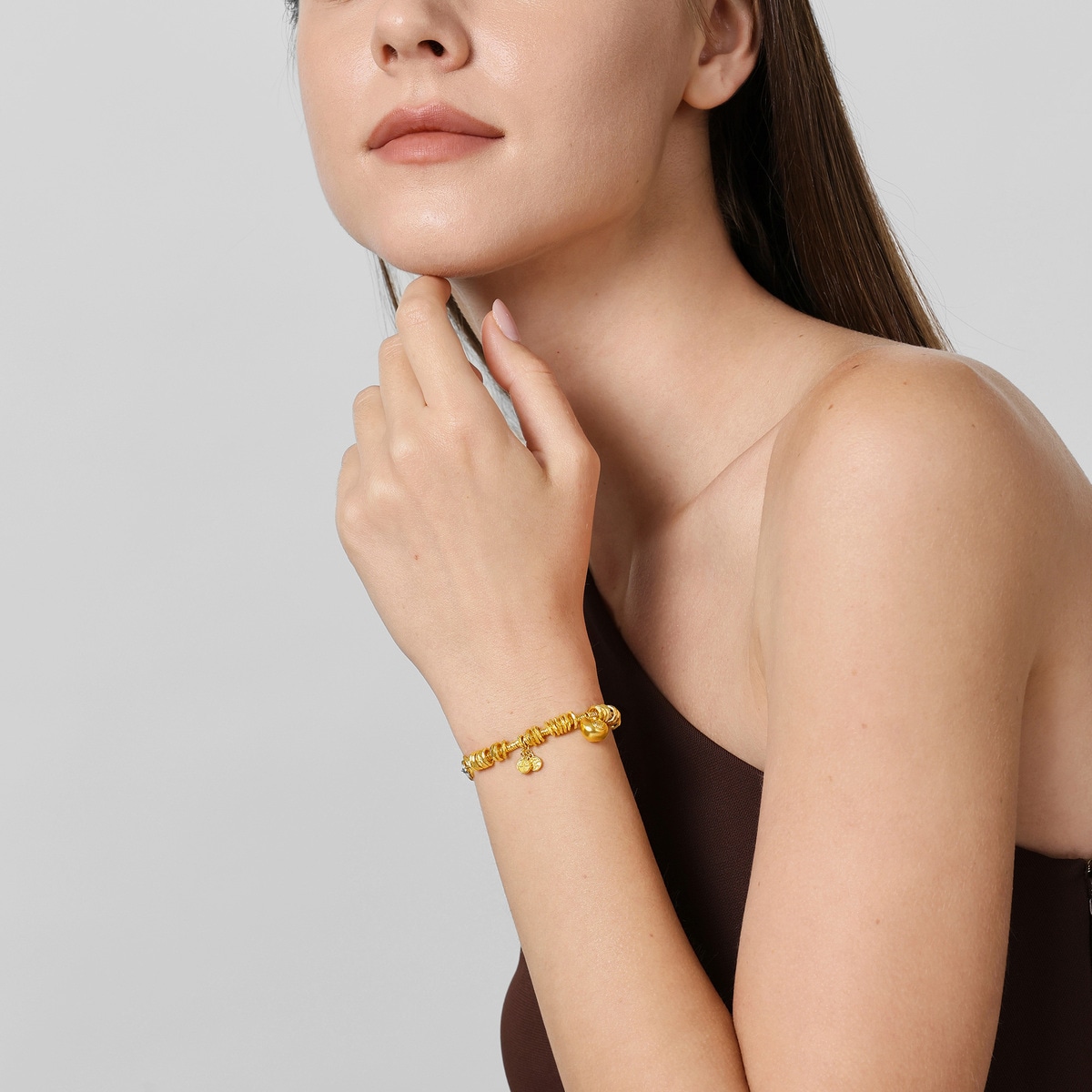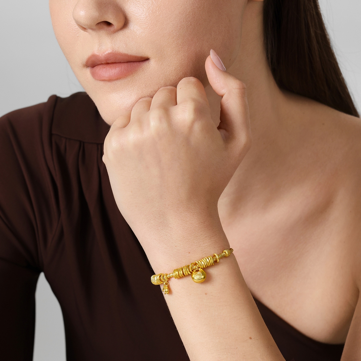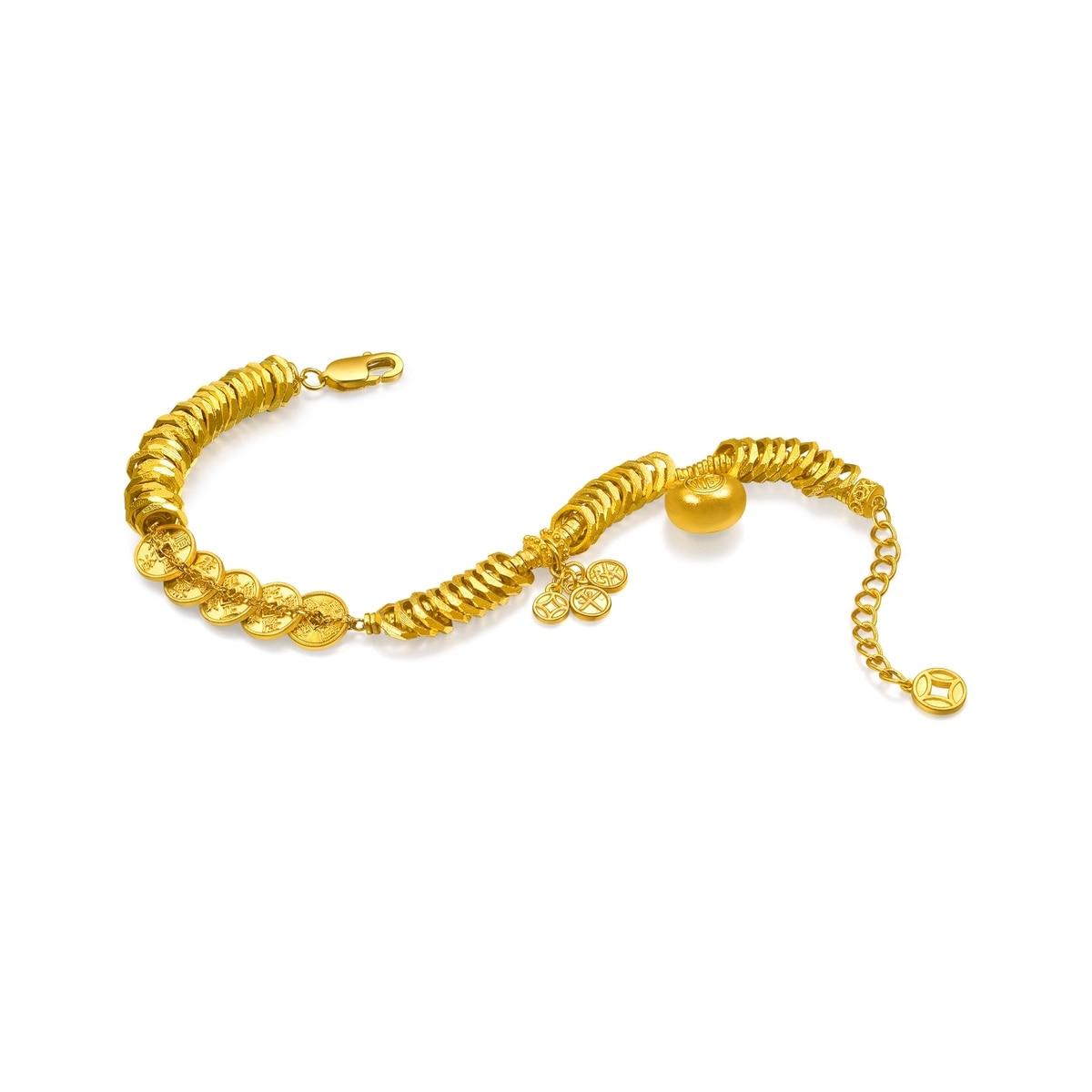 周生生足金手鏈以「碎銀子」及「五帝錢」為設計靈感,採用古祖黃金工藝,打造細膩啞致質感,呈現東方古典韻味。手鏈串連精緻平安牌及福字鎖包,象徵歲歲平安、取之有餘,鎖住福氣財運環繞四周。