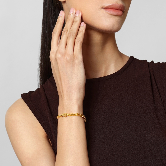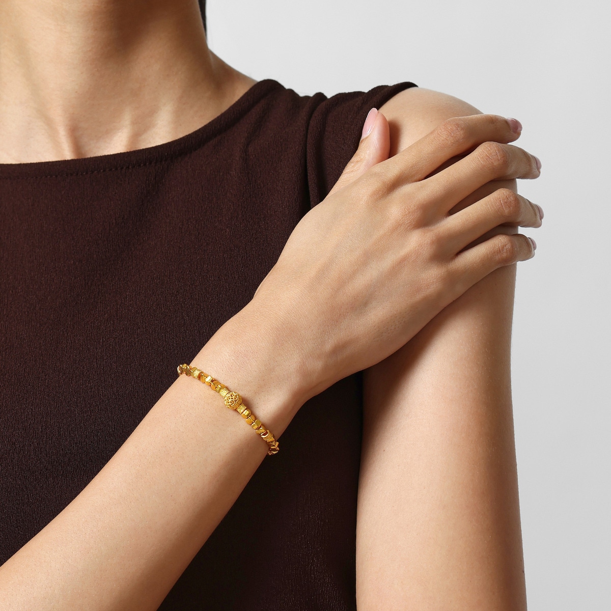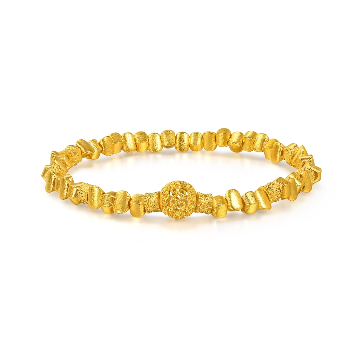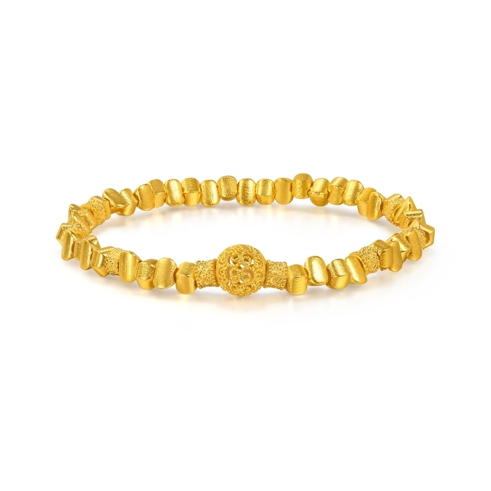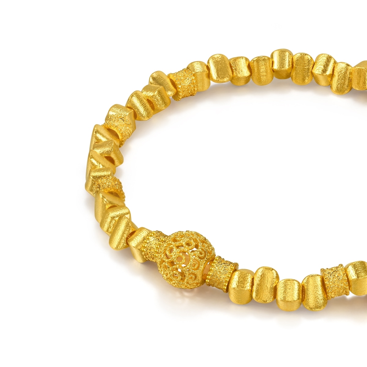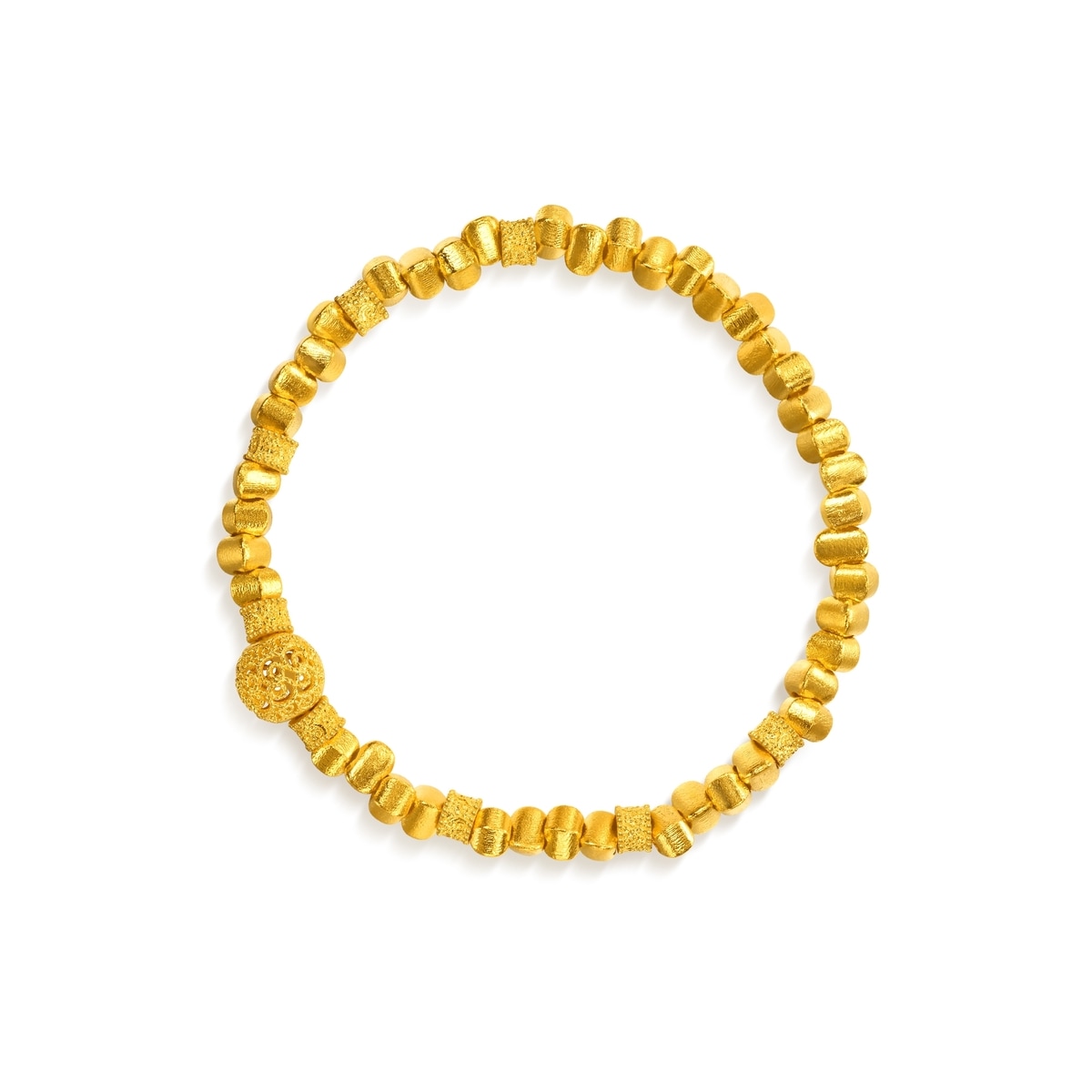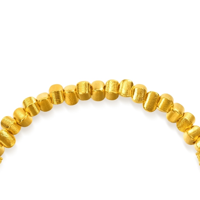 周生生足金手鏈設計靈感源自古代碎銀子,採用古祖黃金工藝,賦予細膩啞光質感,配搭鏤空繡球金珠,別具東方文化韻味。碎銀子代表「歲歲」平安、財源滾滾,結合綴滿吉祥飾紋的繡球,象徵吉祥美滿、錦繡人生,迎來幸運與祝福。