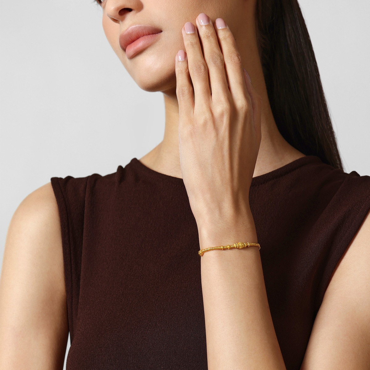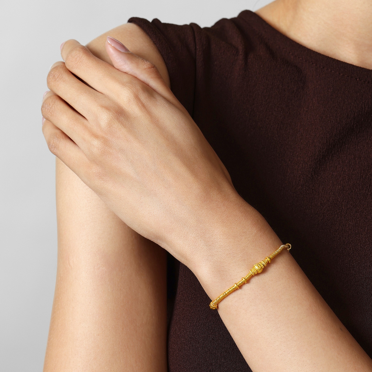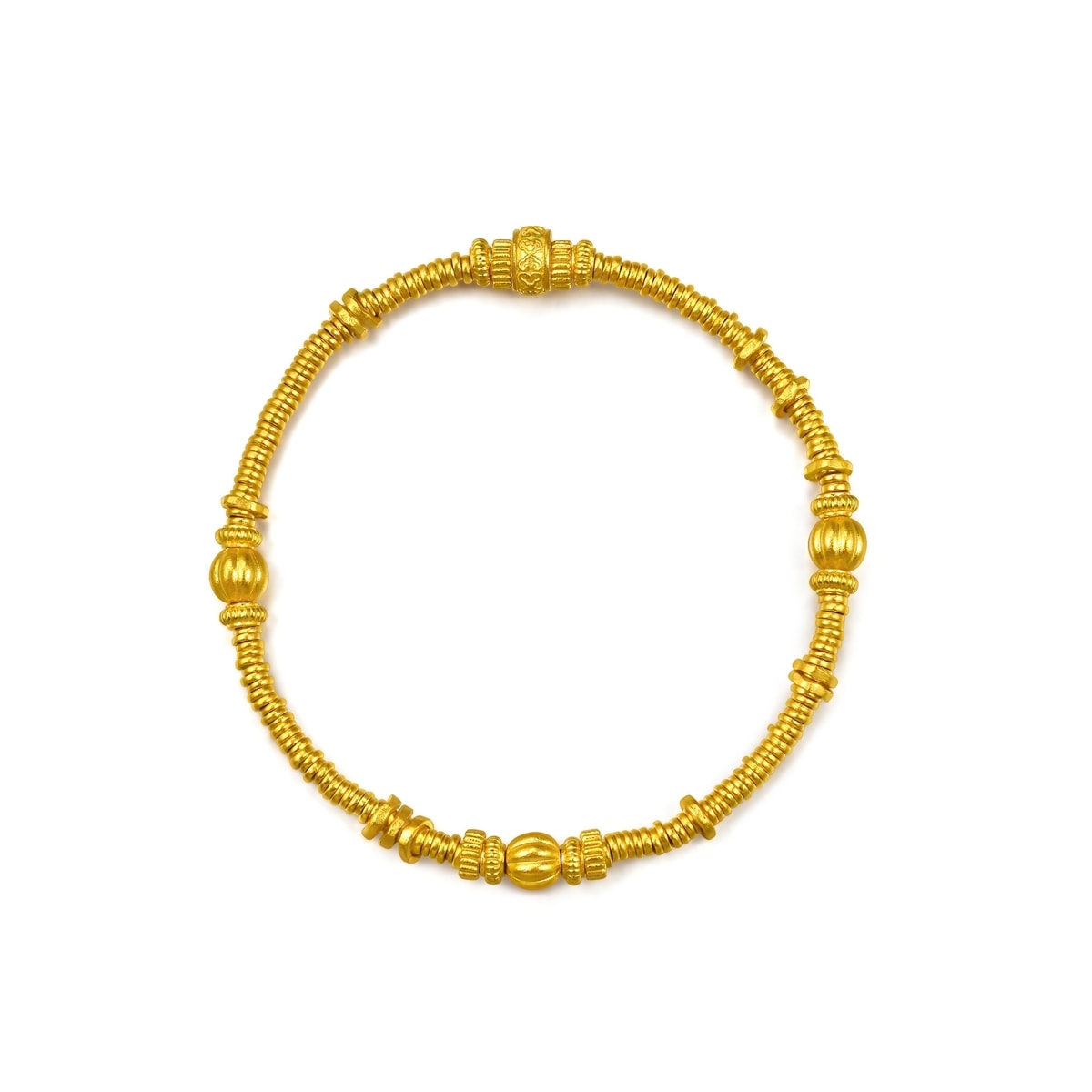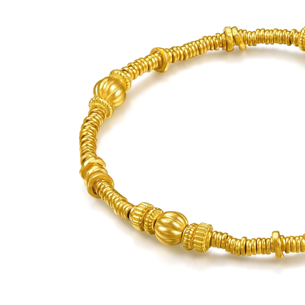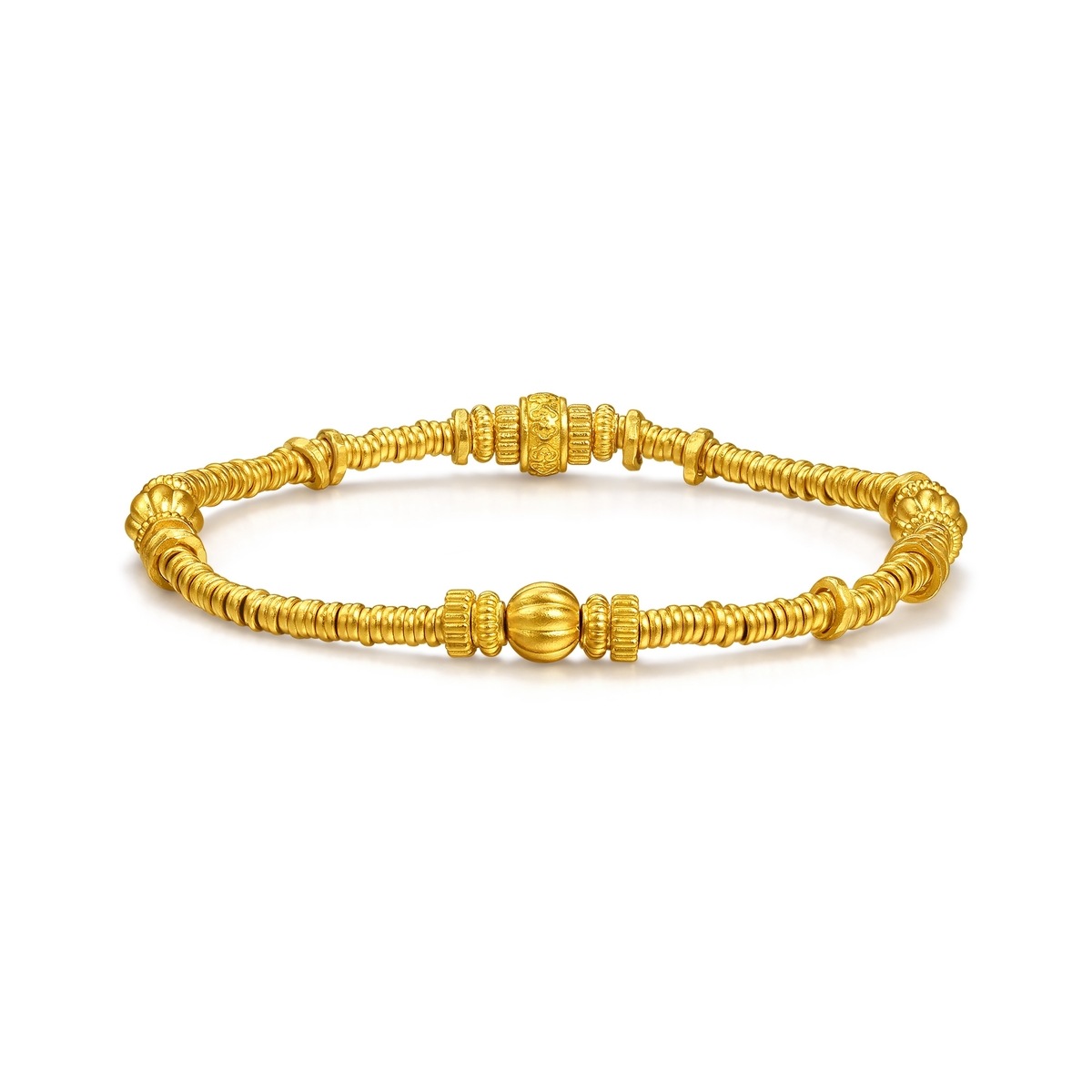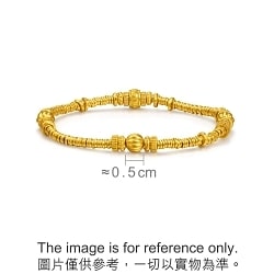 周生生足金手鍊設計靈感源自古代碎銀子「碎碎金」,採用古祖黃金工藝,賦予細膩啞光質感,結合如意紋及南瓜珠元素,蘊藏平安如意、多「籽」多福、吉祥富足的豐富寓意,詮釋獨有東方美學。