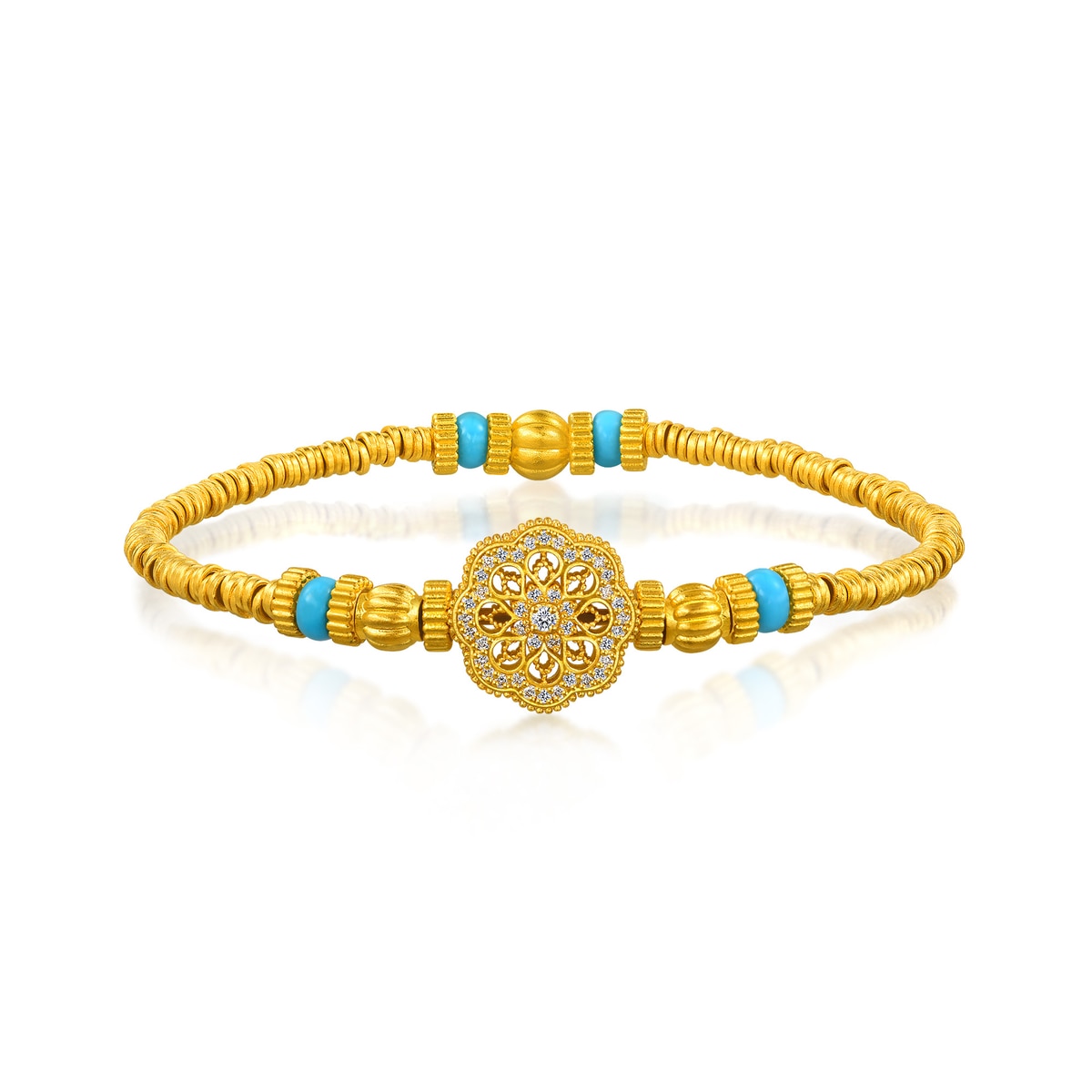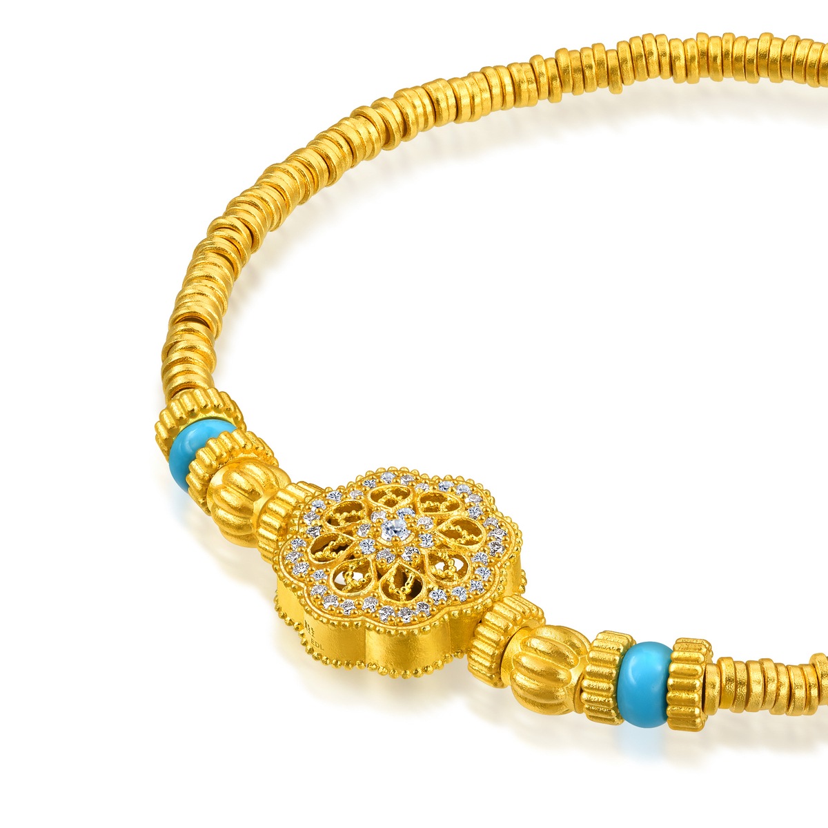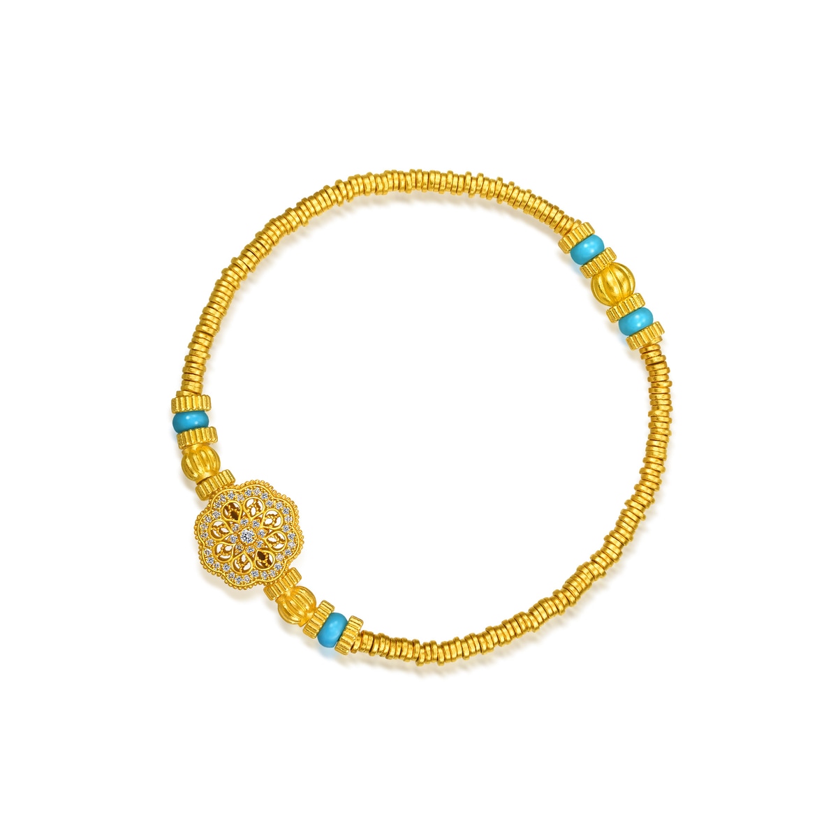 周生生足金鑲嵌鑽石手鍊靈感源自佛教「曼陀羅」圖騰,採用古祖黃金及花絲鏤空工藝,細膩呈現圖案的對稱平衡之美。曼陀羅在梵文中意為「圓」,由幾何線條重複建構而成,無窮無盡、生生不息,象徵宇宙的秩序與和諧,被視為擁有帶來身心安寧的神聖力量。鍊身融合象徵財富的古代碎銀子「碎碎金」造型,寓意歲歲平安、取之有餘,更串連南瓜珠與綠松石,祈願圓滿幸福、吉祥富足。