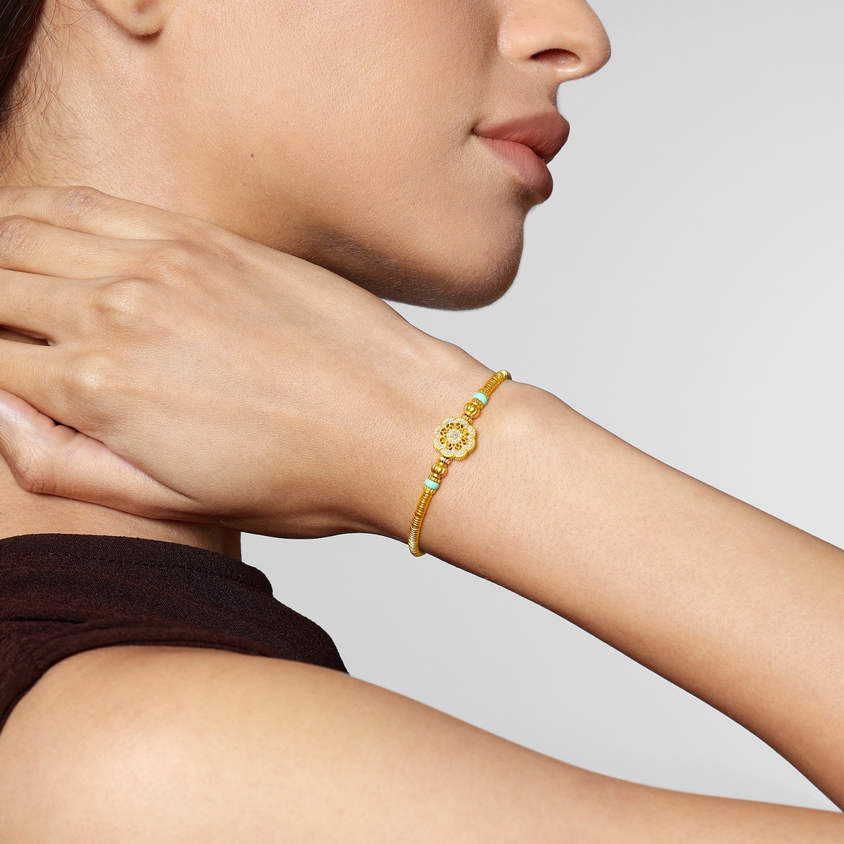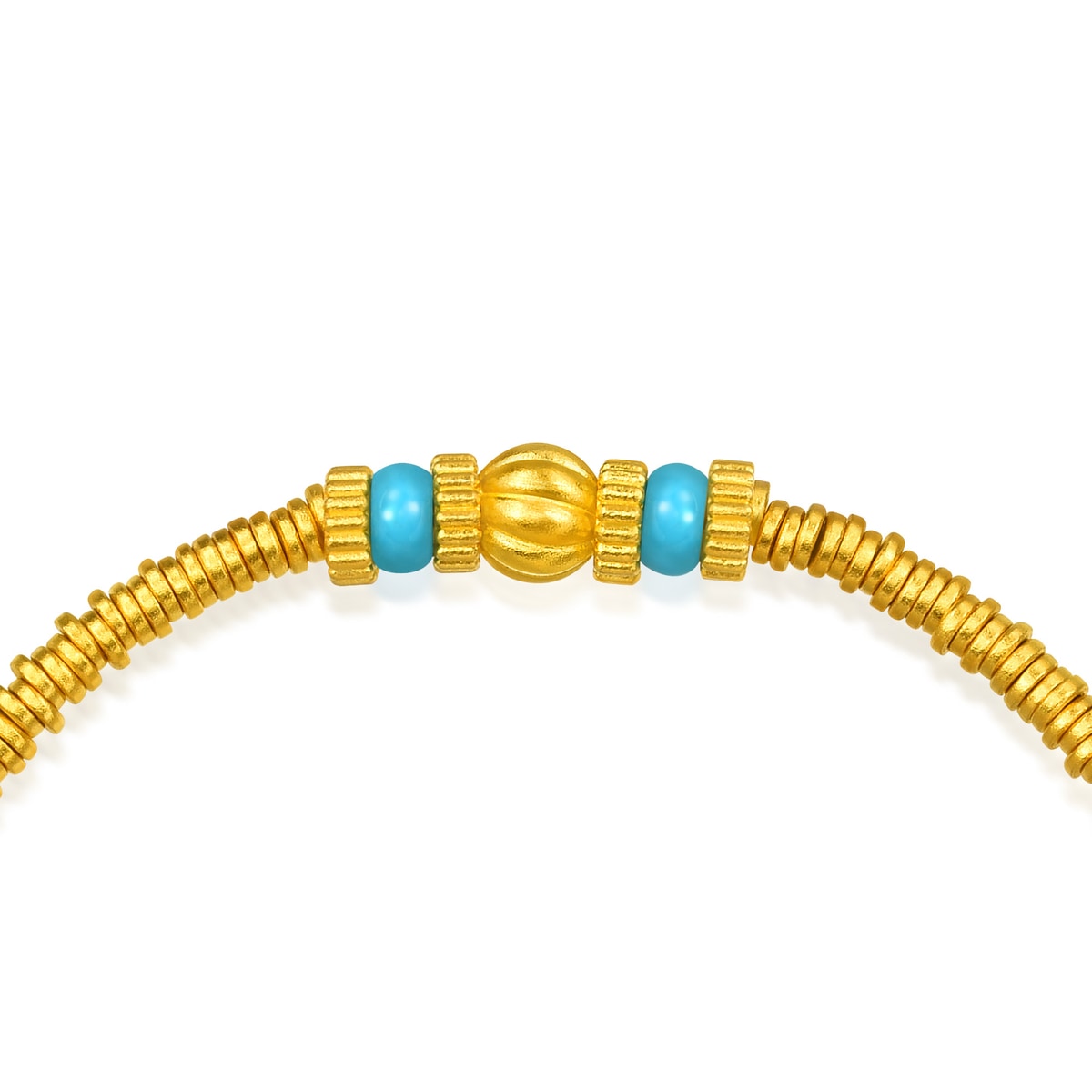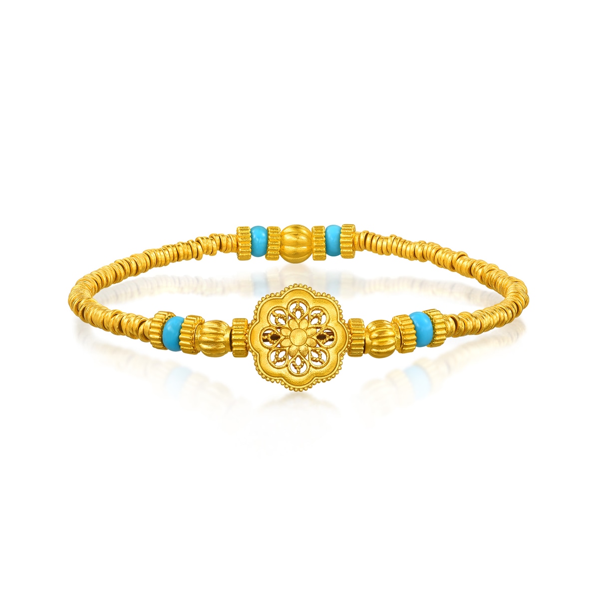 周生生足金鑲嵌鑽石手鍊靈感源自佛教「曼陀羅」圖騰,採用古祖黃金及花絲鏤空工藝,細膩呈現圖案的對稱平衡之美。曼陀羅在梵文中意為「圓」,由幾何線條重複建構而成,無窮無盡、生生不息,象徵宇宙的秩序與和諧,被視為擁有帶來身心安寧的神聖力量。鍊身融合象徵財富的古代碎銀子「碎碎金」造型,寓意歲歲平安、取之有餘,更串連南瓜珠與綠松石,祈願圓滿幸福、吉祥富足。