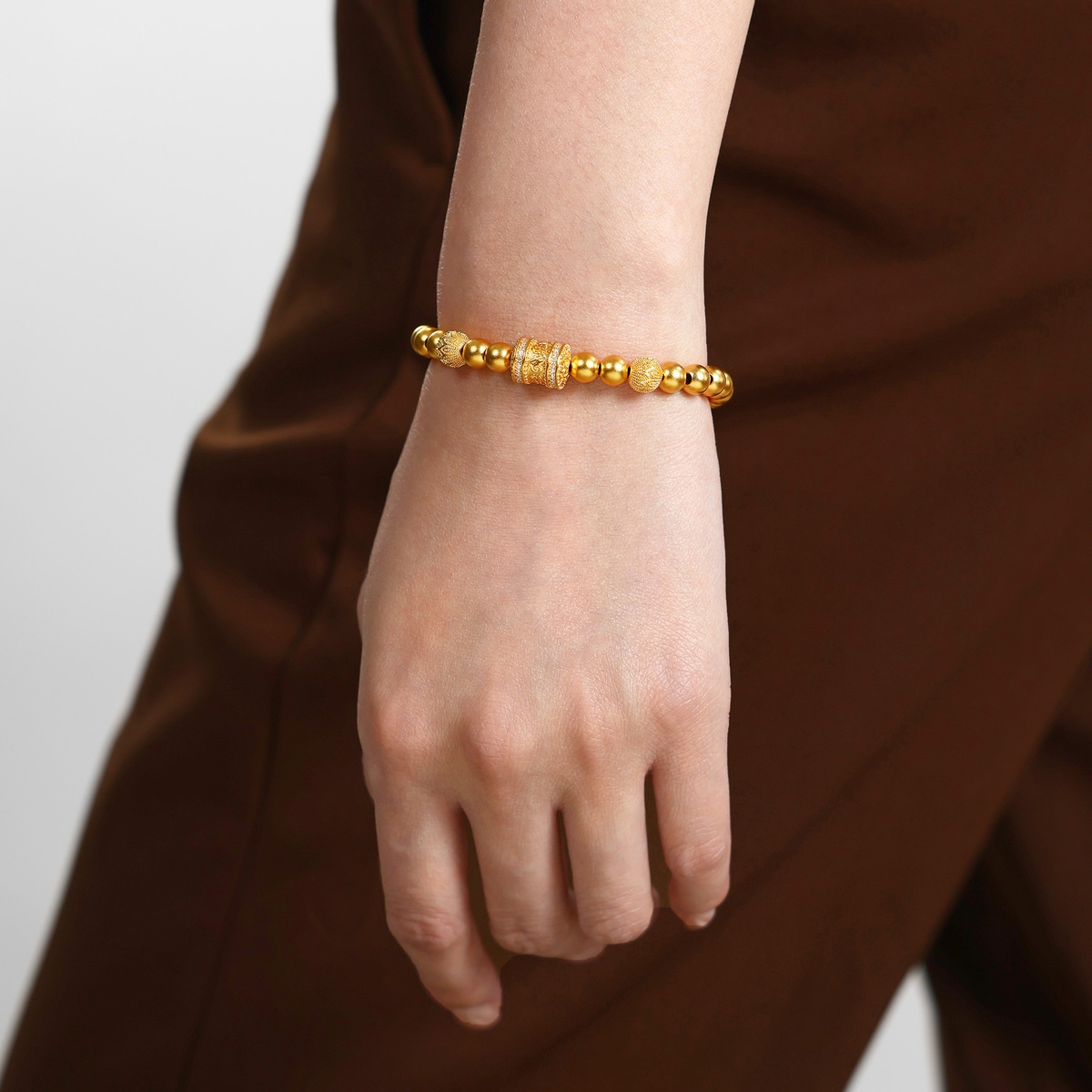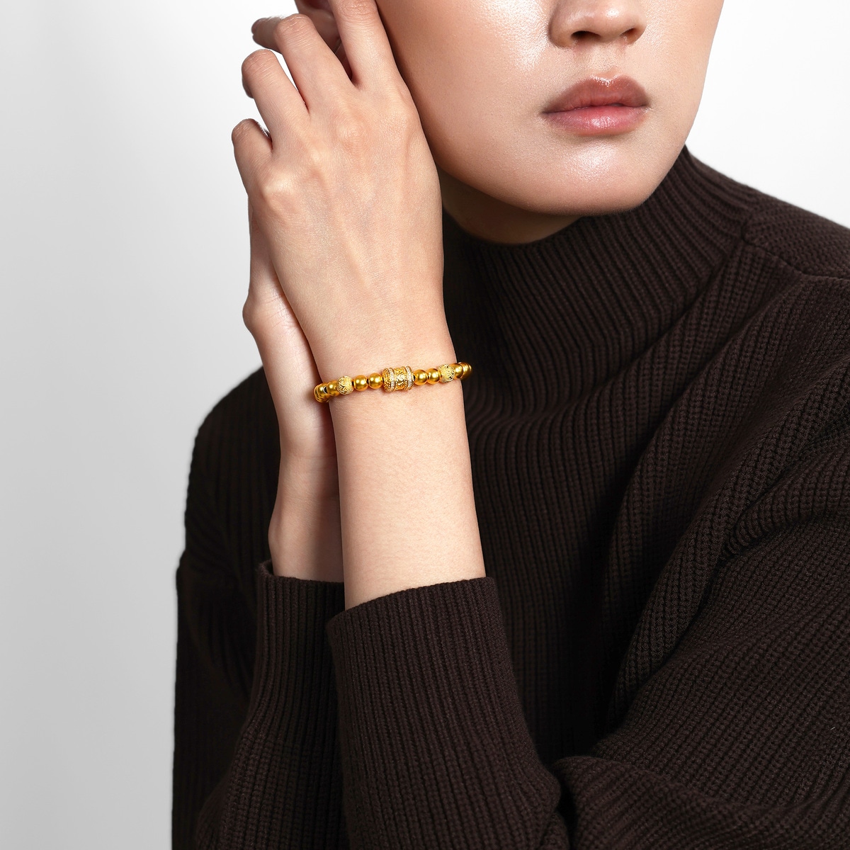 周生生足金鑽石手鍊融合多種佛教文化祝福,採用古祖黃金工藝,於金珠表面刻鑄立體花紋,結合美鑽映襯,細緻呈現佛教文化箴言、轉運珠及繡球等設計元素,寓意吉祥安康、福轉圓滿。