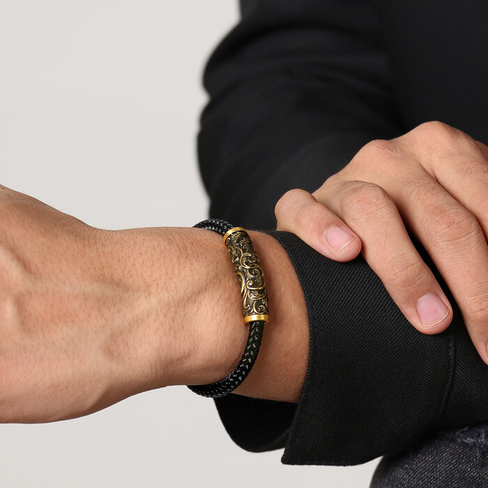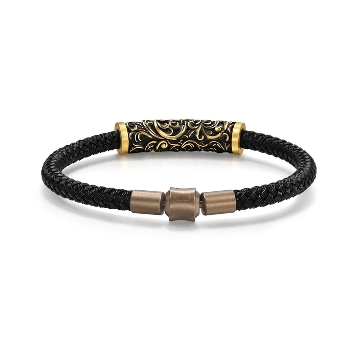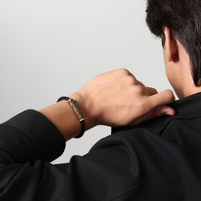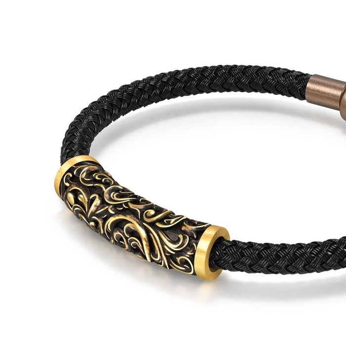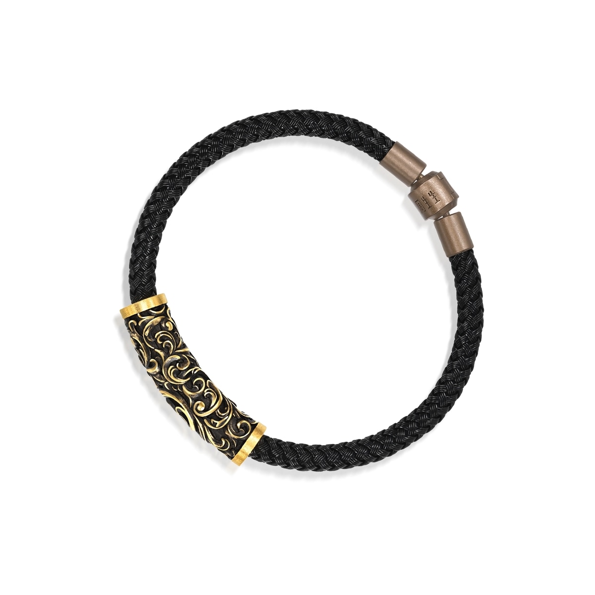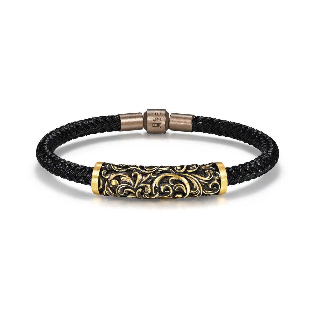 周生生足金手繩以「卷草紋」為設計靈感,採用酷黑工藝,呈現飾紋的深刻線條與質感,獨具時尚個性。卷草紋是中國傳統植物紋樣,其排列連綿不斷,象徵茂盛長久、生生不息之氣,蘊藏祥雲流轉的深遠寓意。
