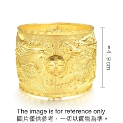 周生生將傳統吉祥的龍鳳造型呈現於黃金上,展示出龍與鳳別樹一格的獨特神態,中間的金扣刻有「囍」, 令金手鐲時尚高貴。
