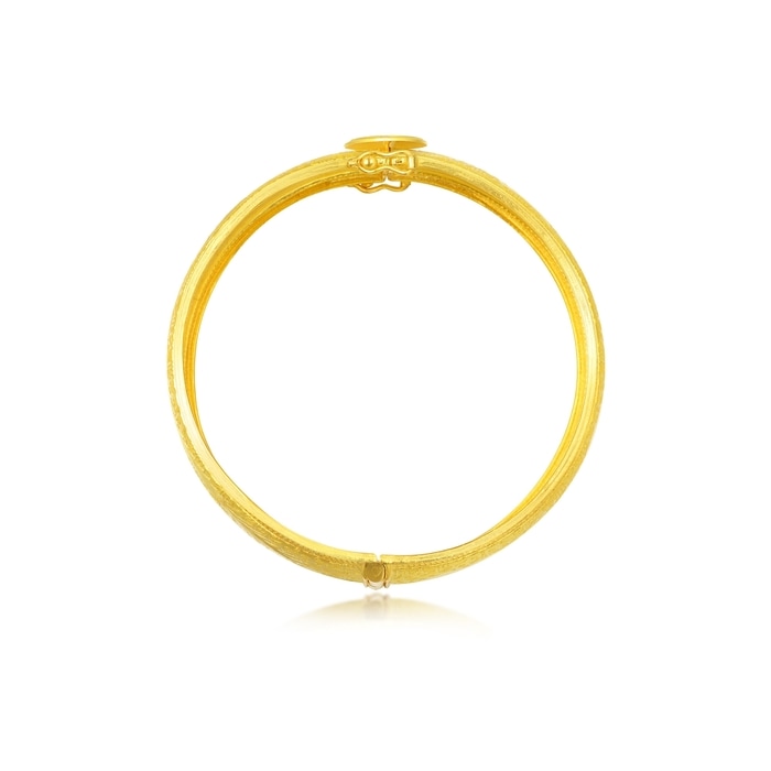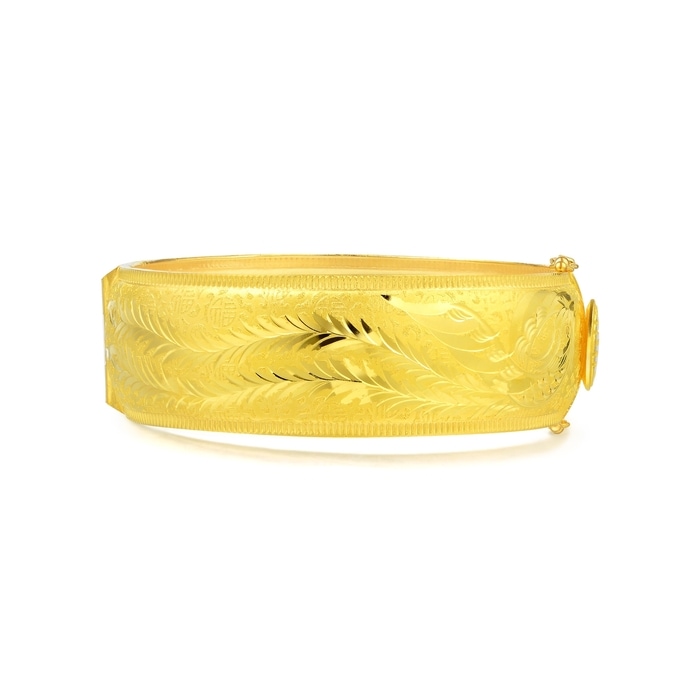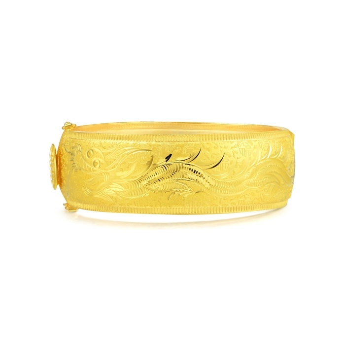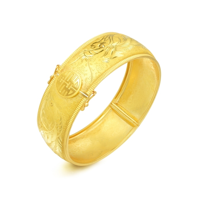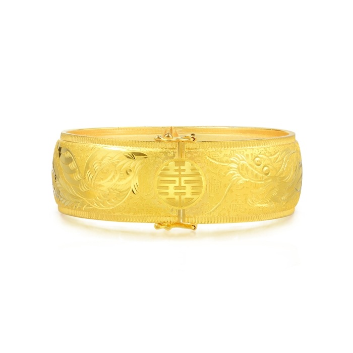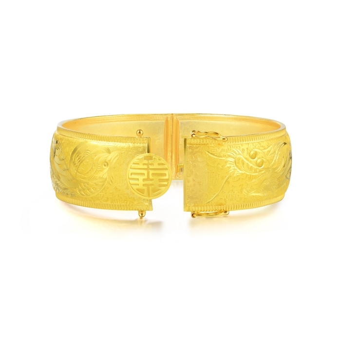 周生生龍與鳳環繞黃金手鐲,展現龍鳳呈祥的祝福寓意。手鐲中間的金扣刻有「囍」字,祝賀新婚夫妻喜上加喜。