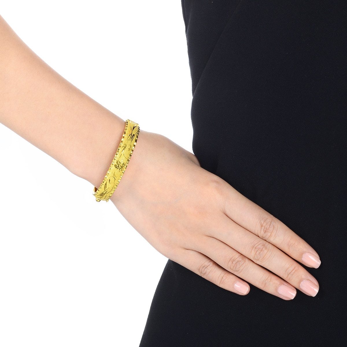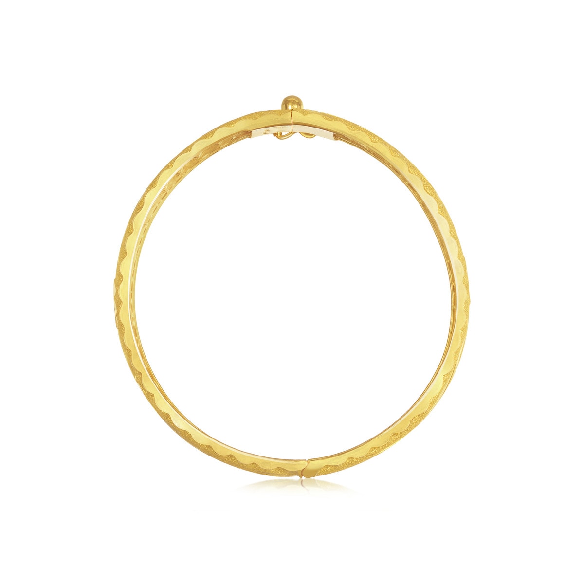 周生生足金雙囍龍鳳手鐲,結合精緻工藝及華麗飾紋,質感細膩動人,寓意「龍鳳呈祥、金玉良緣」,為新人贈予美滿祝福。