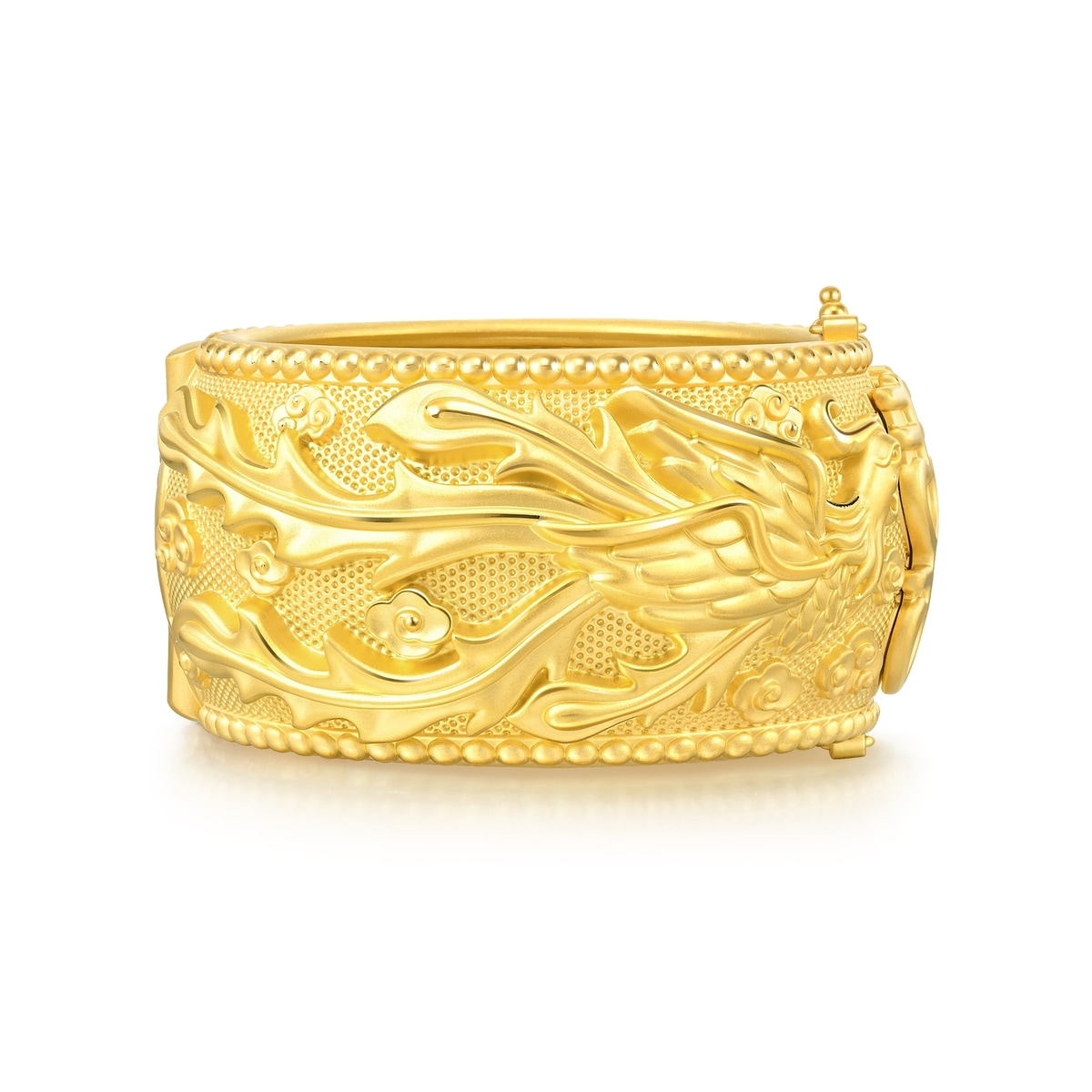 周生生足金手鐲採用硬金電鑄工藝,龍鳳造型立體精緻、栩栩如生,中間刻鑄「囍」字,綴有祥雲圖案及細膩飾紋,寓意龍鳳呈祥、金玉良緣,滿載對佳偶的無限祝福。