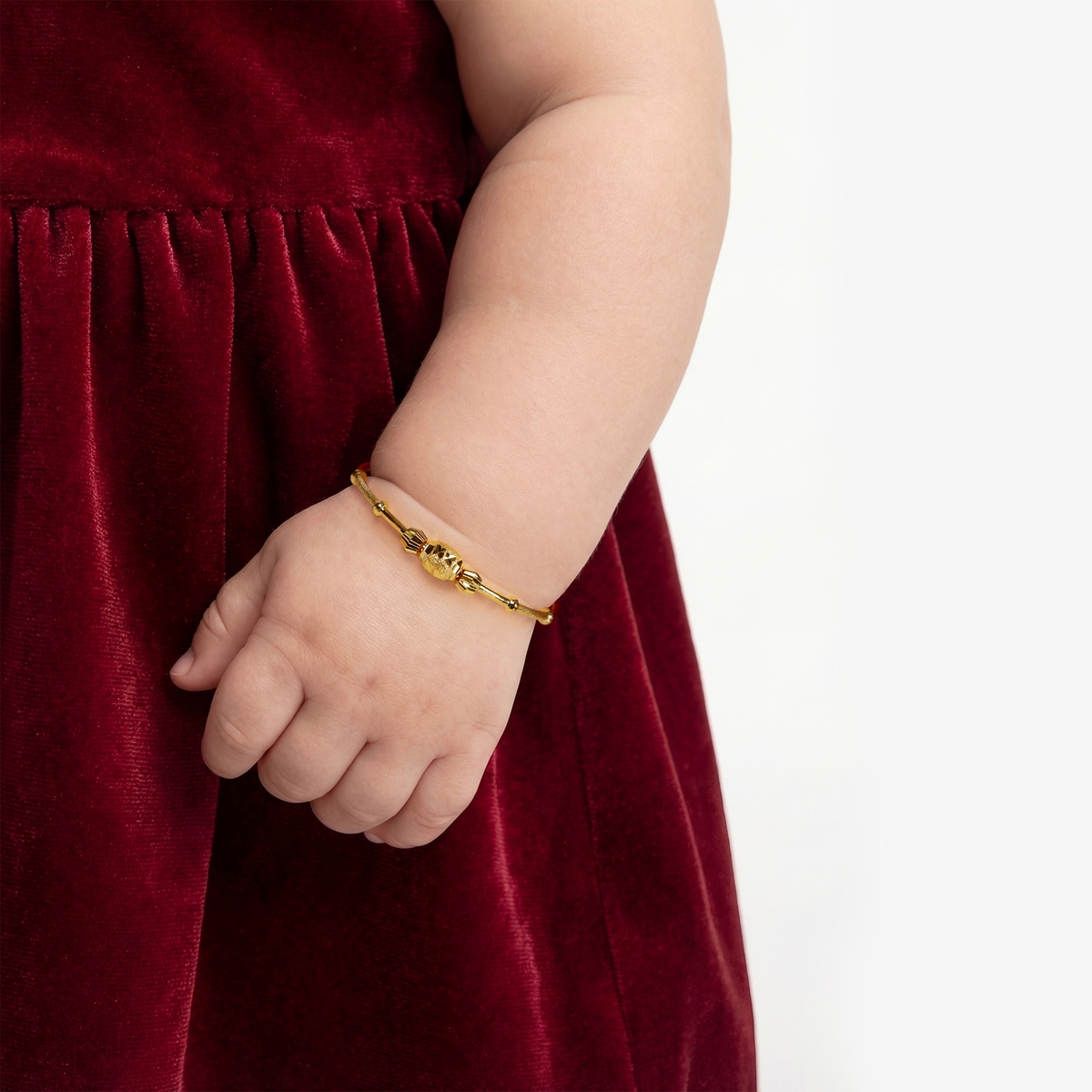 周生生足金BB手鐲以金珠為造型,結合細緻批花及閃砂工藝,靈巧可愛,寄託長輩對新生寶寶的無限祝福。