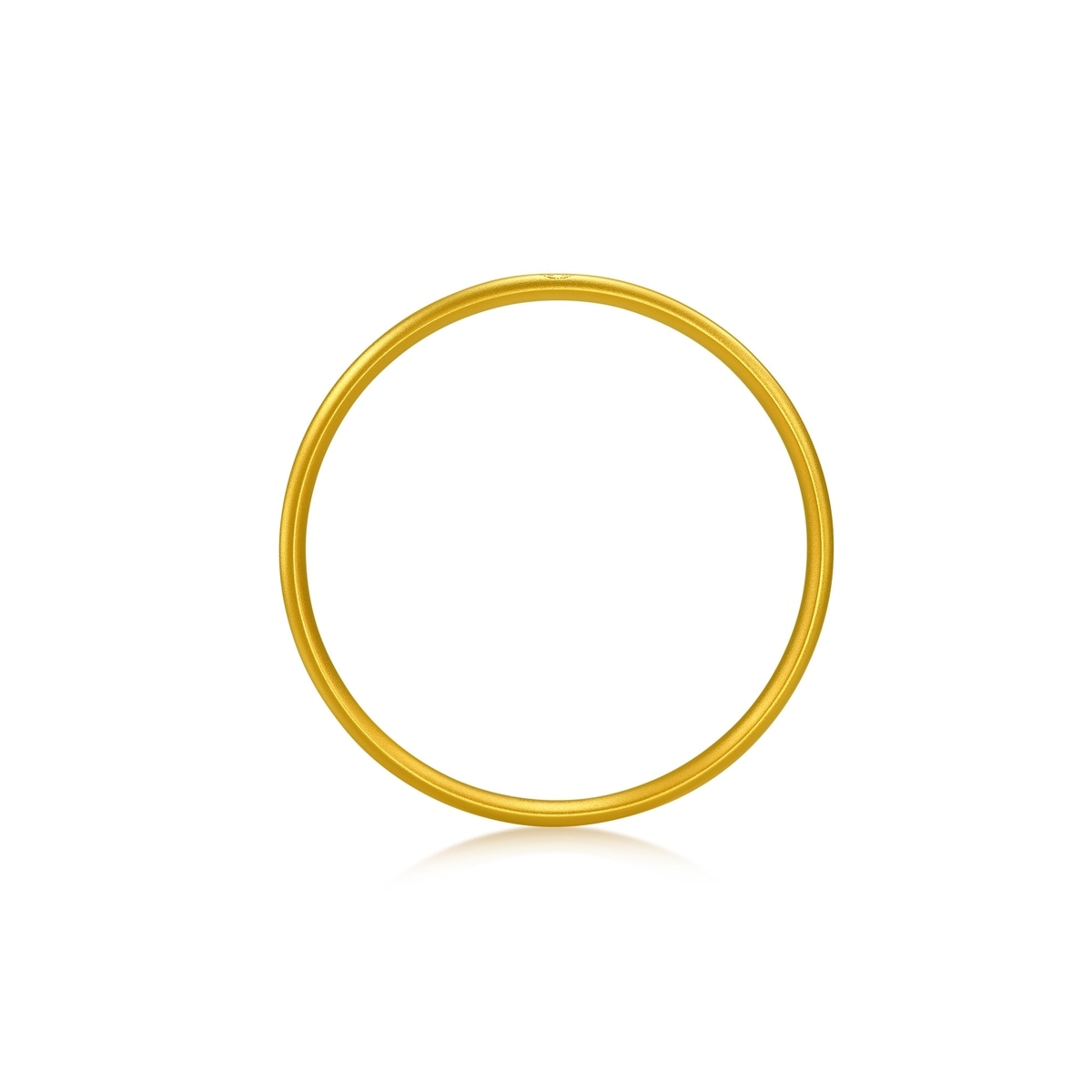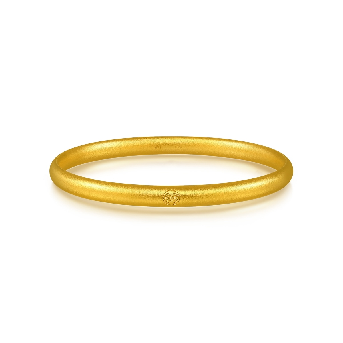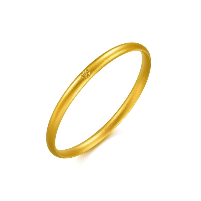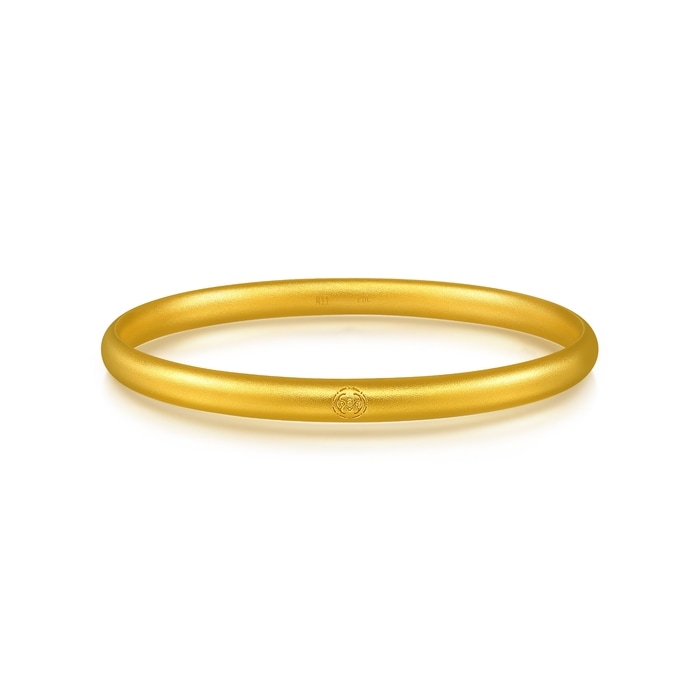 周生生扁條實心足金手鐲以古祖黃金工藝打造,鐲身較寛,端莊大氣,表面經噴砂處理,呈細緻啞光質感。手鐲上印有專屬「竹」「蝠」印記,寓意「祝福」滿滿之意。