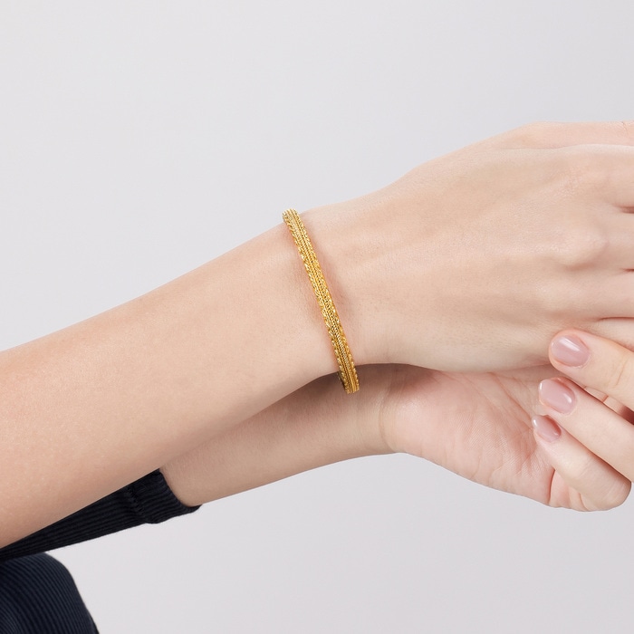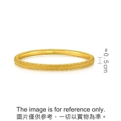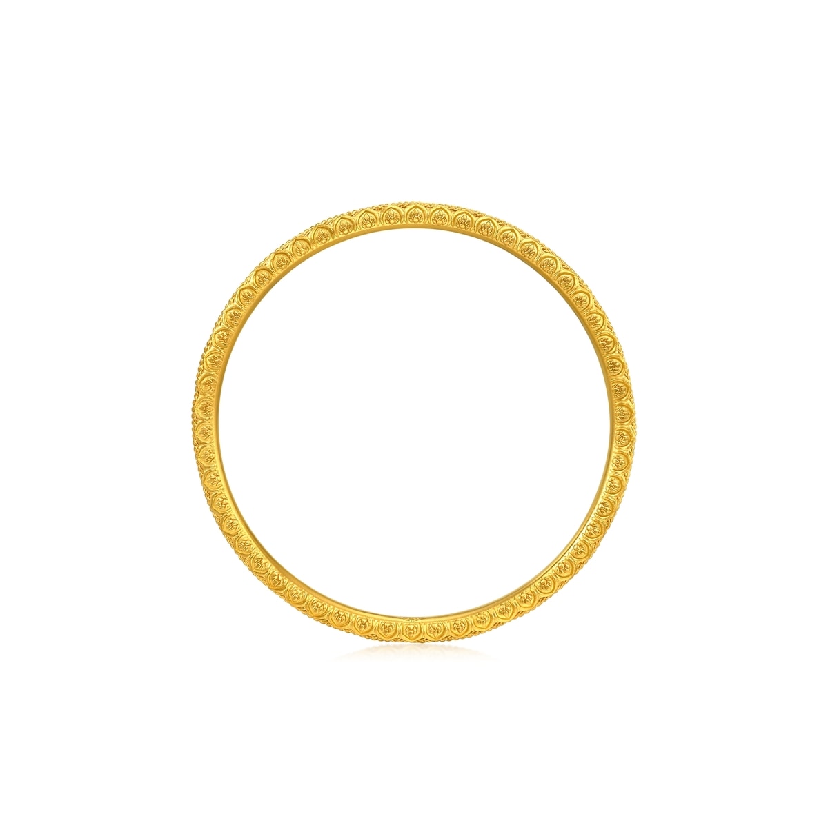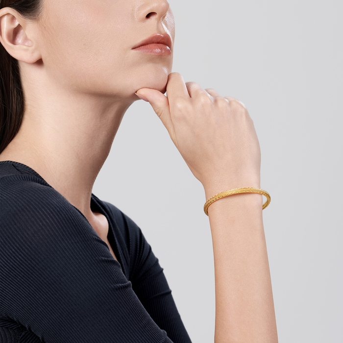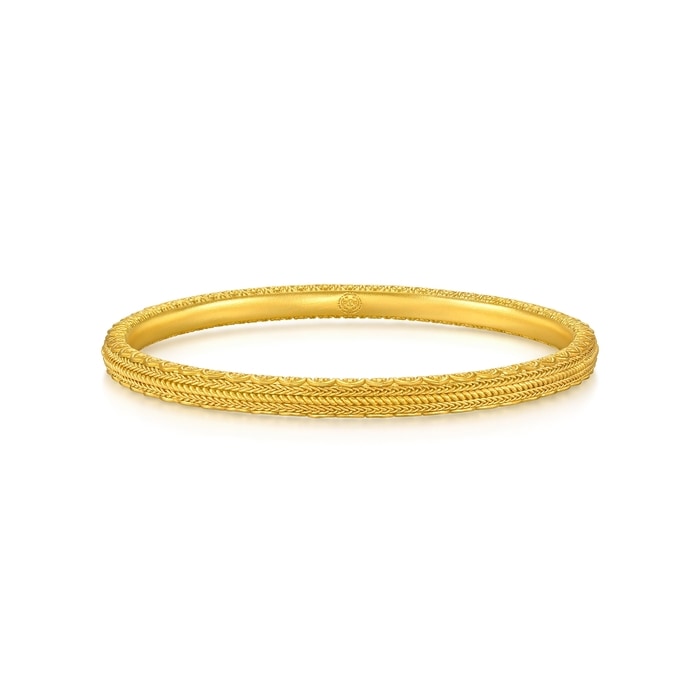 周生生足金手鐲採用古祖黃金工藝,呈現東方文化工藝韻味,手鐲正面綴滿編織禾穗飾紋,兩側結合寶相花紋圖案,造型立體細緻,散發古典雅致氣息,蘊藏富貴美滿、豐盛繁榮的吉祥寓意,內圈刻鑄專屬「竹」「蝠」印記,象徵祝福常伴身邊。
