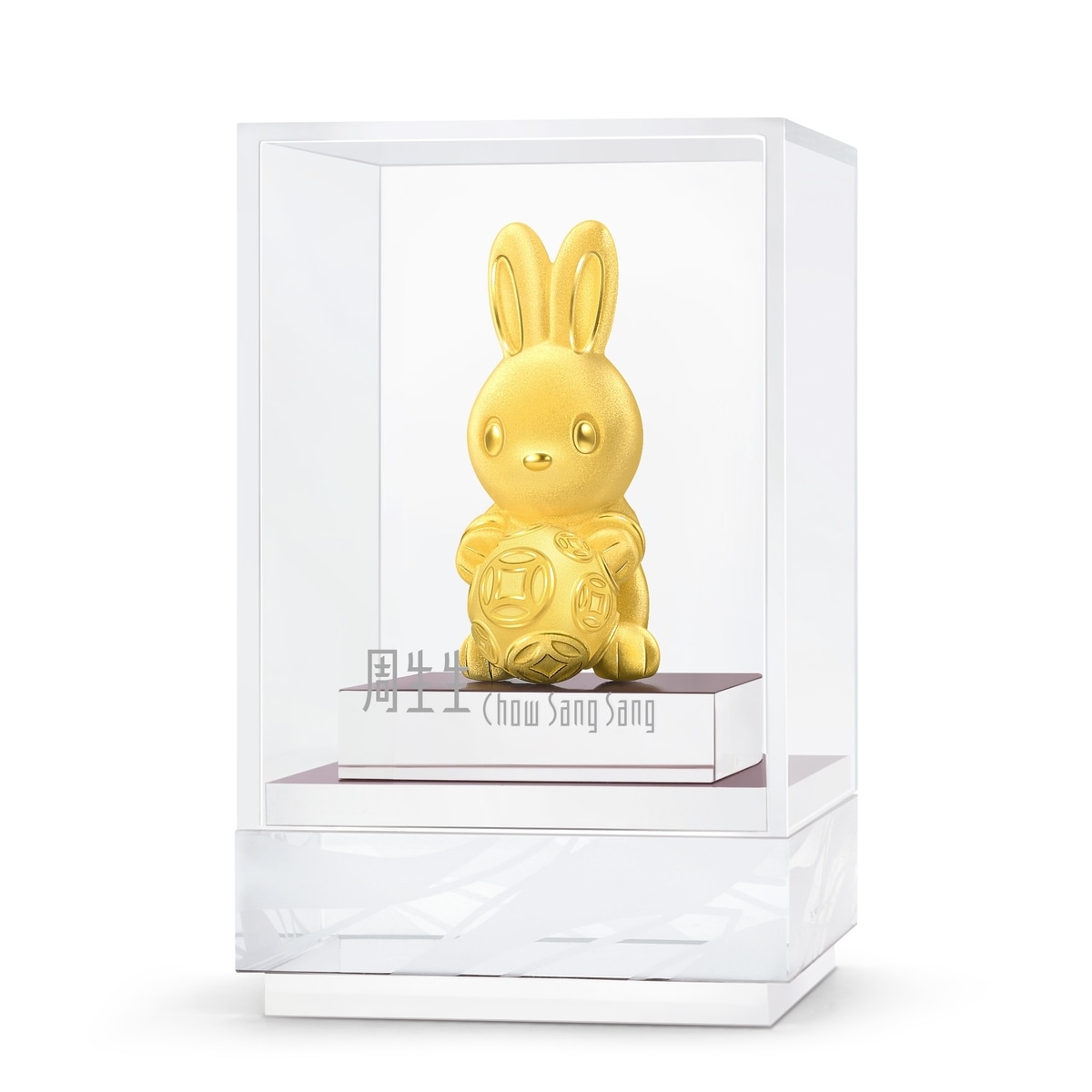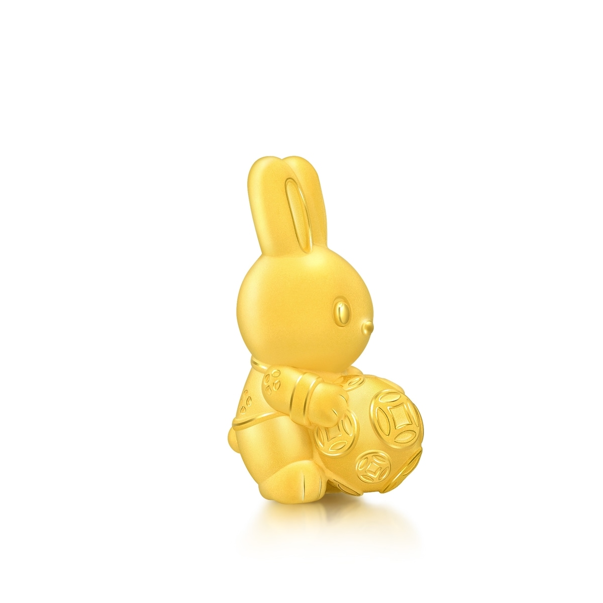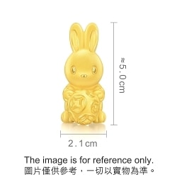 足金金兔擺件,於黃金表面採用人手打磨及絨毛電鑄處理技術,呈現細膩絨面質感,小兔造型乖萌可愛,手捧滿佈錢幣圖案的黃金錢球,象徵財運、福運「滾滾」而來,傳遞兔年真摯祝福。