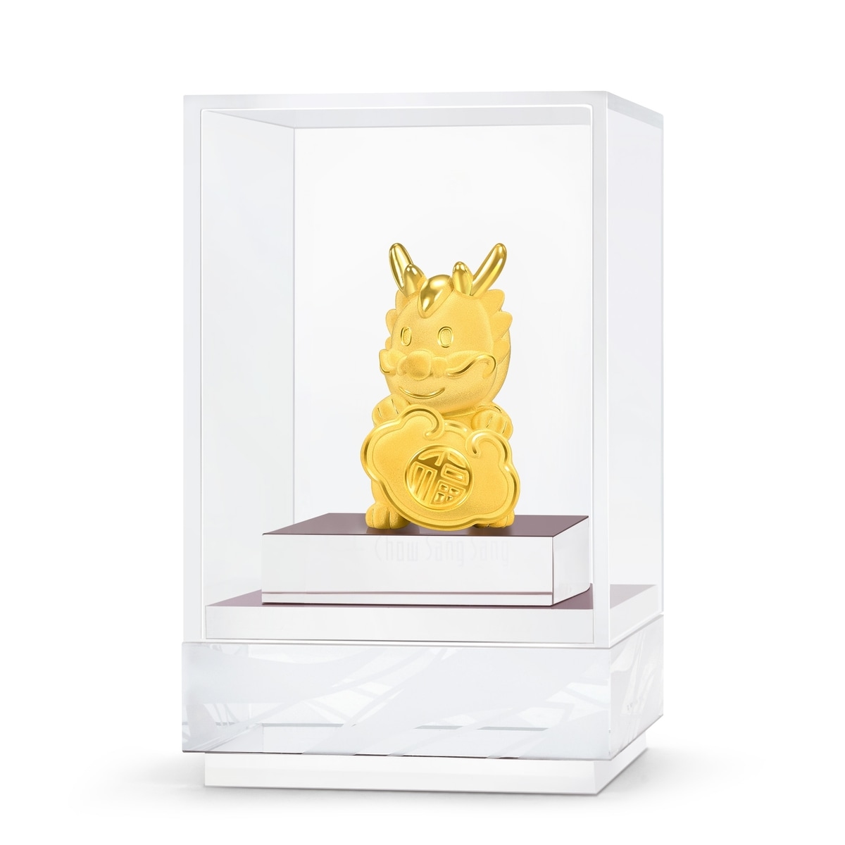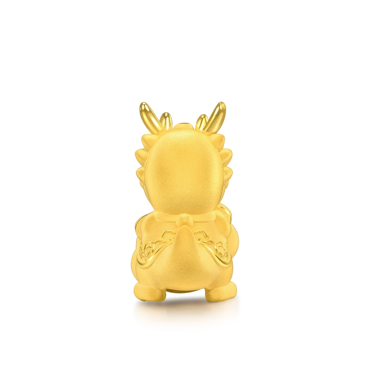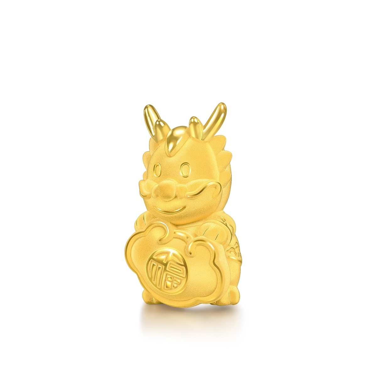周生生足金金龍擺件,造型圓潤萌趣,特別採用人手打磨及絨毛電鑄處理技術,呈現獨特絨面質感的立體造型,小金龍手捧著印有「福」的黃金如意,象徵「萬事如意」,傳遞龍年真摯祝福。擺件重量約為5克。