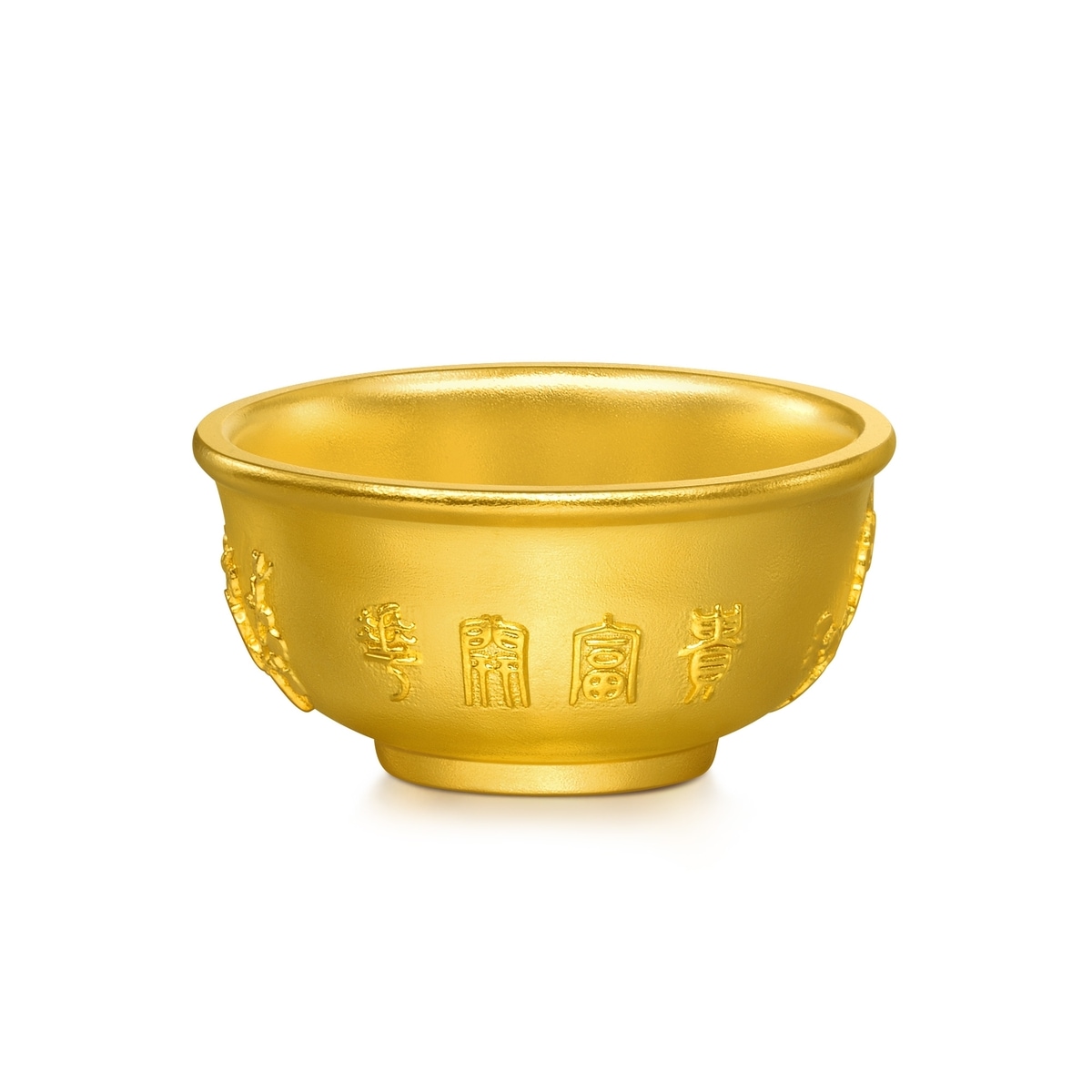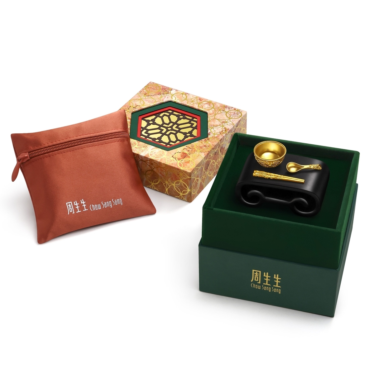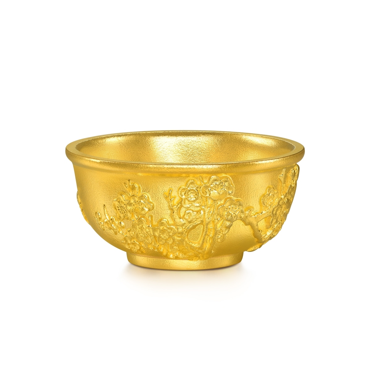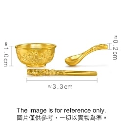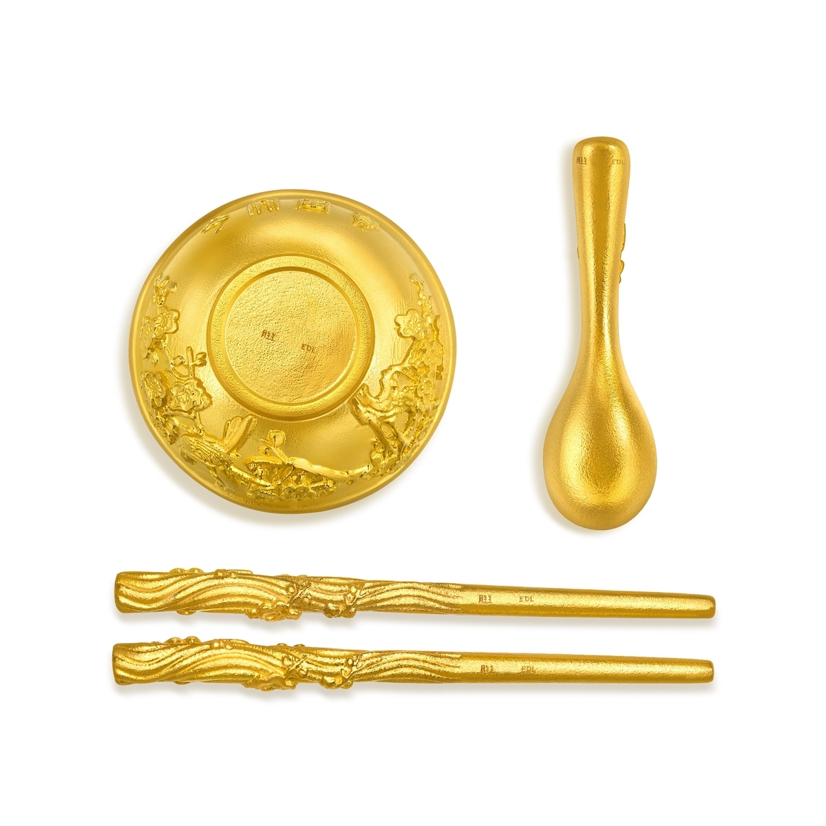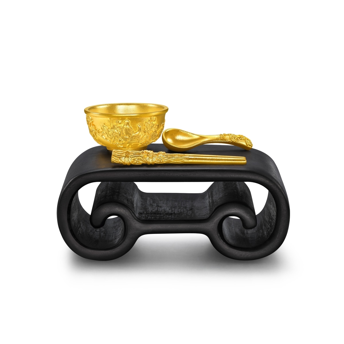 周生生足金金碗筷套裝迷你擺件精緻小巧,極具收藏價值。金碗筷套裝象徵衣食無憂,金碗、金湯匙加上可愛好玩,分得開的金筷,綴以栩栩如生的喜鵲和梅花,寓意喜上眉梢和豐衣足食。