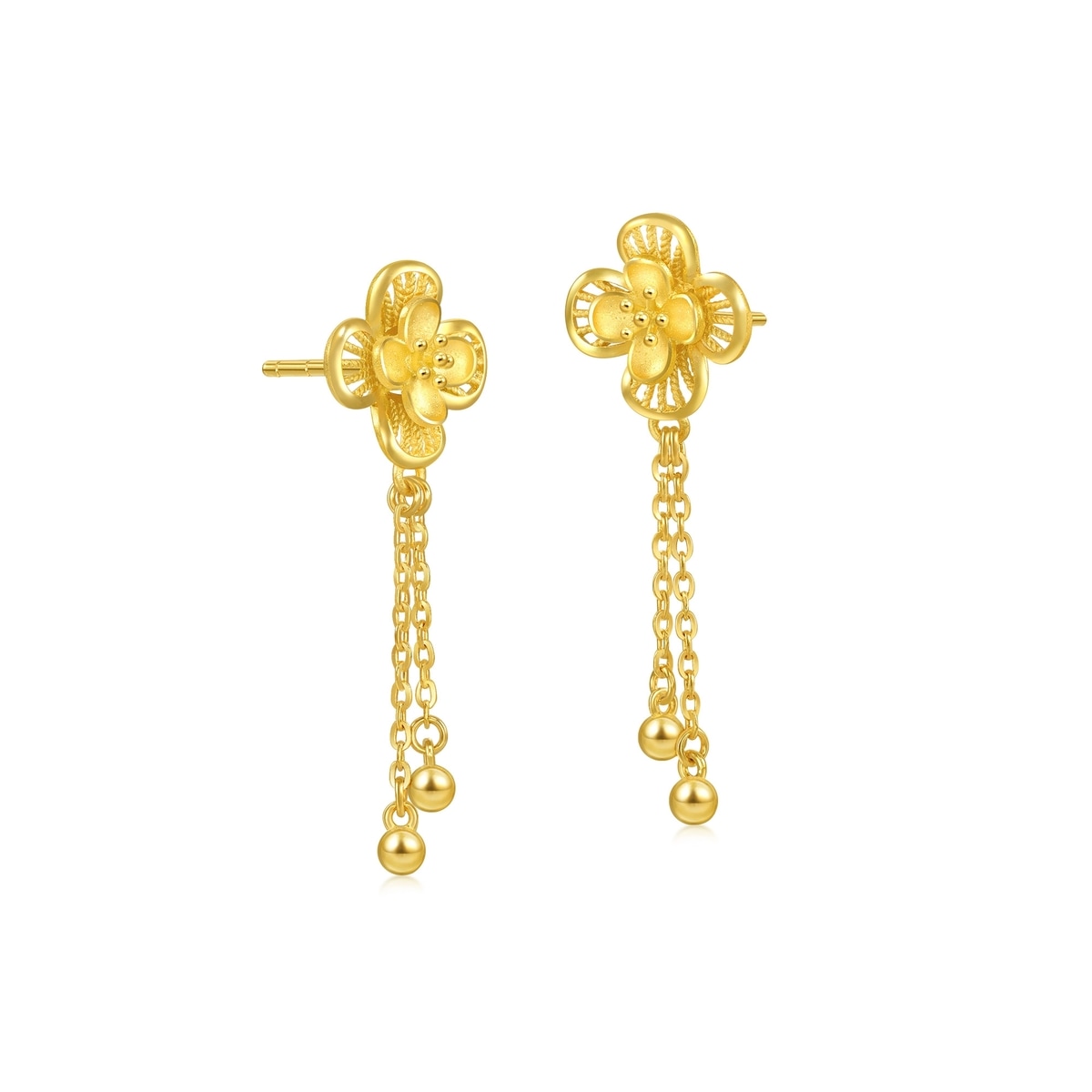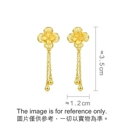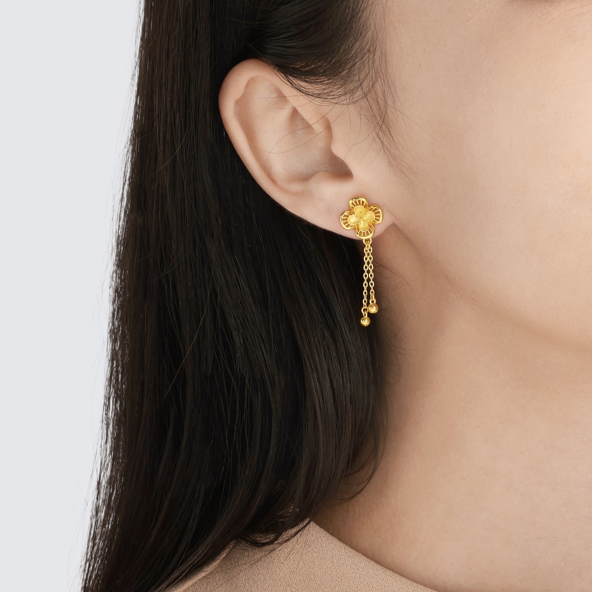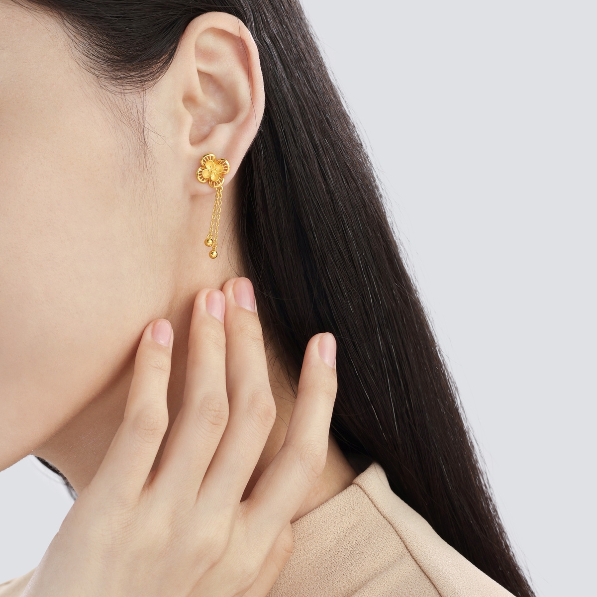 周生生足金耳環以象徵純潔愛情的丁香花為設計靈感,花卉紋理細膩,結合鏤空設計,增加立體感,流蘇隨之搖曳,打造靈動優雅的別緻造型,寓意新人永結同心、甜甜蜜蜜、幸福滿載。