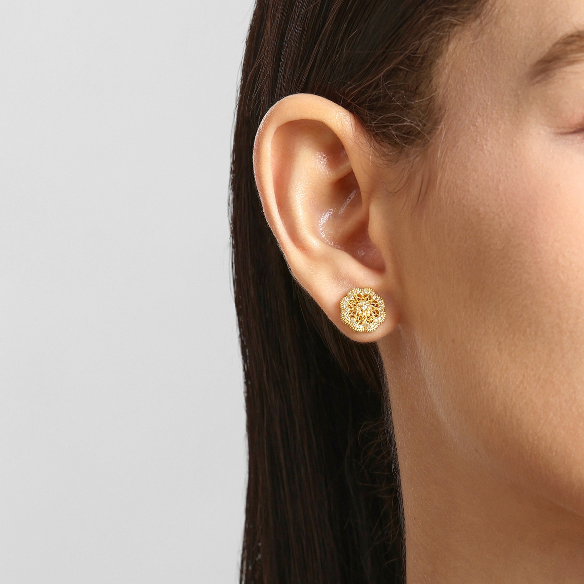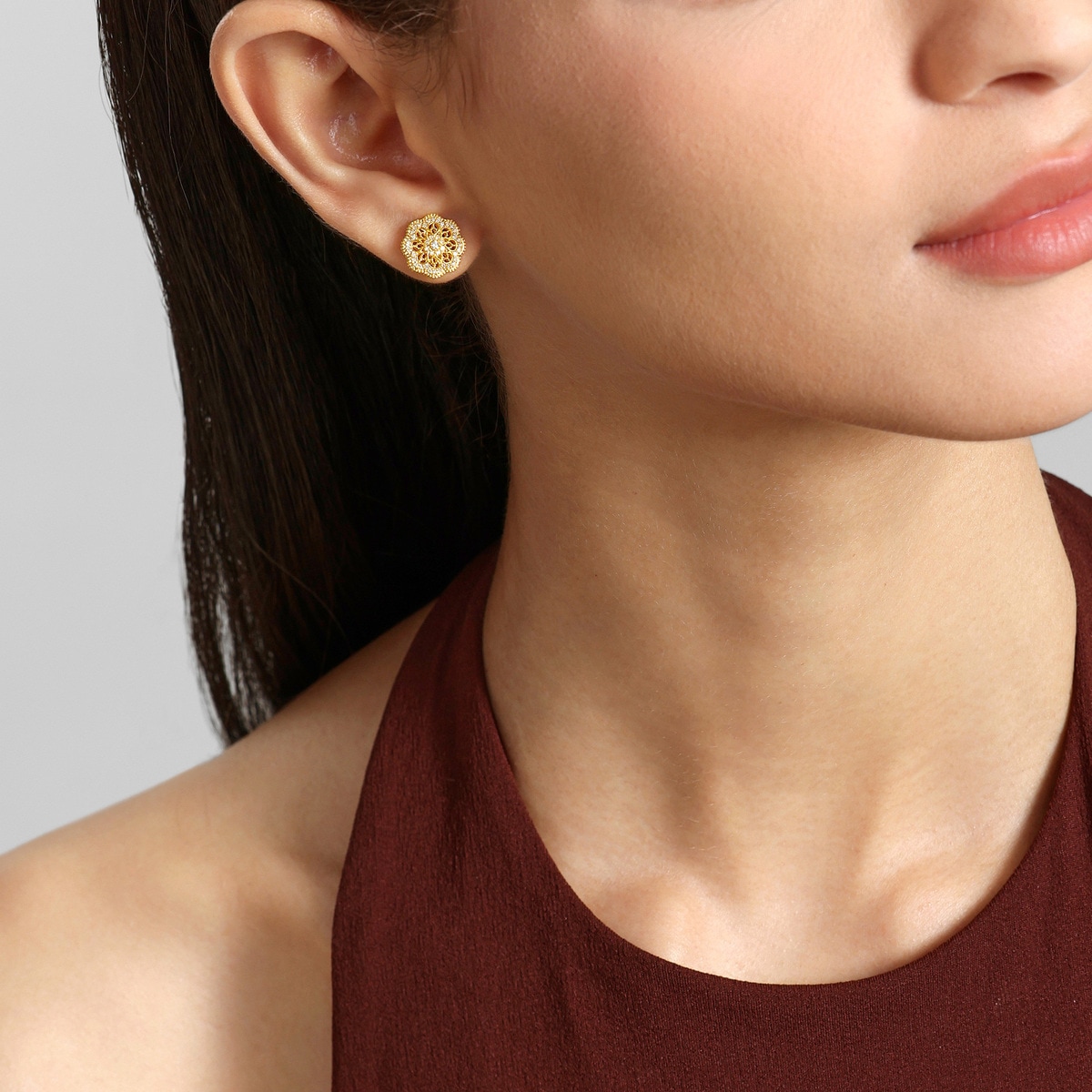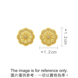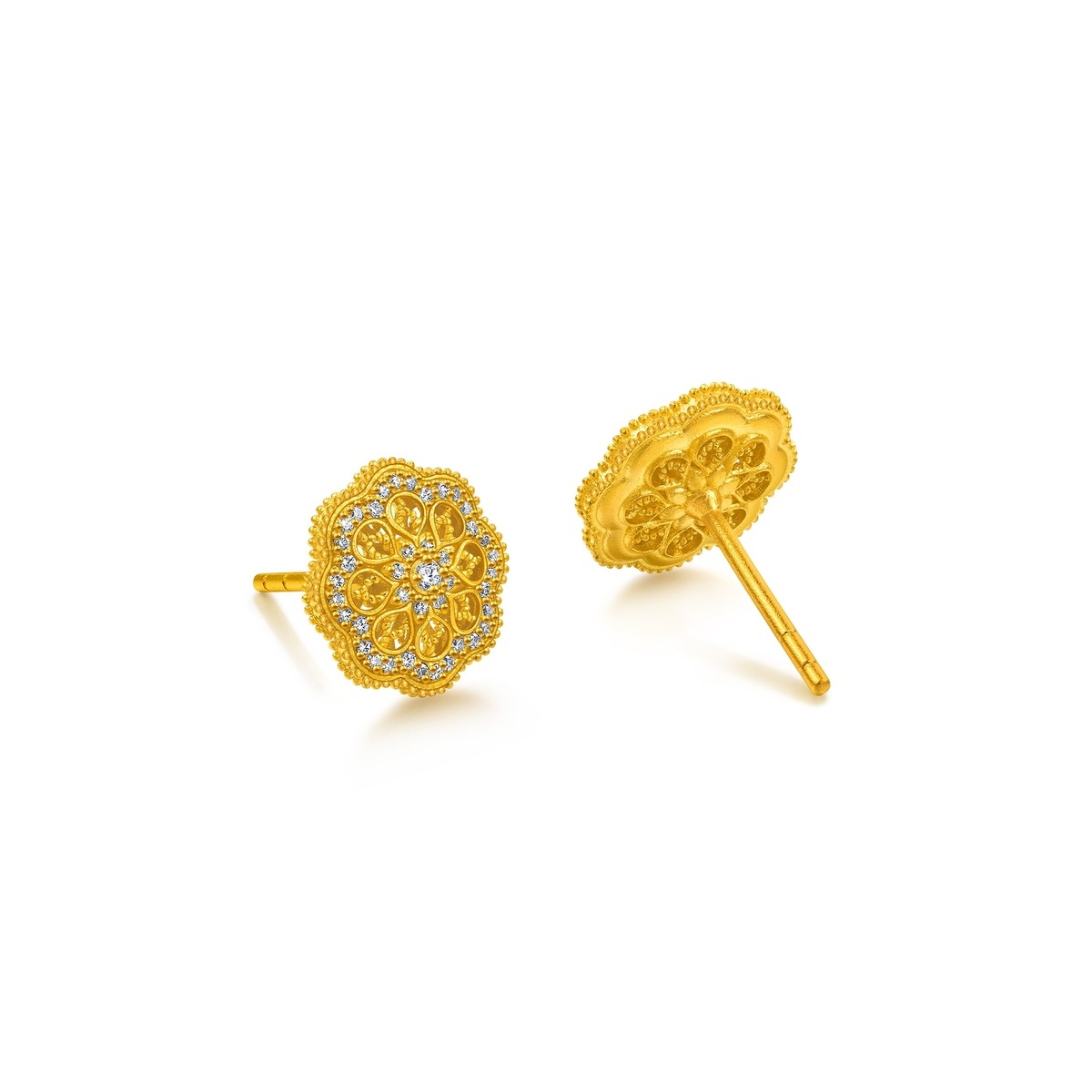 周生生足金鑽石耳環靈感源自佛教「曼陀羅」圖騰,採用古祖黃金及花絲鏤空工藝,細膩呈現圖案的對稱平衡之美。曼陀羅在梵文中意為「圓」,由幾何線條重複建構而成,無窮無盡、生生不息,象徵宇宙的秩序與和諧,被視為擁有聖神的力量,代表為身心帶來安寧、守護與祝福。