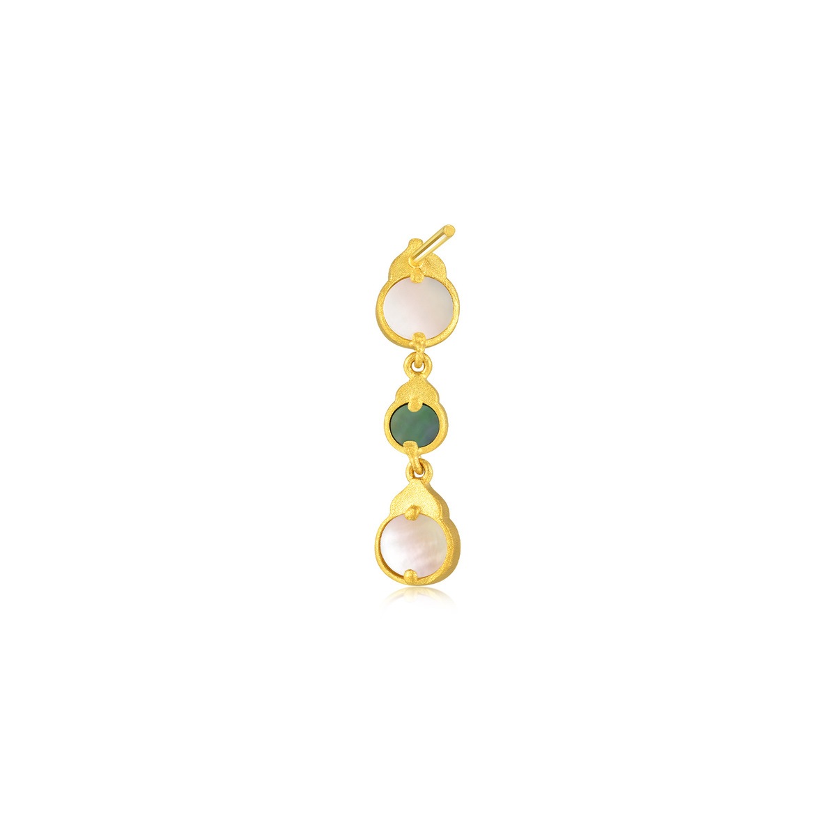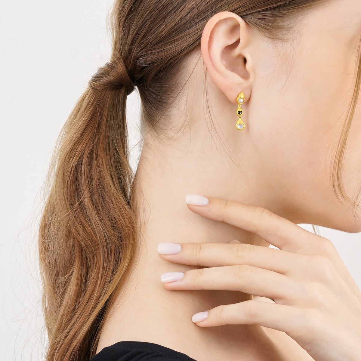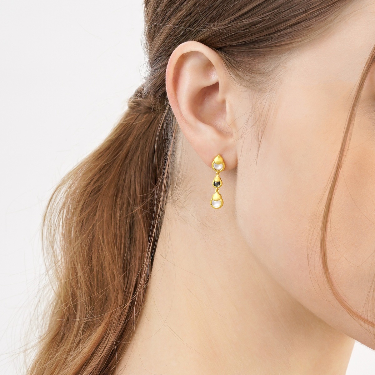 周生生足金葫蘆耳環,特別採用黑白貝母相互映襯,工藝精巧細緻,對比鮮明奪目、別樹一幟,「葫蘆」為中國傳統吉祥器物,與「福祿」諧音,寓意「福祿雙全、富貴吉祥」,滿載對家庭及健康的無限祝福。