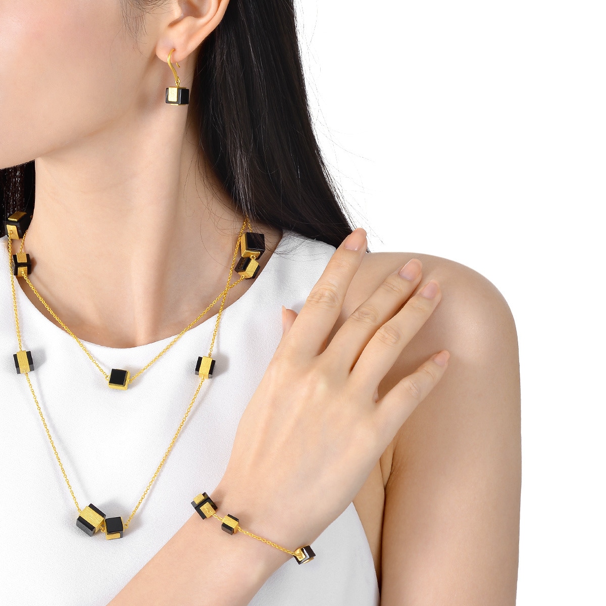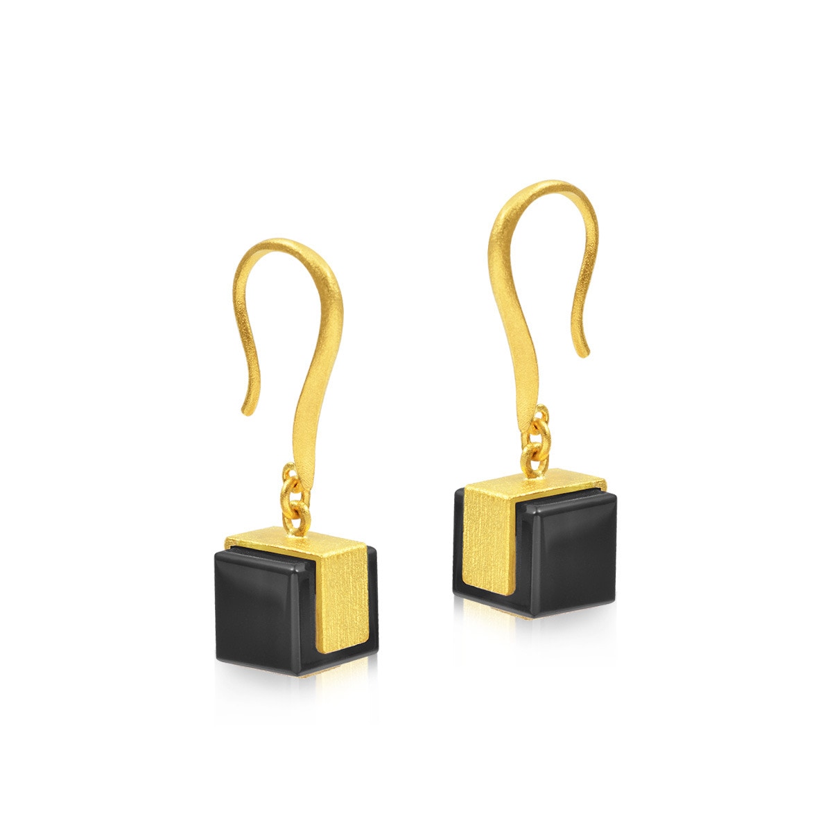 耳環線條流麗,以拉絲工藝將黃金與方形黑玉髓完美糅合,垂吊效果讓女士每一步也能散發出都市動感。