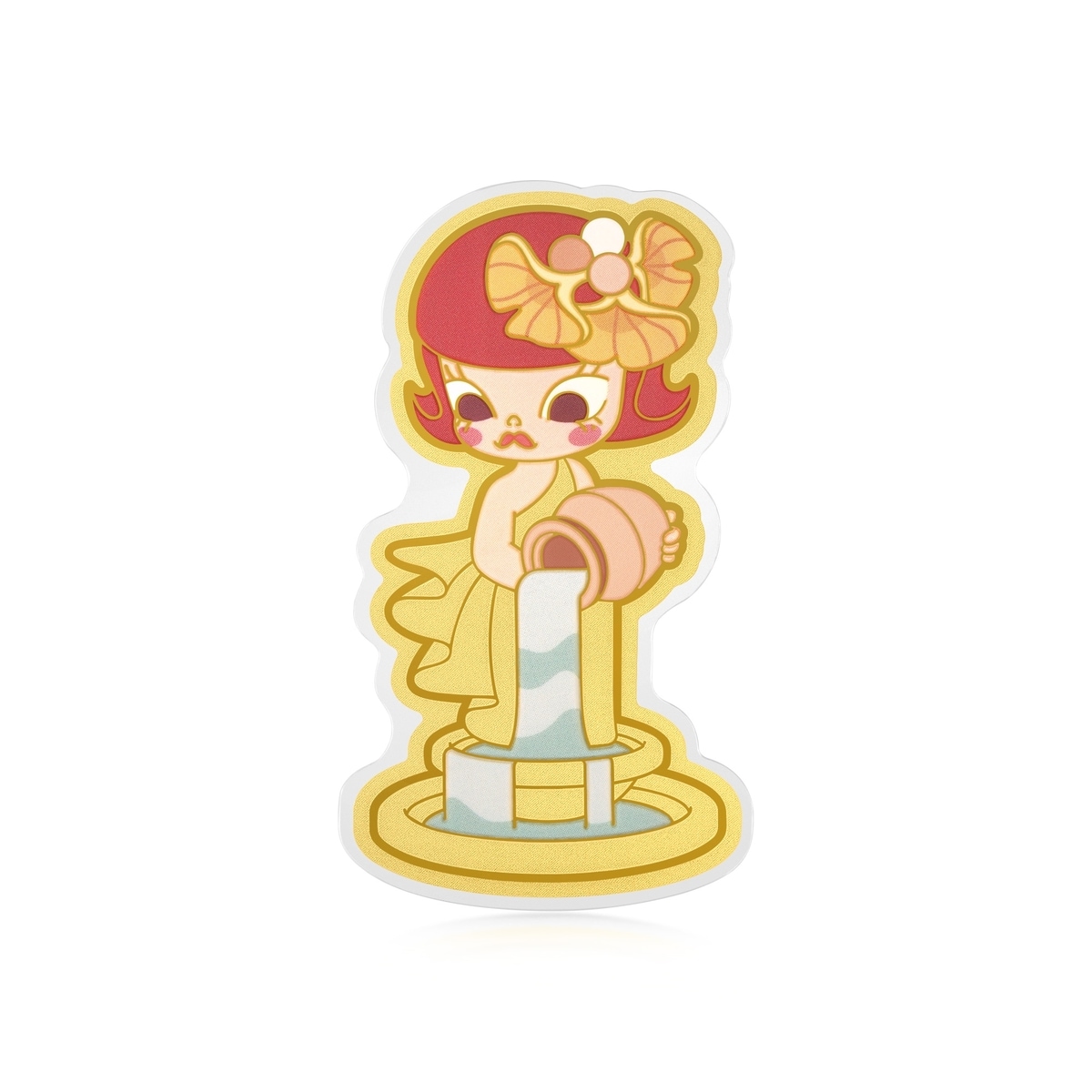 周生生足金金片設計源自 POP MART 經典角色 MOLLY,特別以彩繪塗層賦予繽紛色彩,表面結合磨砂及拋光處理工藝,呈現豐富層次與質感,細膩表現戴上銀杏葉頭飾的 MOLLY 造型,感受如水般恬靜生活的美好。