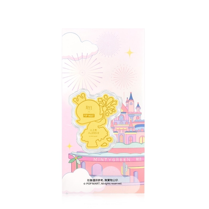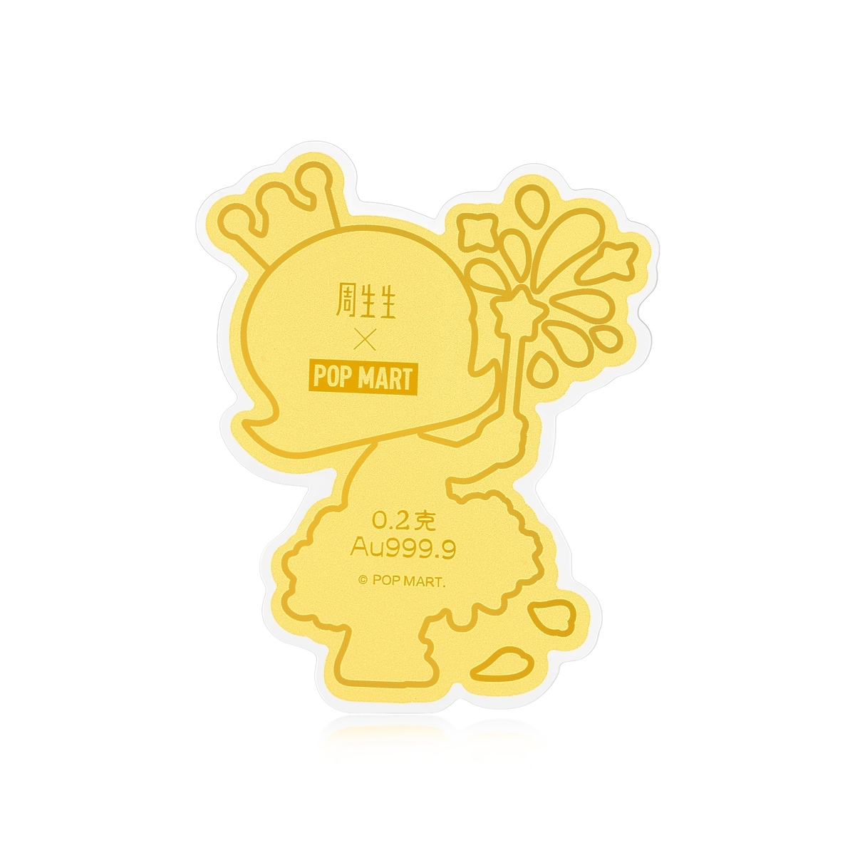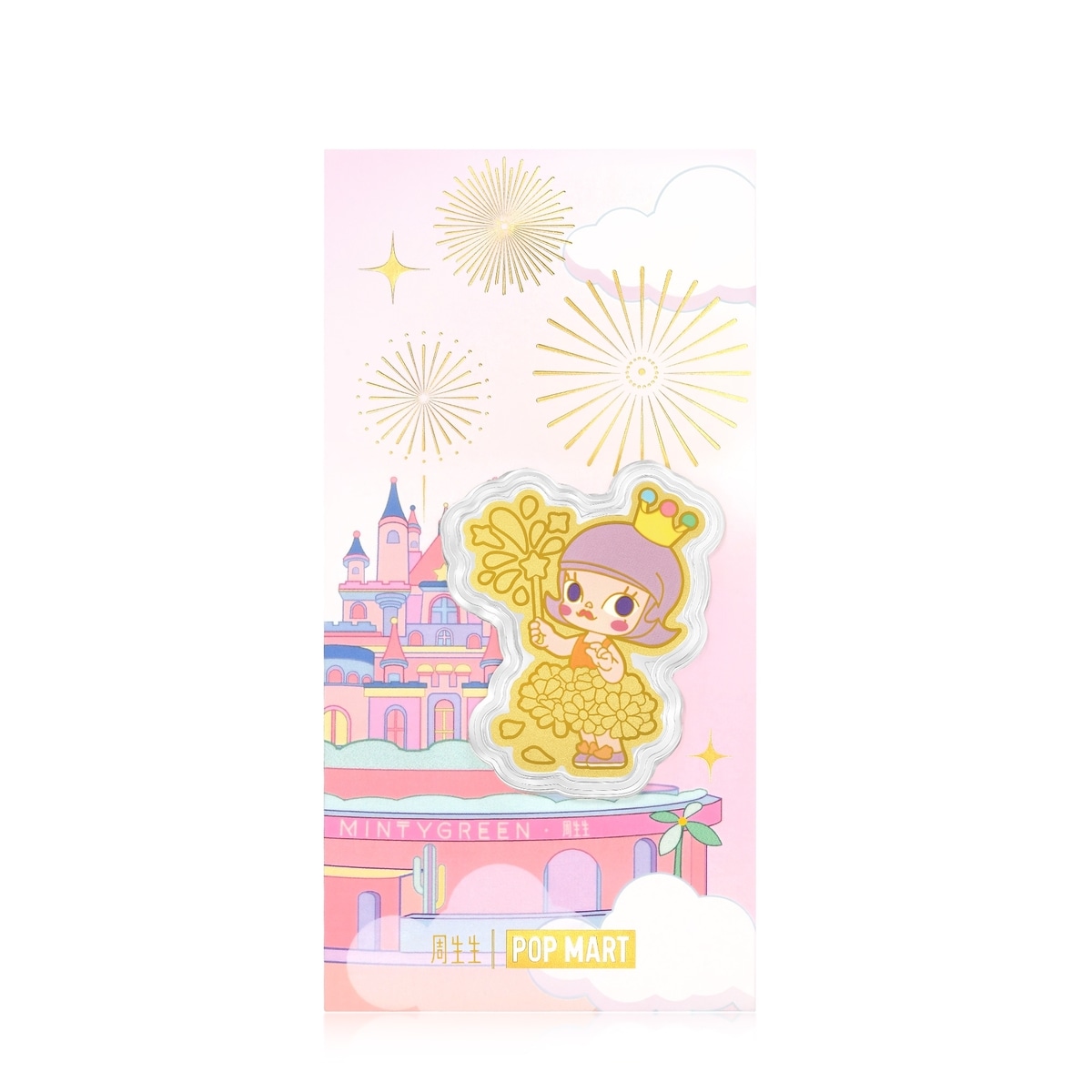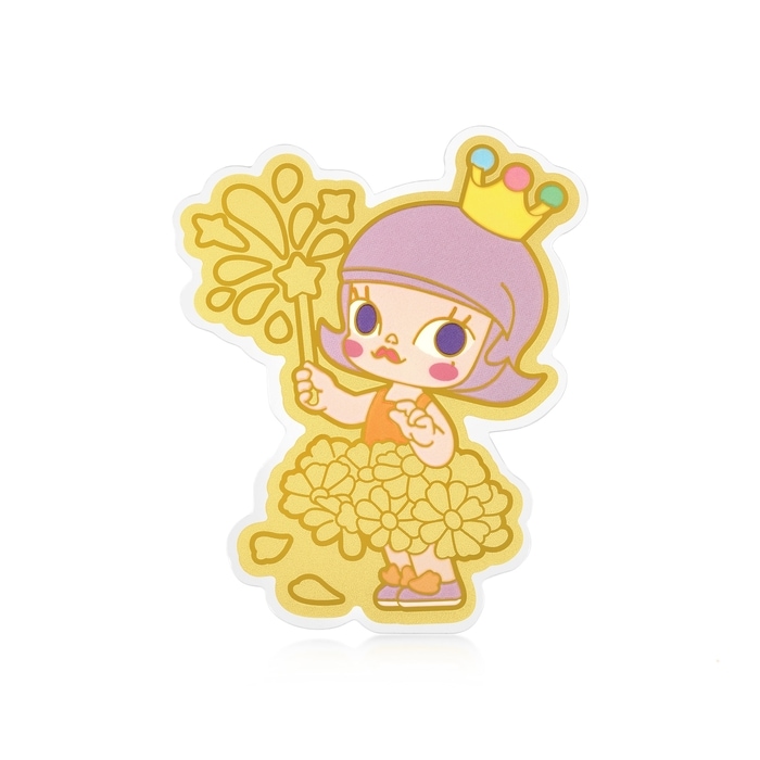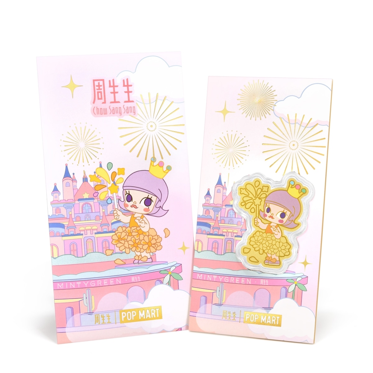 周生生足金金片設計源自 POP MART 經典角色 MOLLY,特別以彩繪塗層賦予繽紛色彩,表面結合磨砂及拋光處理工藝,呈現豐富層次與質感,細膩表現點燃一束絢爛煙花的 MOLLY 造型,表露出甜甜的童真笑顏。