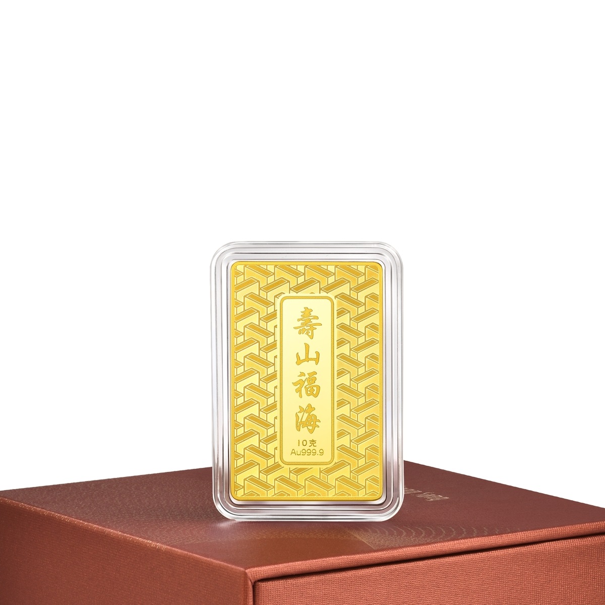 周生生足金金片融合「壽」字及傳統紋樣設計,採用多層沖壓工藝及多種表面處理,營造出層次豐富的立體視覺效果,質感精緻細膩。正面以百壽圖為造型,背面以工字紋映襯「壽山福海」四字祝福,寓意福壽延年、長壽多福,極具收藏價值。
