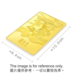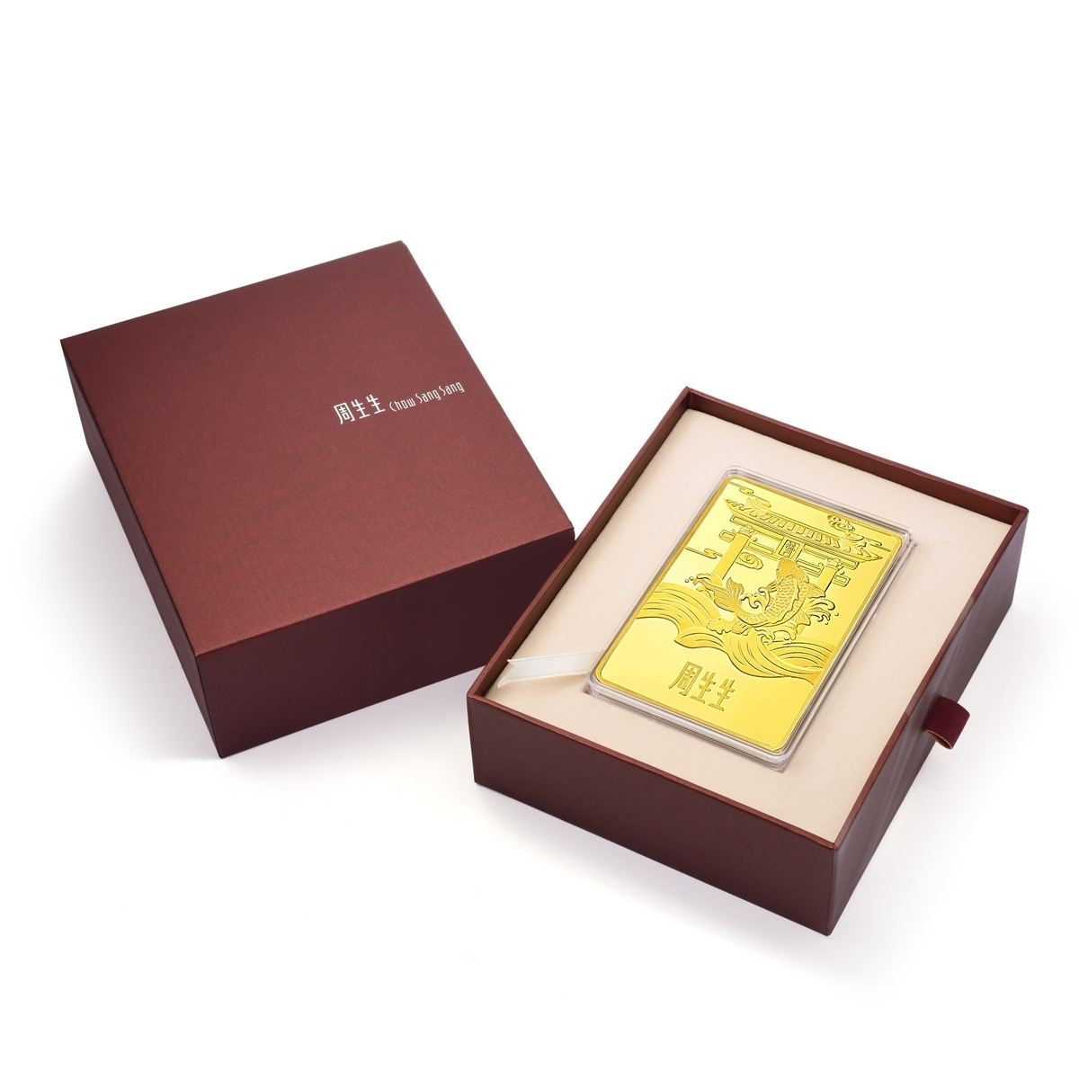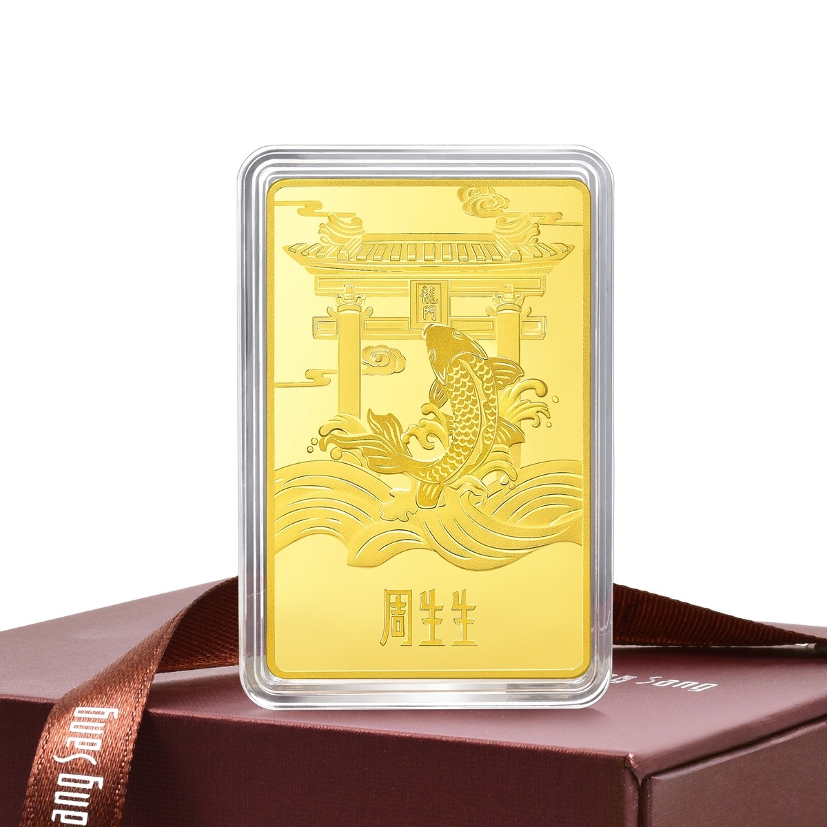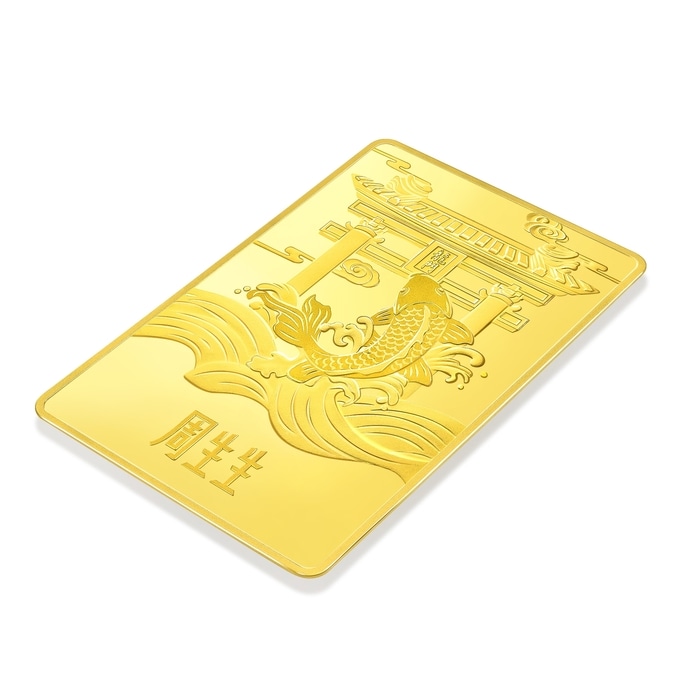 周生生足金金片以「魚躍龍門」的吉祥意象為設計元素,特別採用光砂面處理及浮雕工藝,細膩呈現鯉魚跳躍的造型,金片背面綴滿海浪紋飾,刻有「魚躍龍門」四字祝賀,寓意堅持不懈、奮發向上,極具收藏價值。