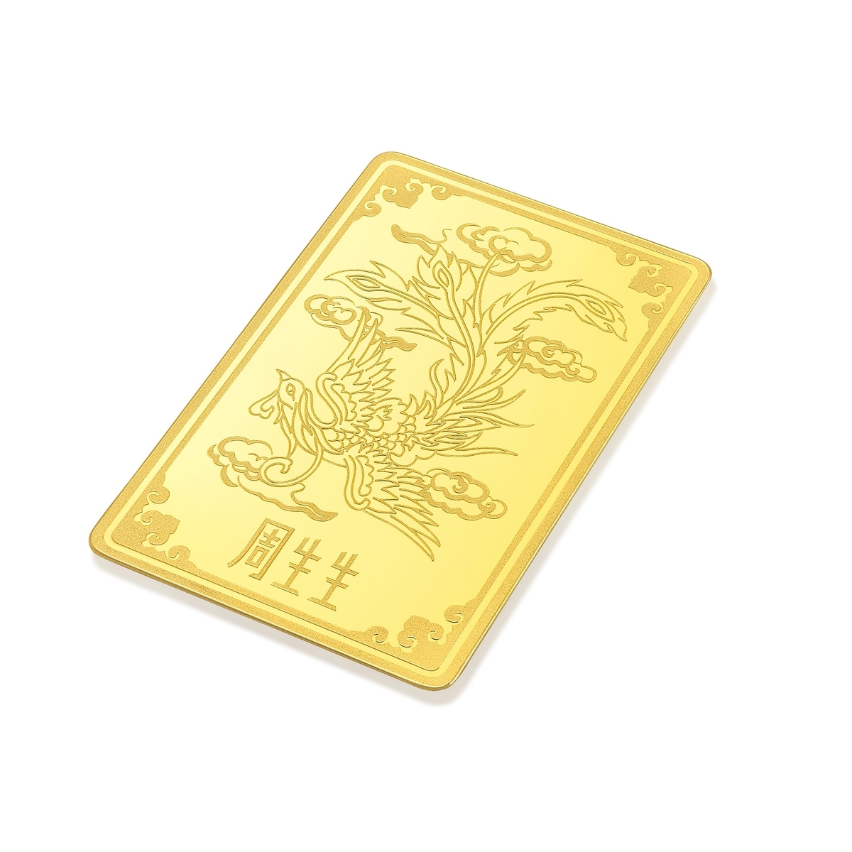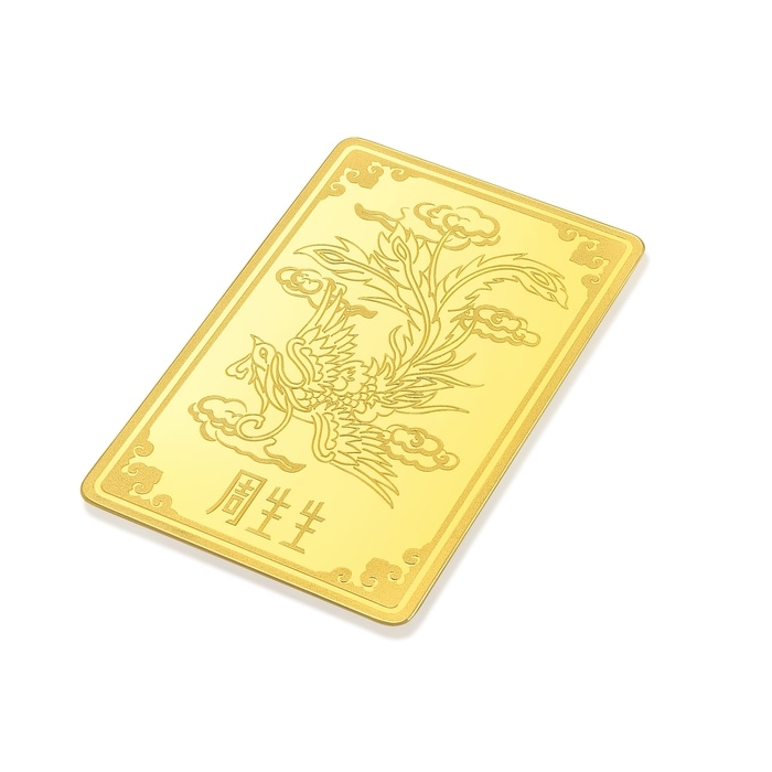 周生生足金金片以「鳳凰」為創作元素,鳳乃中國傳統四大瑞獸之一,位居百鳥之首,是吉祥和諧的象徵,代表生活幸福、愛情美滿。背面設計特別糅合「四合如意」造型,蘊含「四方合一、平安如意」的豐富寓意。金片巧妙結合光面、砂面與浮雕三種表面處理工藝,鳳凰造型靈動傳神,是個人收藏或禮贈摯親的珍品。
