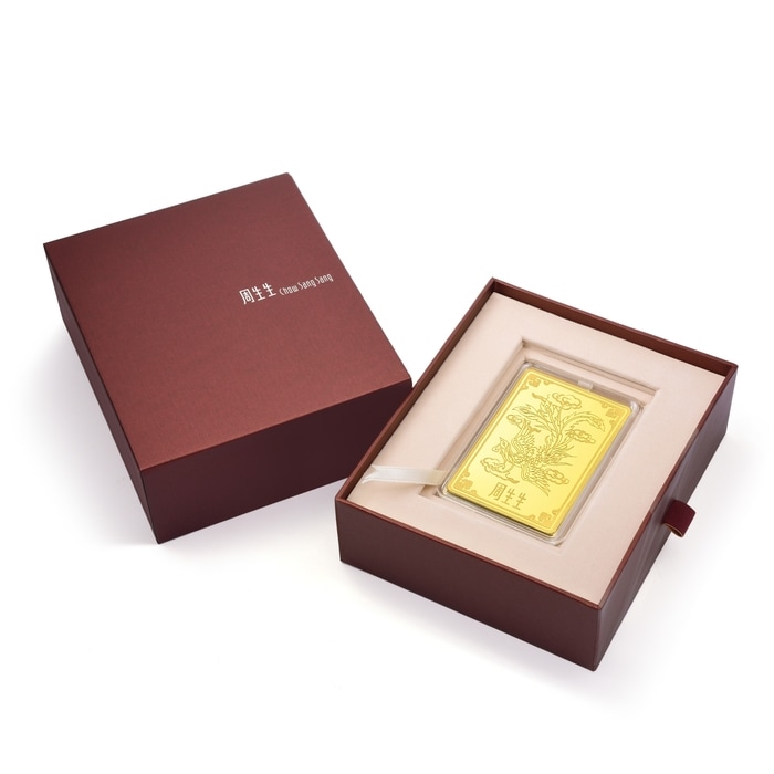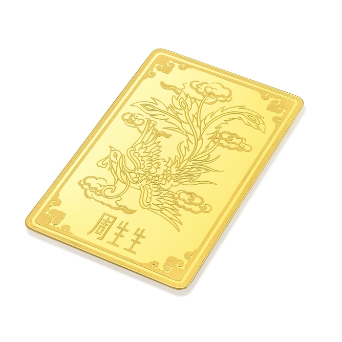 周生生足金金片以「鳳凰」為創作元素,鳳乃中國傳統四大瑞獸之一,位居百鳥之首,是吉祥和諧的象徵,代表生活幸福、愛情美滿。背面設計特別糅合「四合如意」造型,蘊含「四方合一、平安如意」的豐富寓意。金片巧妙結合光面、砂面與浮雕三種表面處理工藝,鳳凰造型靈動傳神,是個人收藏或禮贈摯親的珍品。