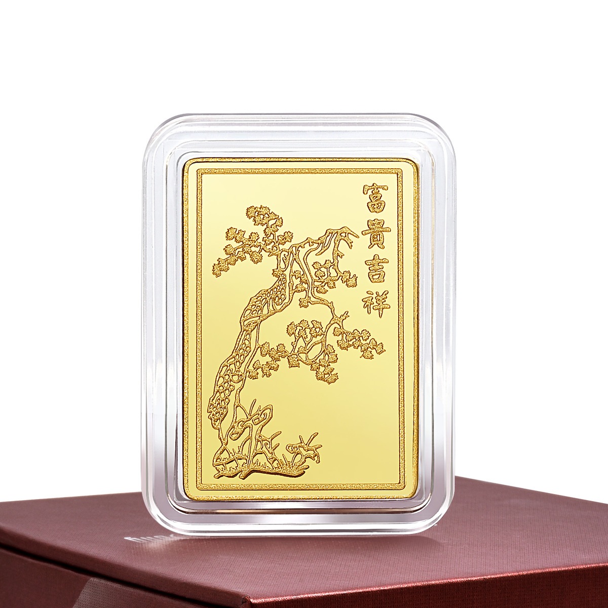 以 999.9 黃金打造的靈雞金片,以剪紙及雕刻手法,把靈雞圖案活靈活現展示於金片上,寓意吉祥如意,從而表達對新一年的憧憬和展望。金片背面的長青松柏圖,象徵著中國傳統文化中「松柏延年」的祝願。