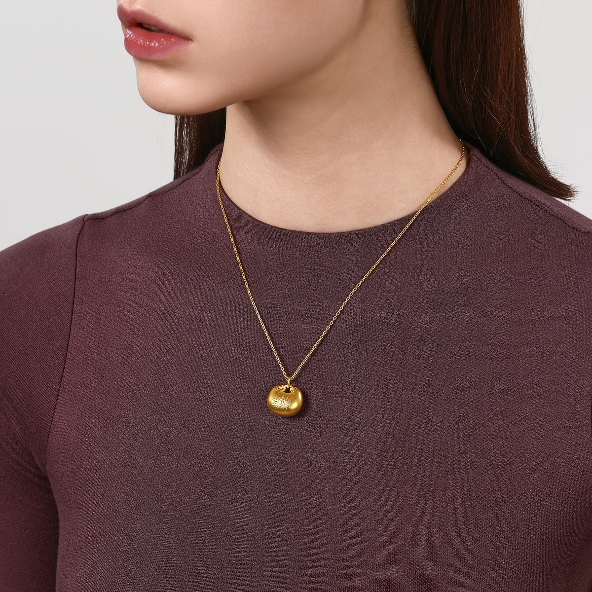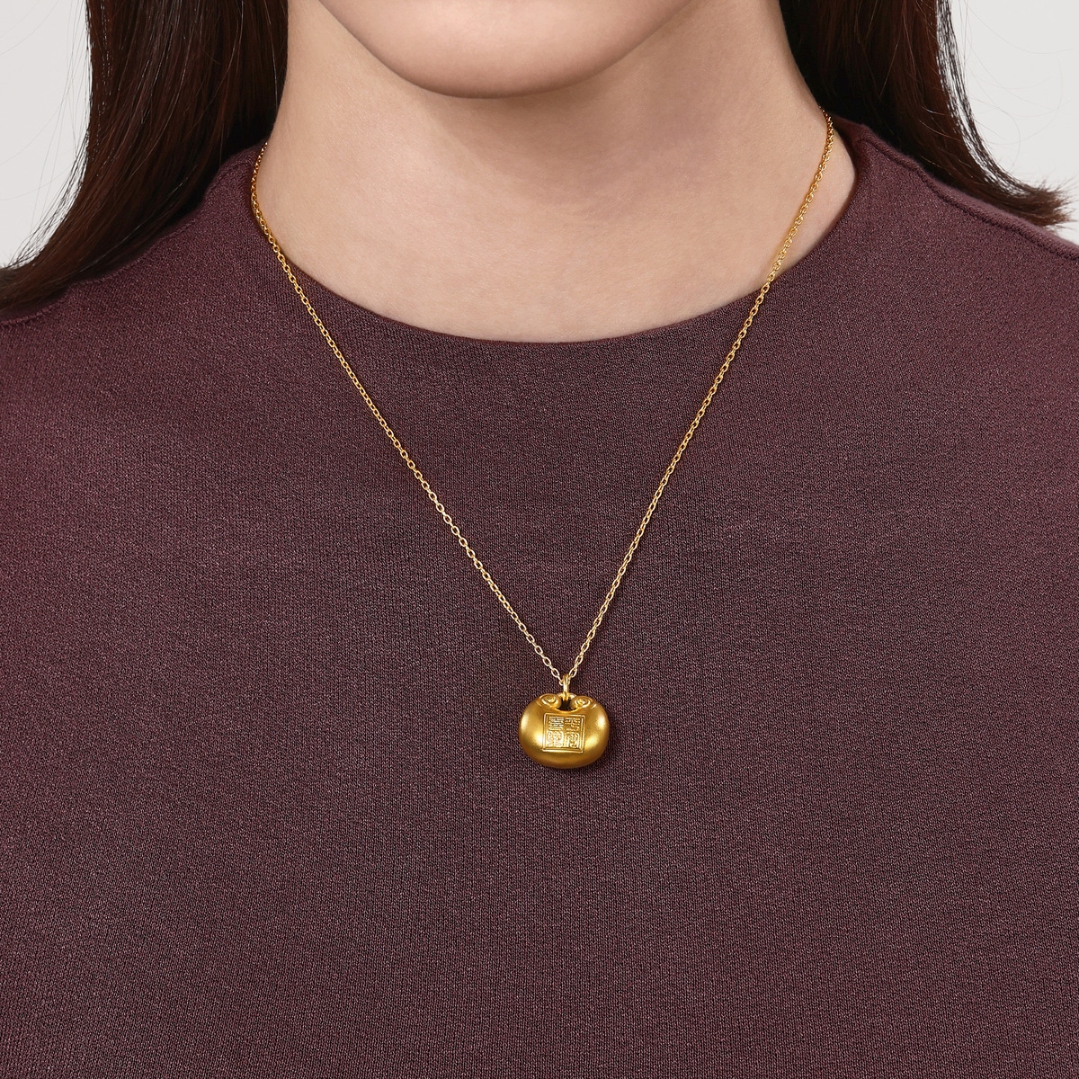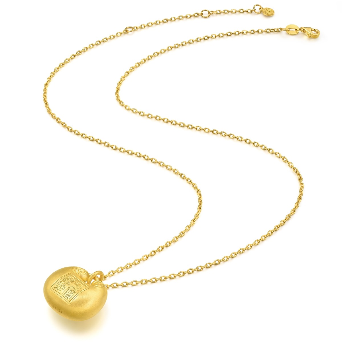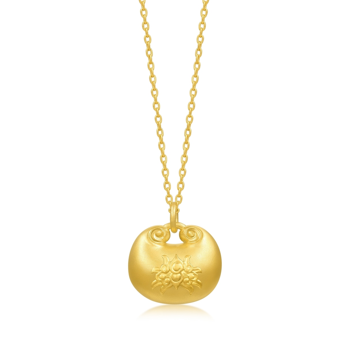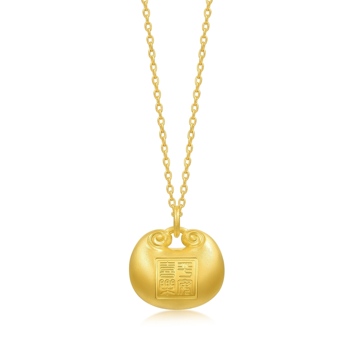 周生生足金頸鍊以如意鎖包為設計元素,採用古祖黃金工藝,賦予細緻啞光質感,別具東方文化韻味。如意鎖造型飽滿圓潤,表面刻鑄「平安喜樂」的篆刻印章圖案,結合專屬「竹」「蝠」印記,蘊藏平安、吉祥、如意的美好祝福。