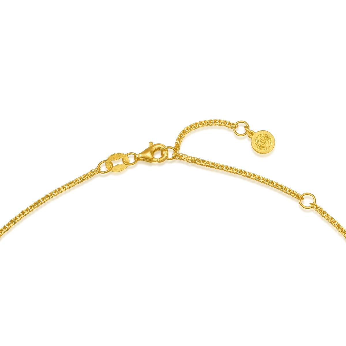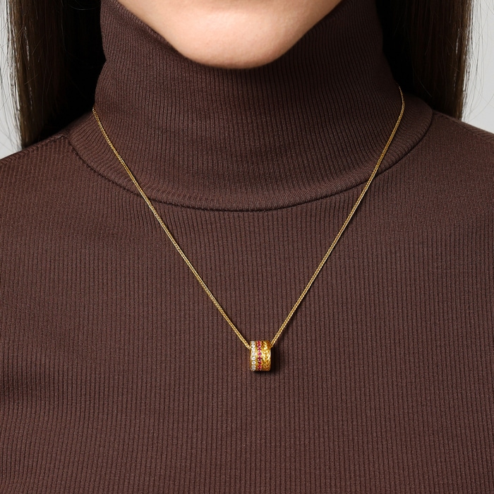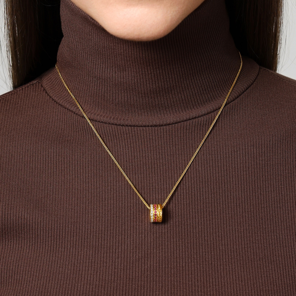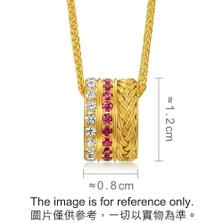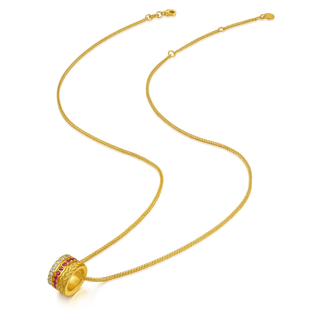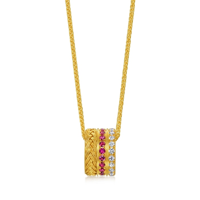 周生生足金鑽石拼紅寶石頸鏈以古祖黃金工藝打造,更以手工拉絲編織工藝交迭出立體有致的紋理,靈巧地將黃金細膩交纏。中間精鑲紅寶石,更添尊貴,蘊藏「腰纏萬貫」、「財源滾滾」的深遠寓意。