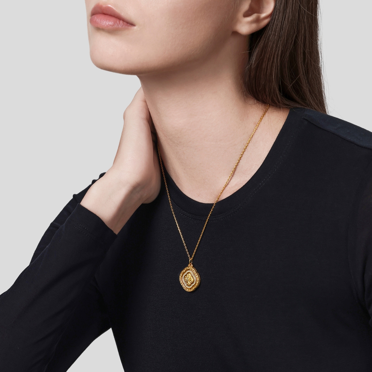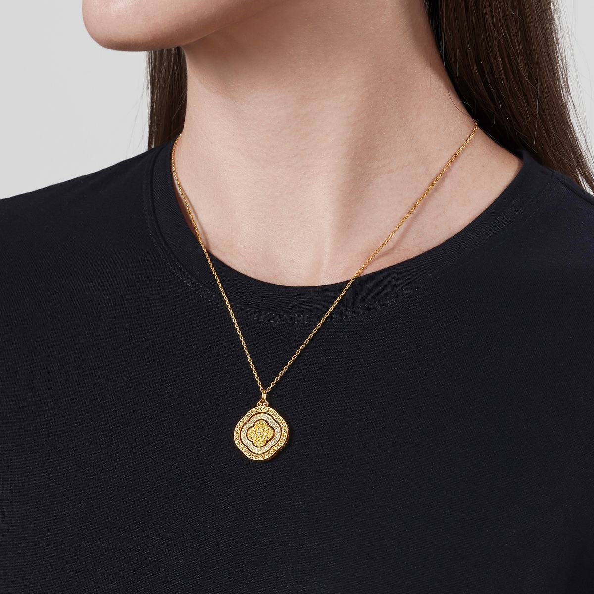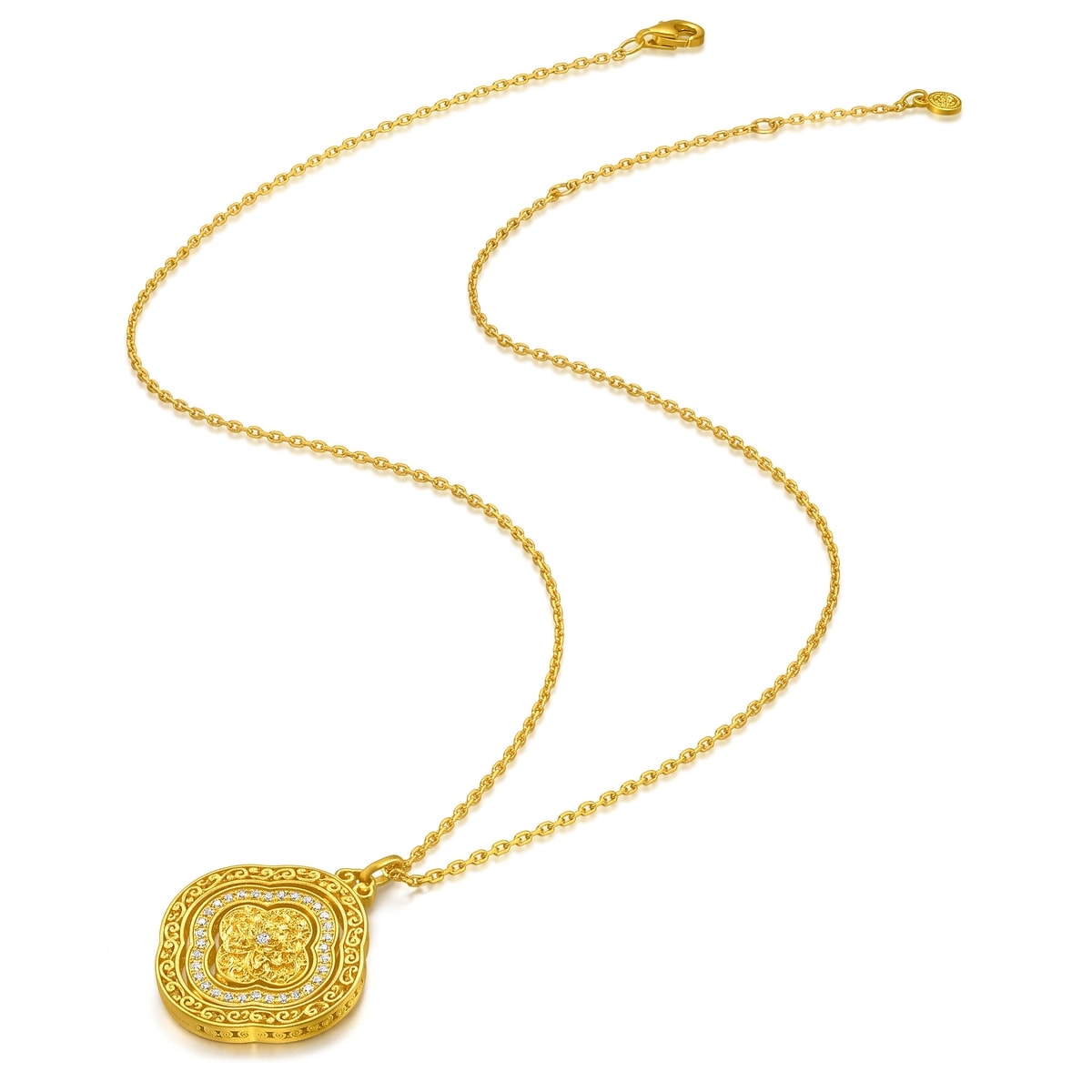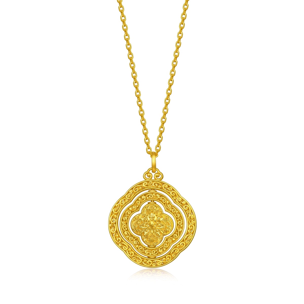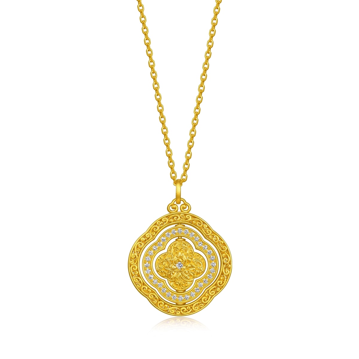 周生生足金鑽石頸鍊以四葉草層層圍繞,建構出別具宮廷風格的華麗花紋,採用古祖黃金工藝,以鏤空編織設計結合閃耀美鑽,造型華貴典雅,巧妙融合四合如意及寶相花圖騰,寓意四季如意、富貴吉祥。
