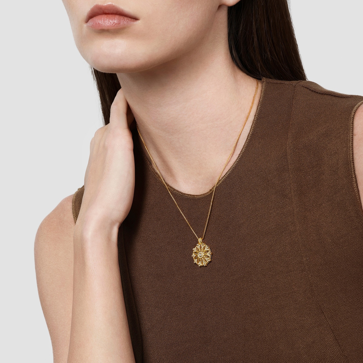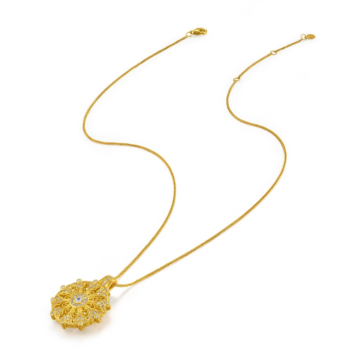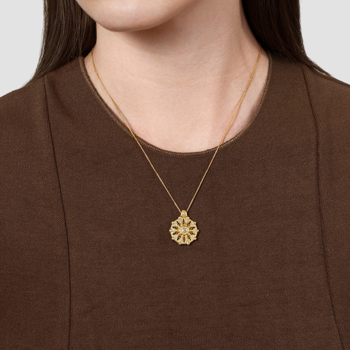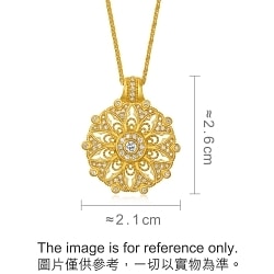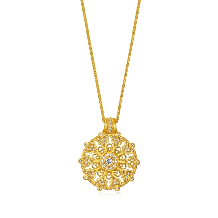周生生足金鑽石頸鍊靈感源自佛教「曼陀羅」圖騰,採用古祖黃金及花絲鏤空工藝,細膩呈現圖案的對稱平衡之美。曼陀羅在梵文中意為「圓」,由幾何線條重複建構而成,無窮無盡、生生不息,象徵宇宙的秩序與和諧,被視為擁有聖神的力量,代表為身心帶來安寧、守護與祝福。