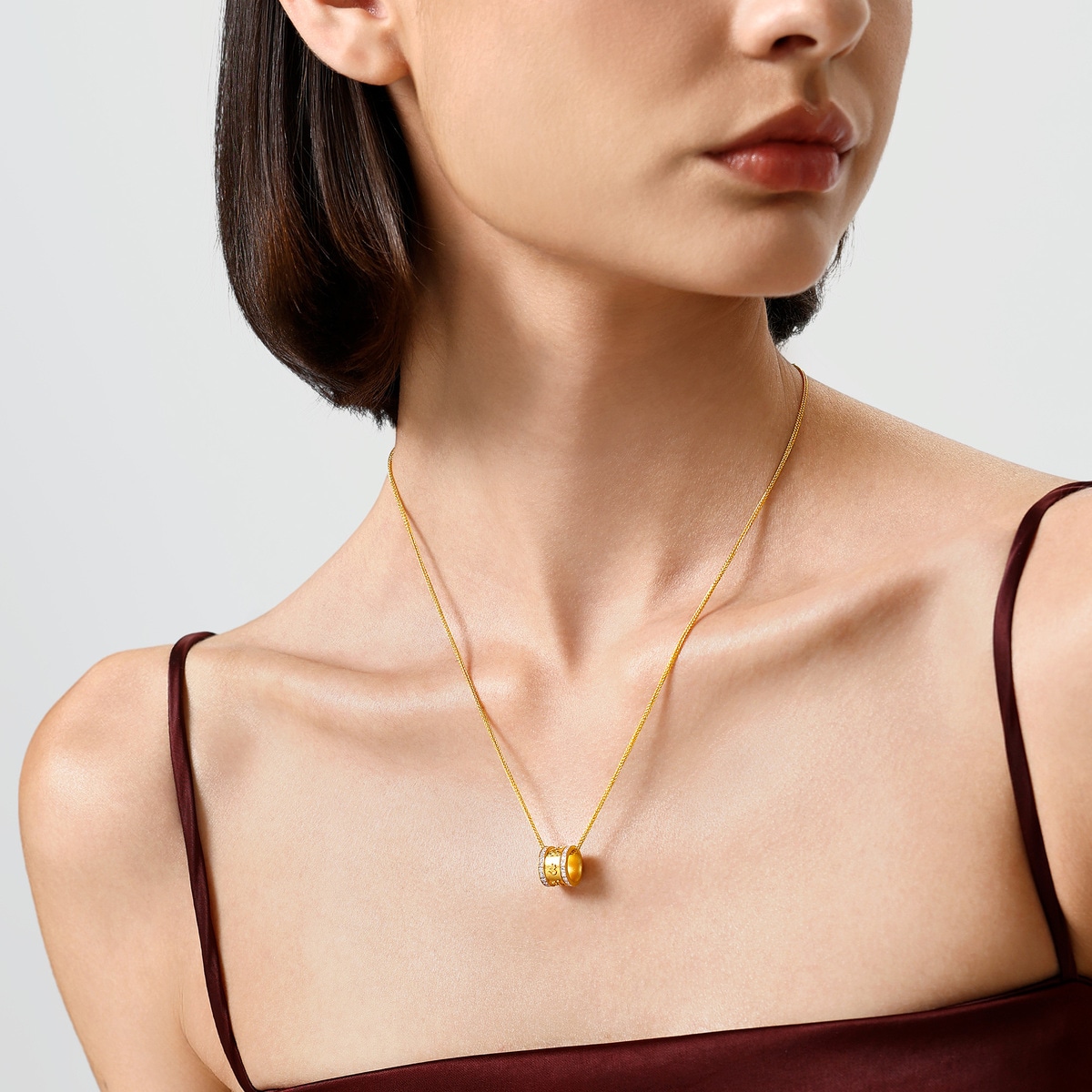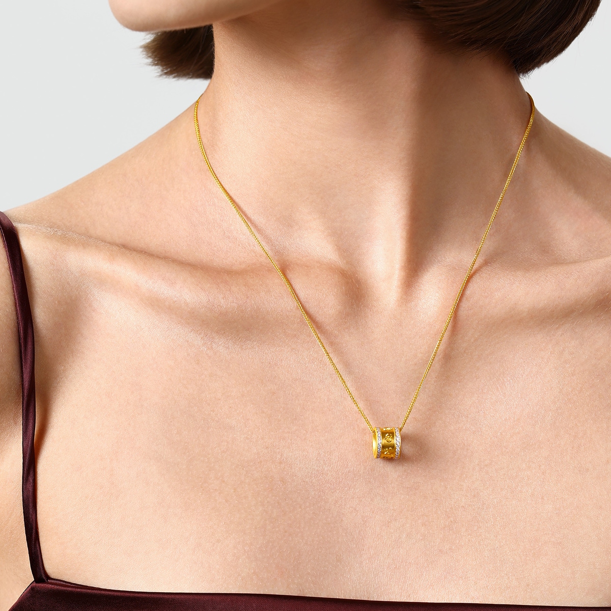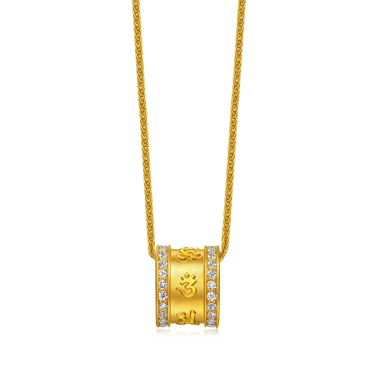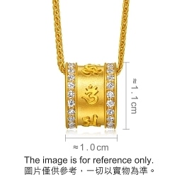 周生生足金鑽石頸鍊以佛教轉經筒為設計靈感,以古祖黃金工藝於經筒表面刻鑄立體大明咒六字真言「唵嘛呢叭咪吽」,左右兩側排鑲閃耀美鑽,質感精巧細緻。每一次轉動經筒,便猶如誦讀一遍經文,寓意祈求平安護身、幸福圓滿。