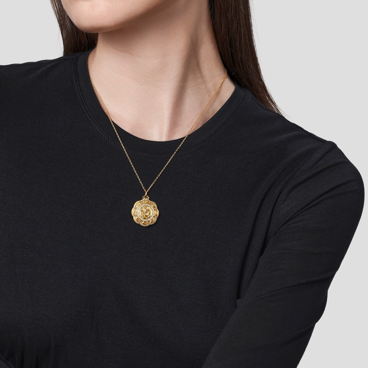 周生生足金鑽石頸鍊以通體花型鳳羽為設計,採用古祖黃金工藝精心打造,立體鏤空編織花紋結合美鑽光環,造型玲瓏別致,外圈繁花縈繞,襯托出鳳凰翔舞的意象,寓意花開富貴、富麗華美。