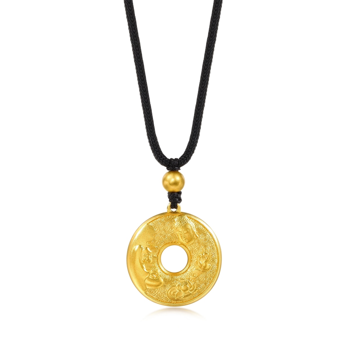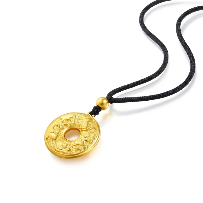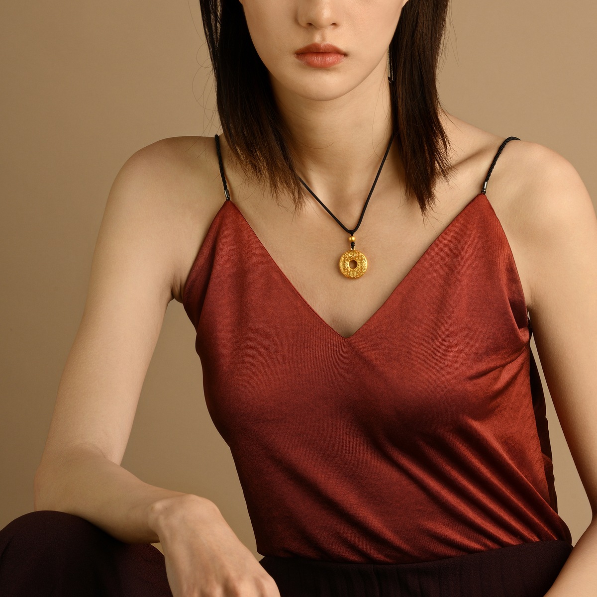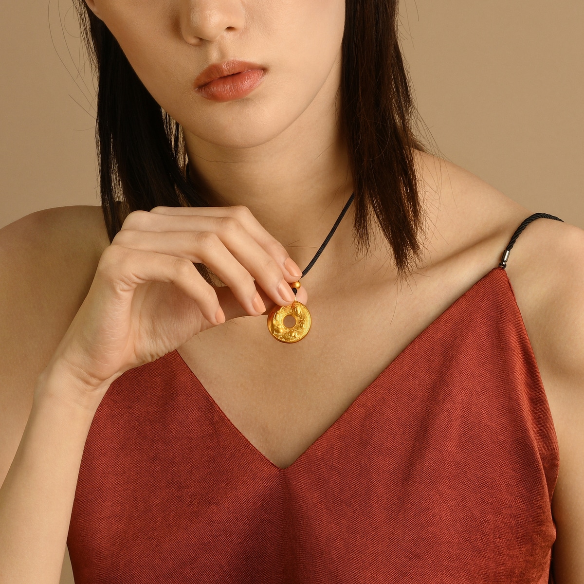 周生生以古祖黃金工藝打造的黃金頸鍊,表面呈啞光質感,藉此向傳統致敬,也呈現出一種東方文化韻味。頸鍊正面是達摩如來相,背面刻有平安如意,象徵福佑平安,配以粗頸繩,份量十足。