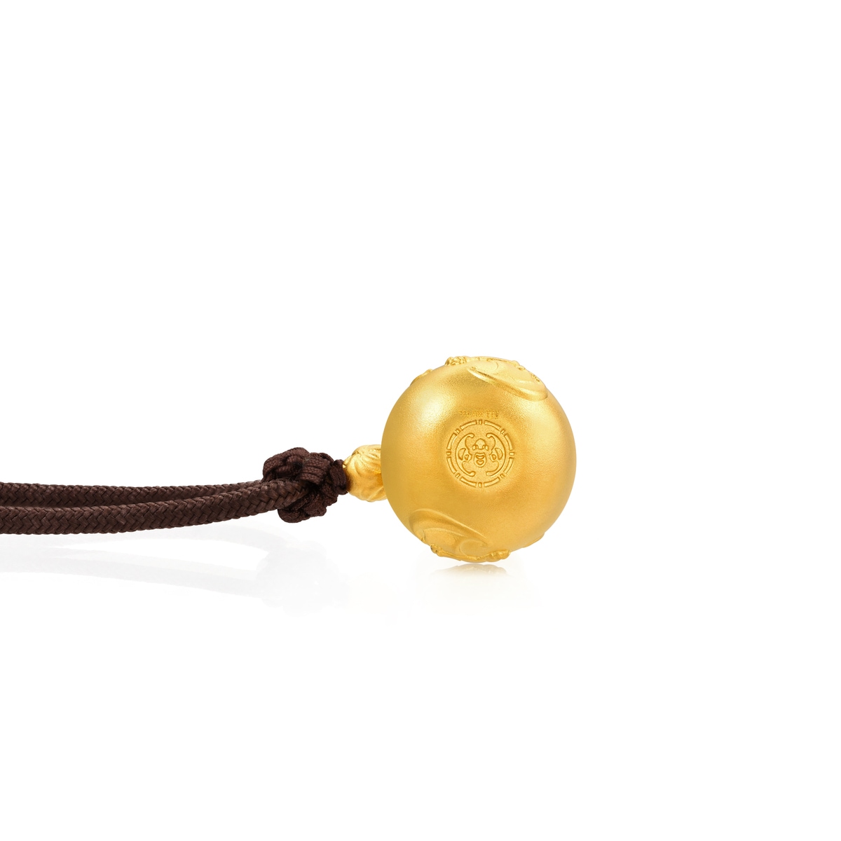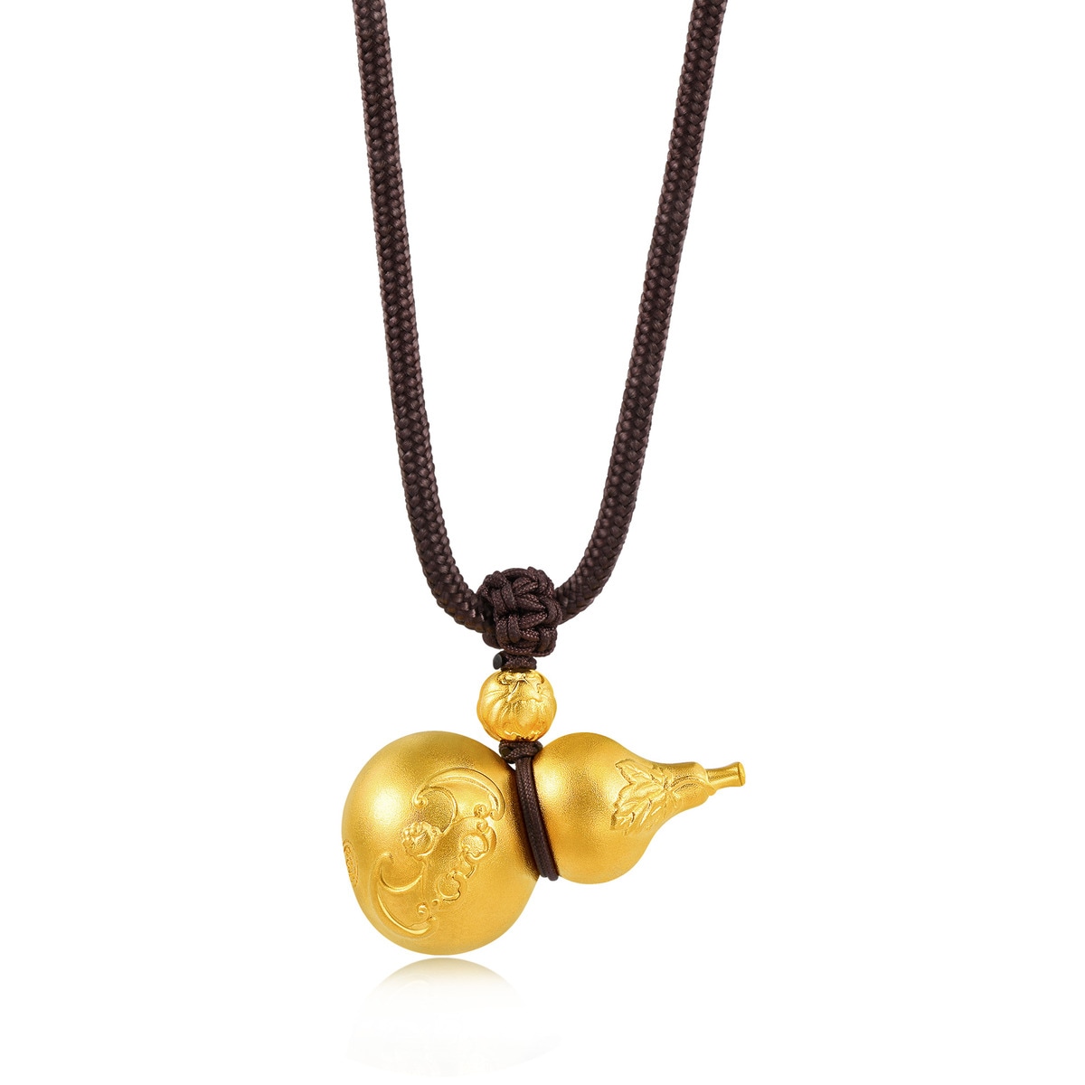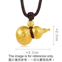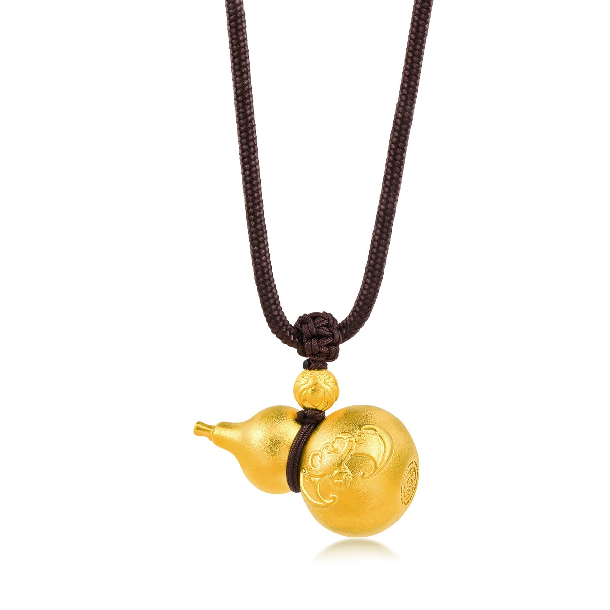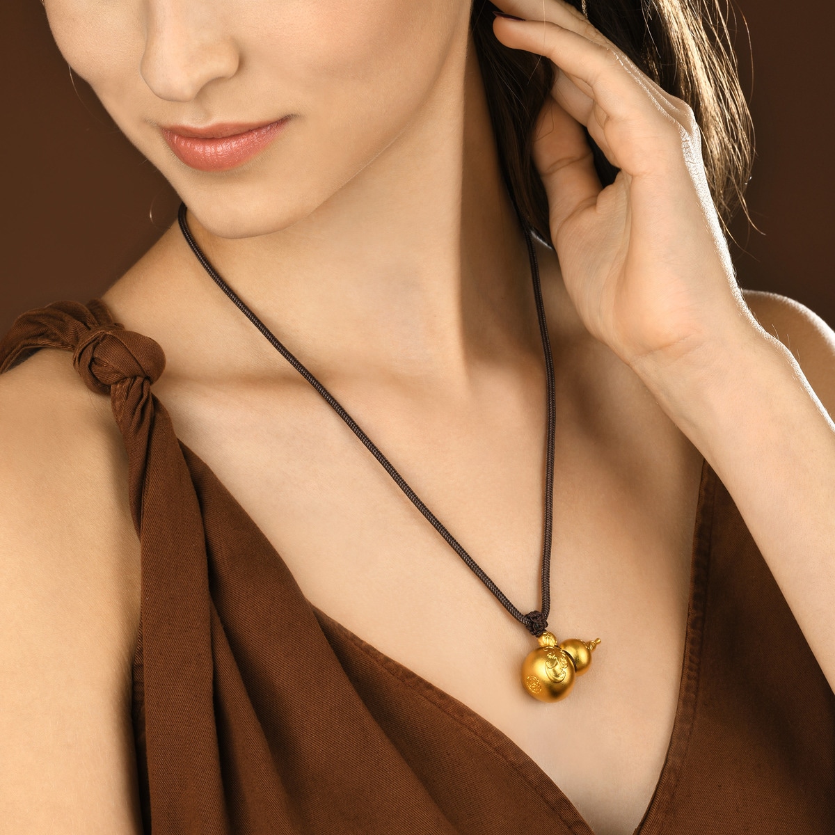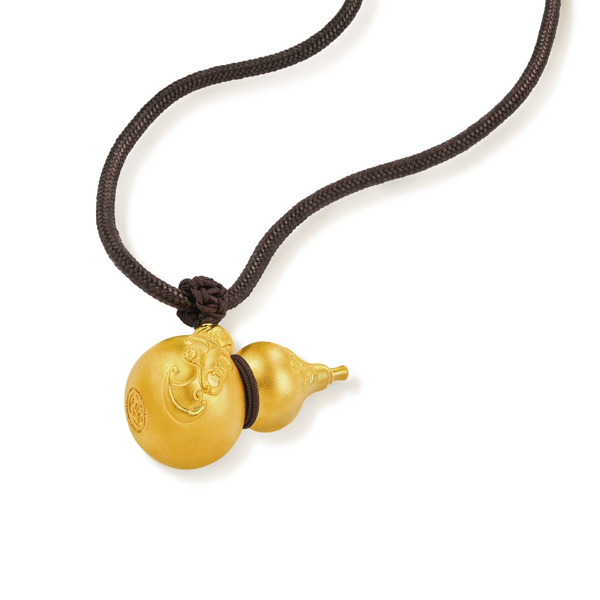 黃金「葫蘆」頸鍊搭配粗頸繩,份量十足。葫蘆表面刻有生氣勃勃的葫蘆葉與代表招福的福鼠,底部亦印上專屬「竹」「蝠」印記,寓意「祝福」滿滿。頸鍊以古祖黃金工藝打造,表面呈啞光質感,呈現出一種含蓄東方文化工藝韻味。