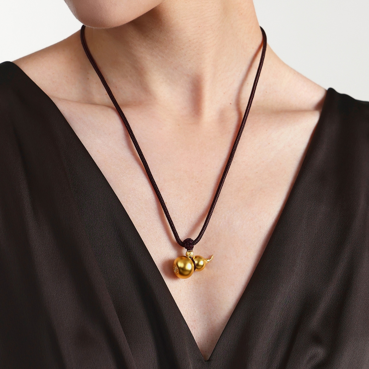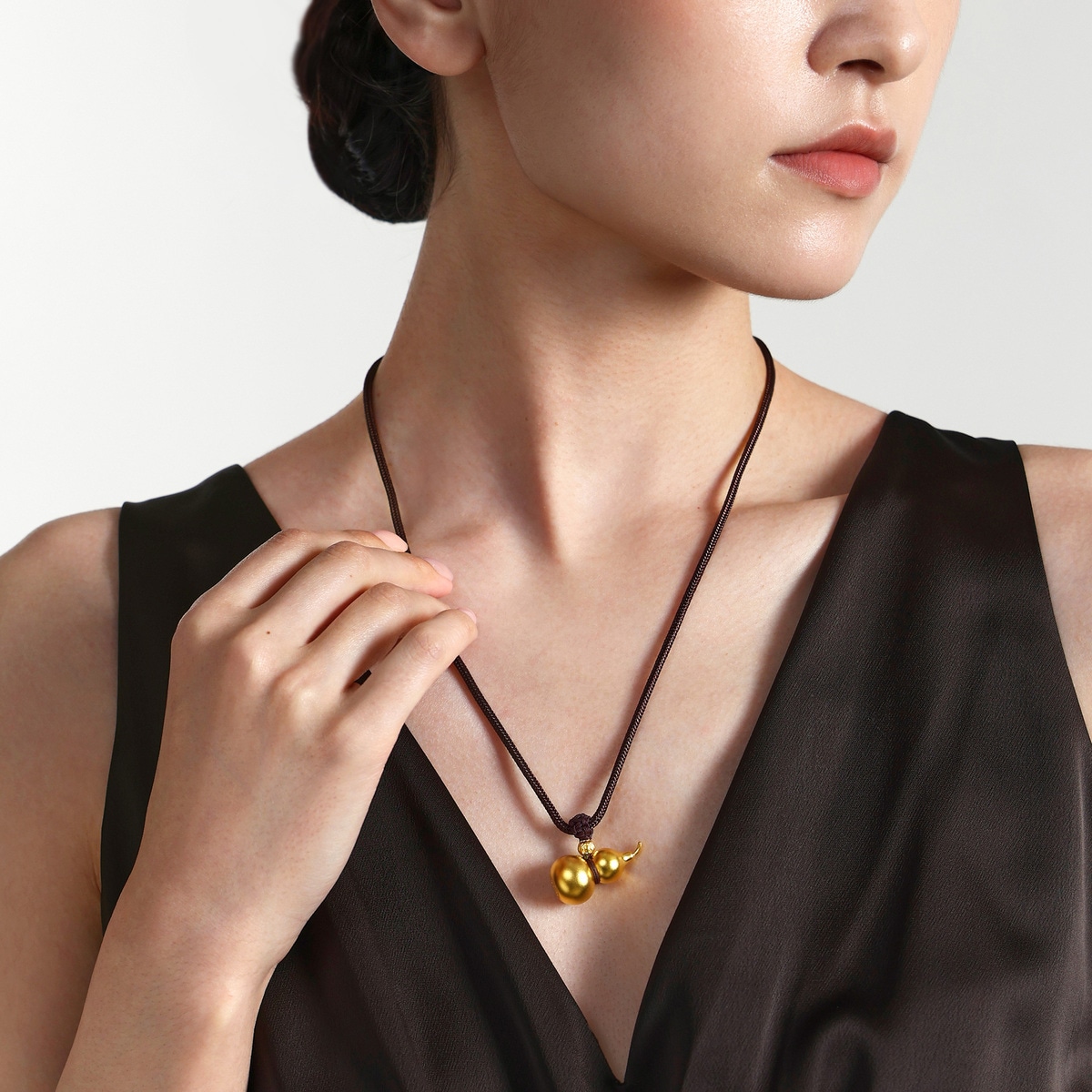 周生生黃金「葫蘆」頸鍊搭配粗頸繩,份量十足。葫蘆諧音「福祿」,寓意健康、長壽、平安、吉祥,底部印有專屬「竹」「蝠」印記,寓意「祝福」滿滿之意。頸鍊以古祖黃金工藝打造,表面呈啞光質感,呈現出一種含蓄東方文化工藝韻味。