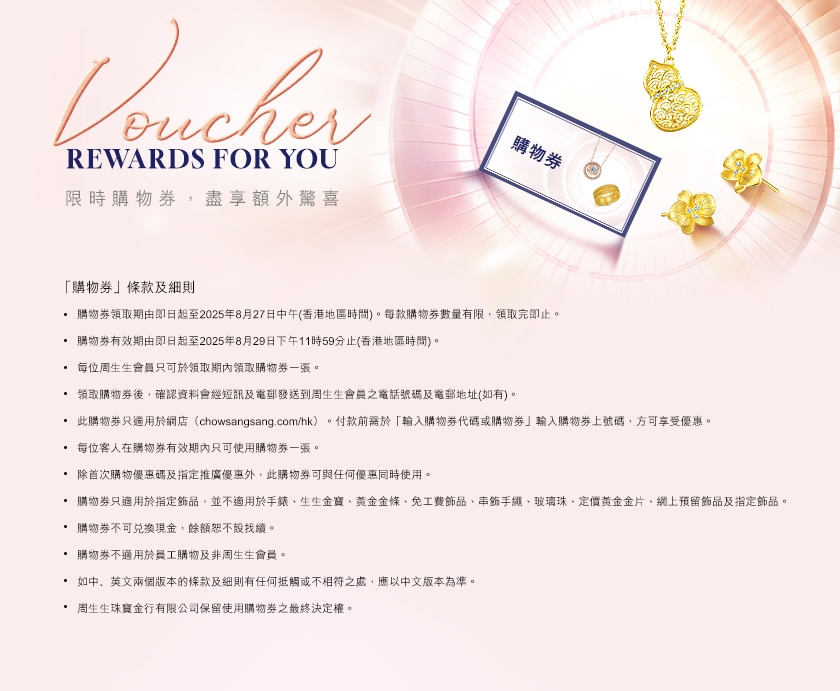 周生生網店推出快閃搶券活動,讓您以更優惠價錢購買一系列黃金飾品如龍鳳手鐲、黃金串飾、黃金頸鍊、黃金手鍊等,並多款18K白金、玫瑰金及鑽石飾品等。立即登入網站搶券。