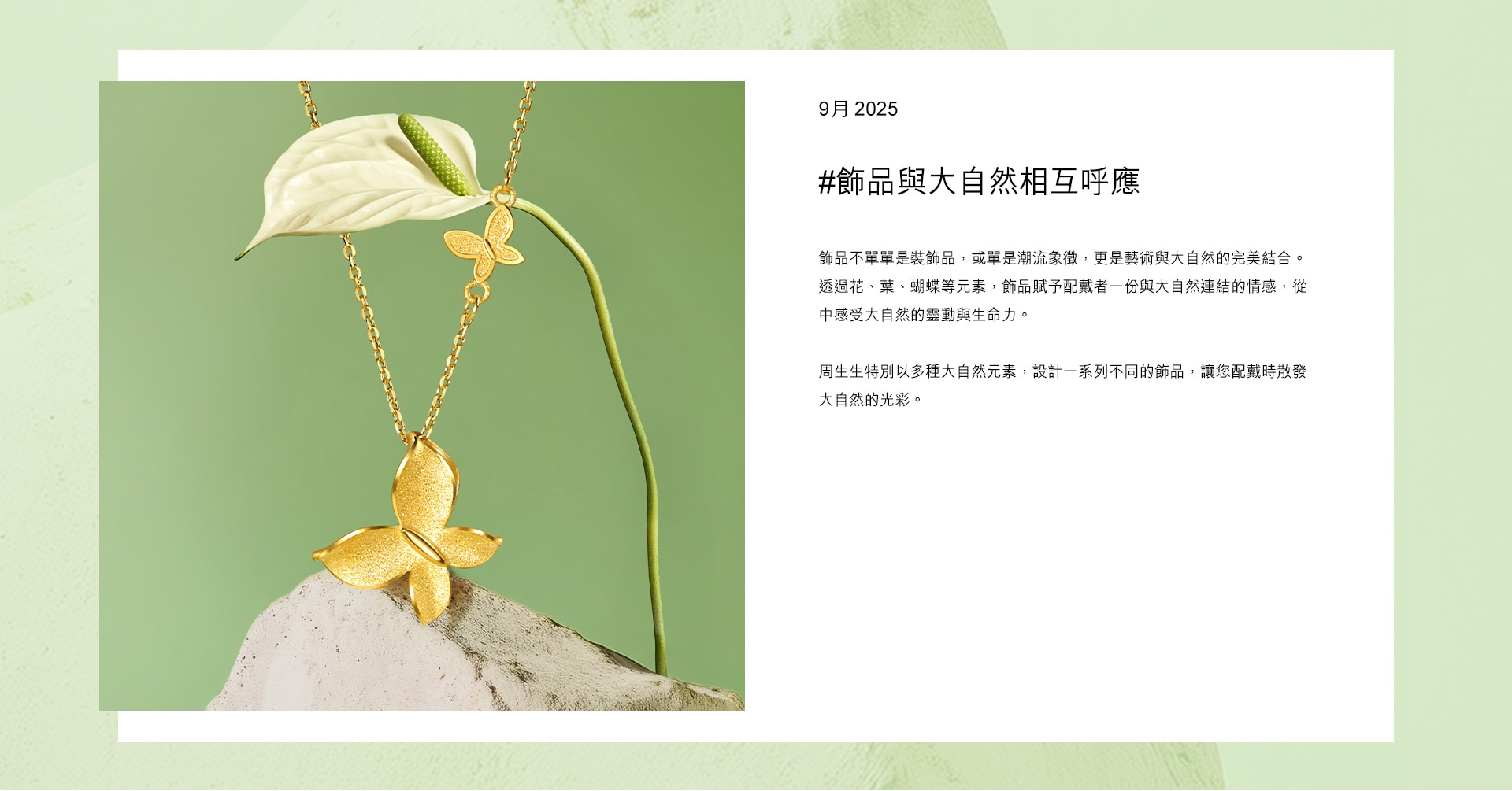 周生生特別以多種大自然元素,設計一系列不同的飾品,讓您配戴時散發大自然的光彩。