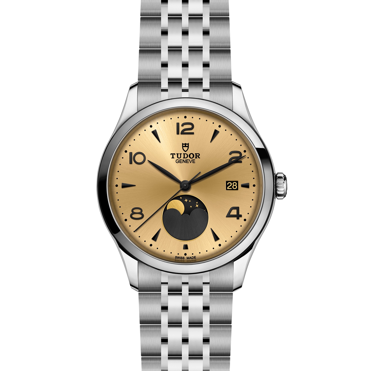 香檳色錶面,飾以太陽放射紋,配立體鐘點標記及月相指示